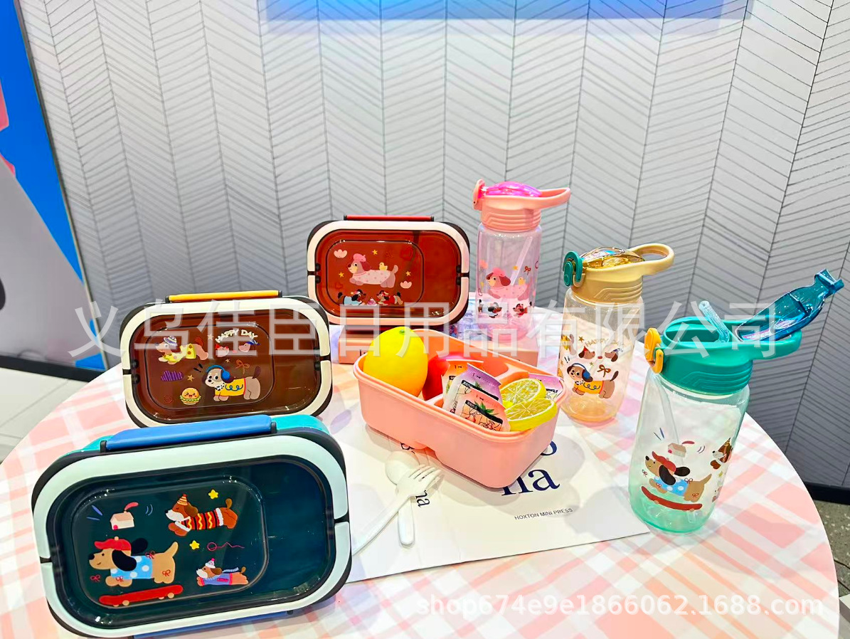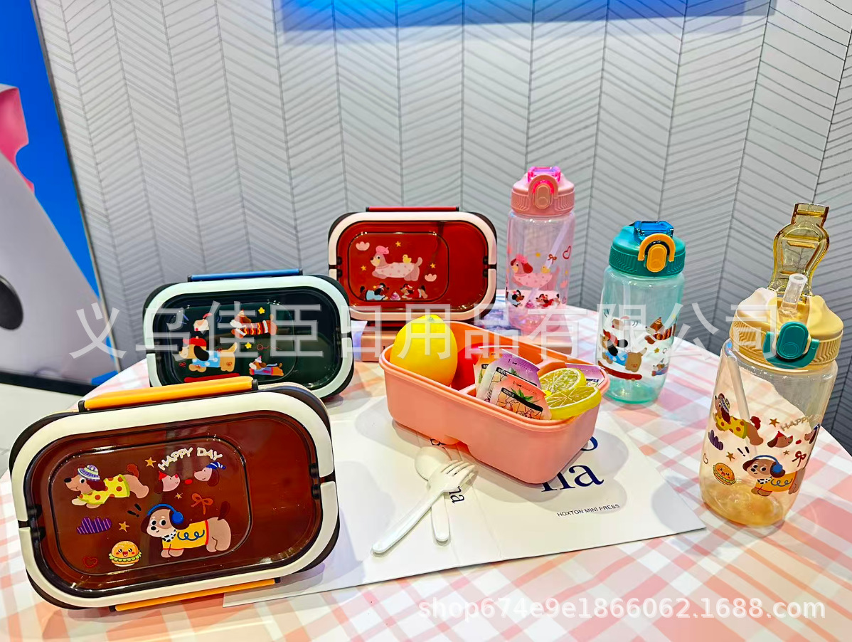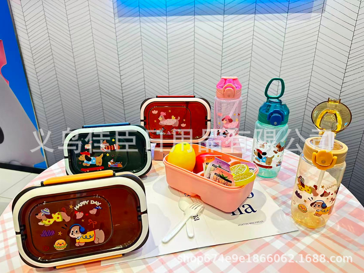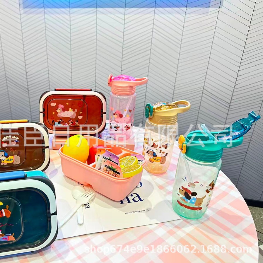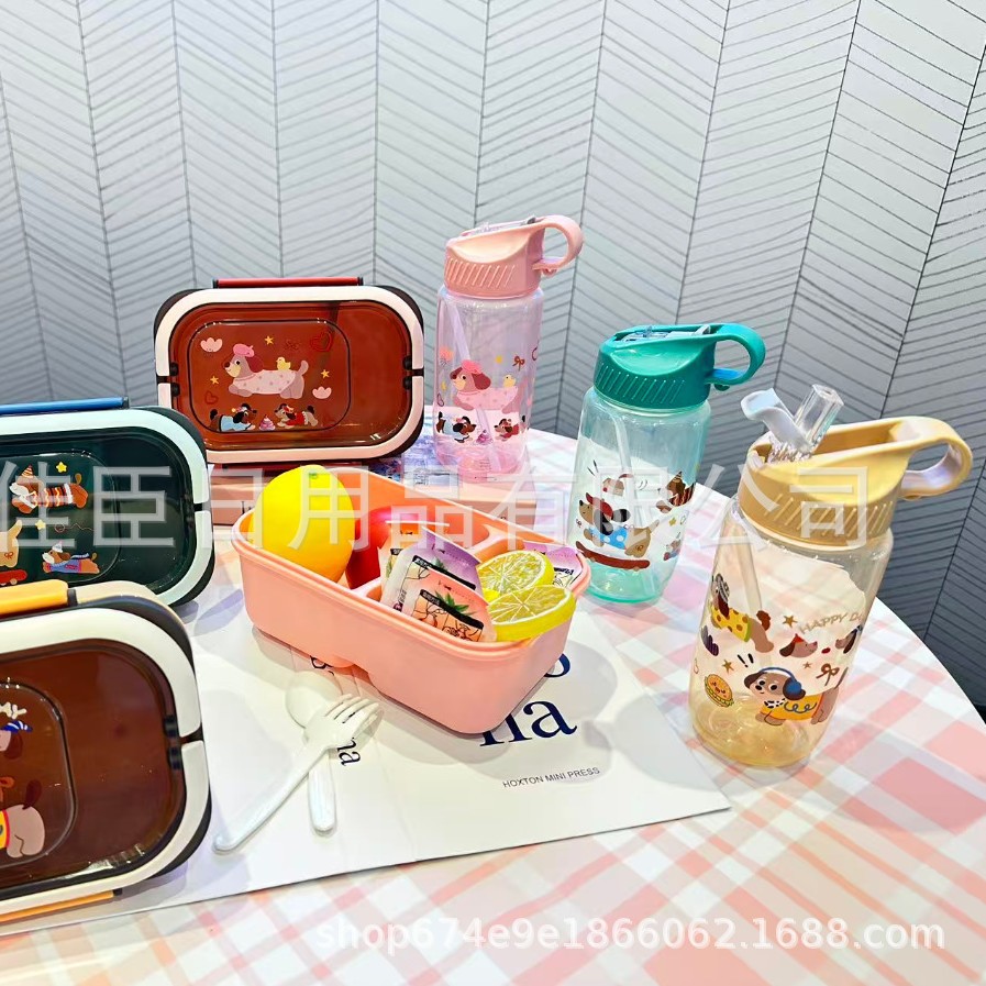网红腊肠小狗水壶饭盒套装塑料饭盒学生儿童便当带餐具带饭午餐盒