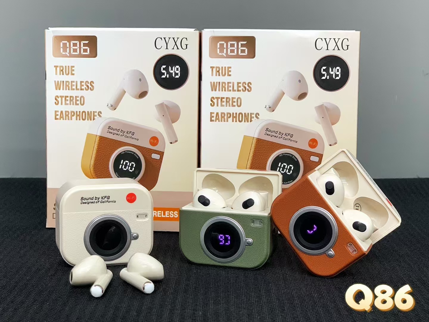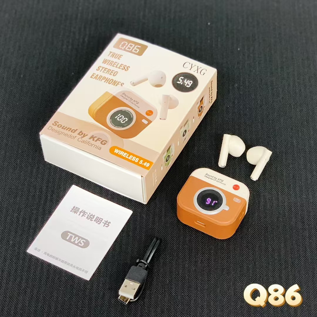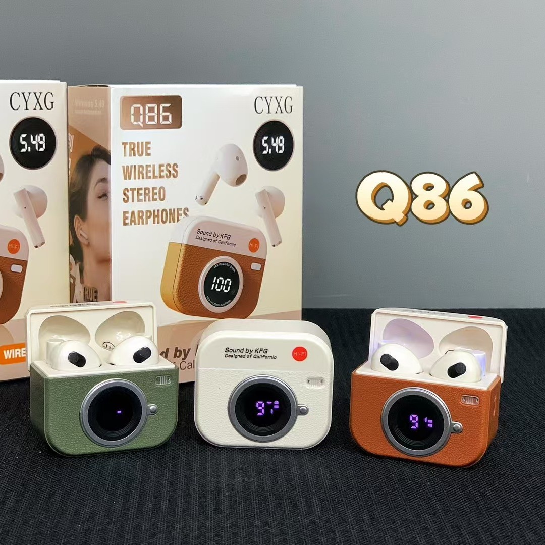 Q86 跨境热销款复古相机半入耳式降噪长续航高清音质电量数显耳机
