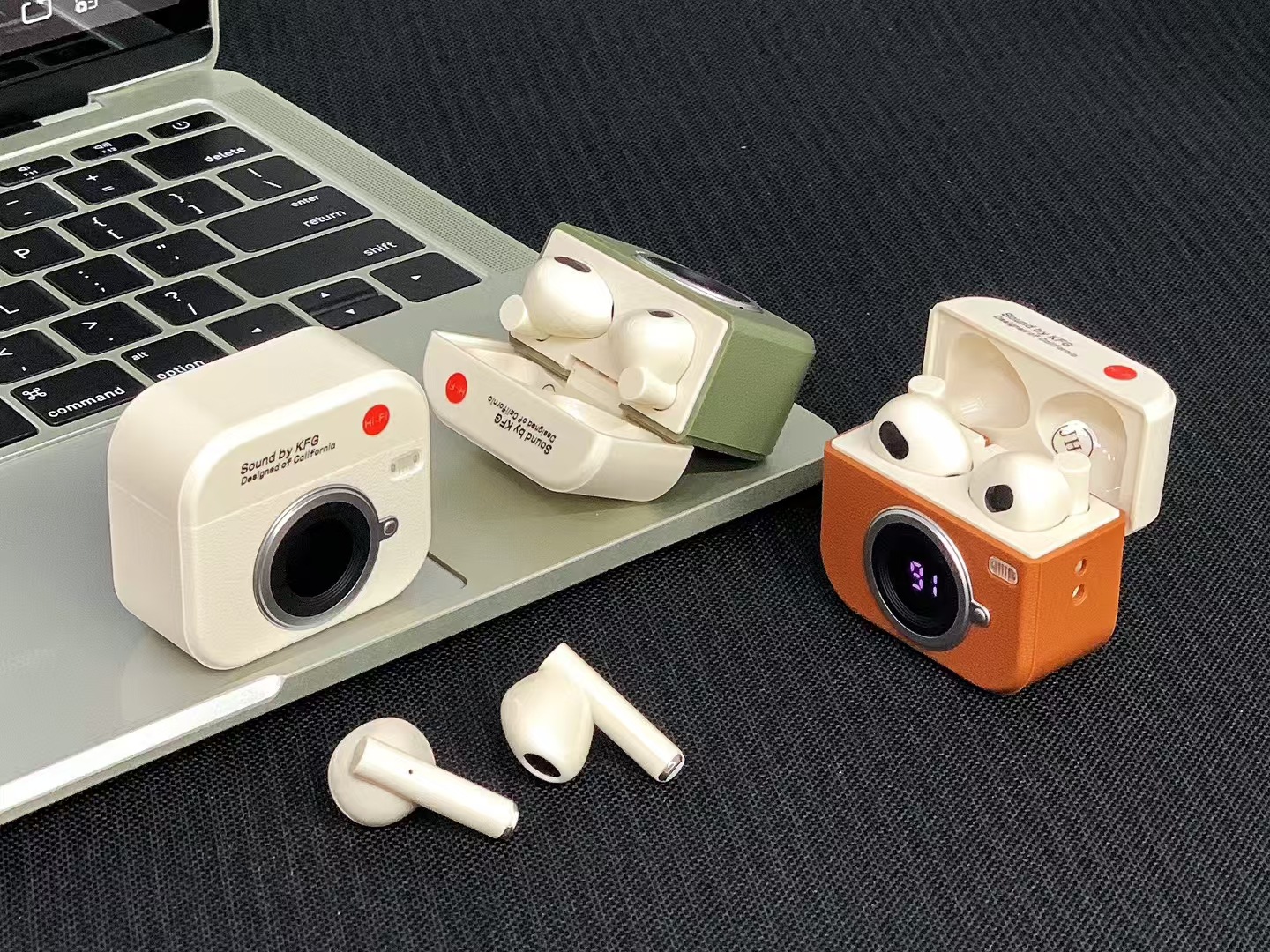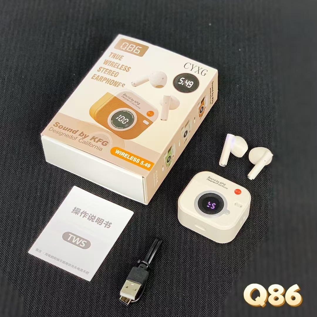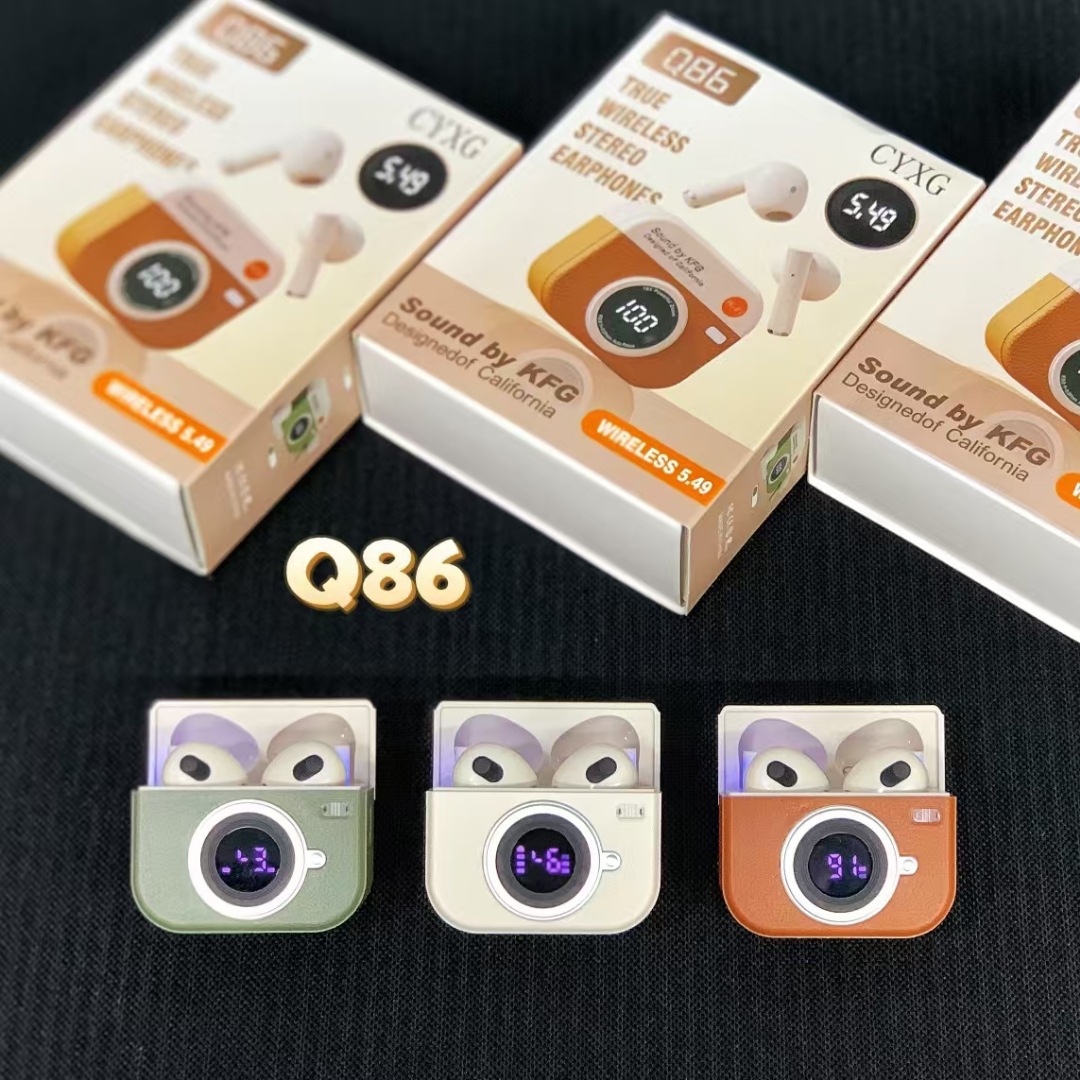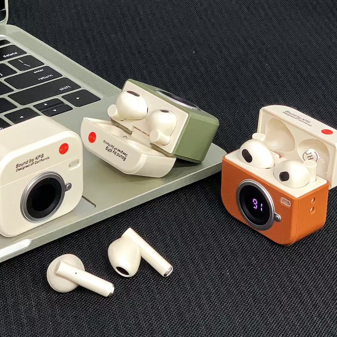 Q86 跨境热销款复古相机半入耳式降噪长续航高清音质电量数显耳机