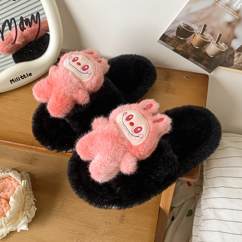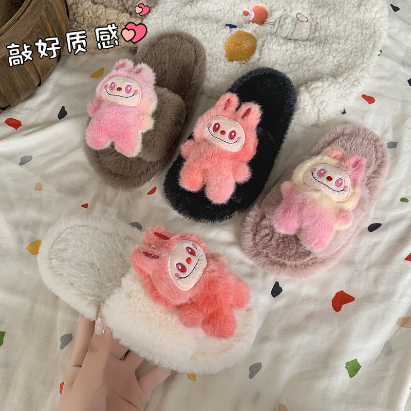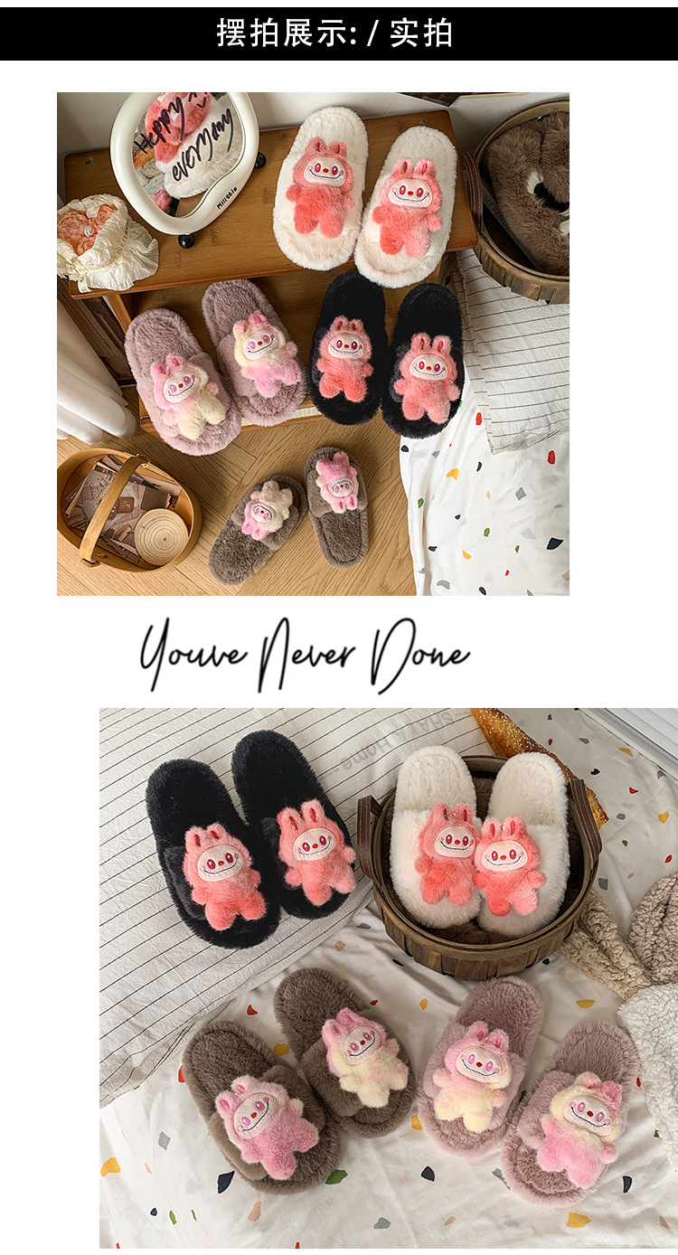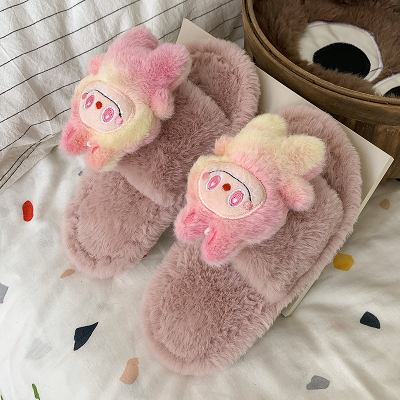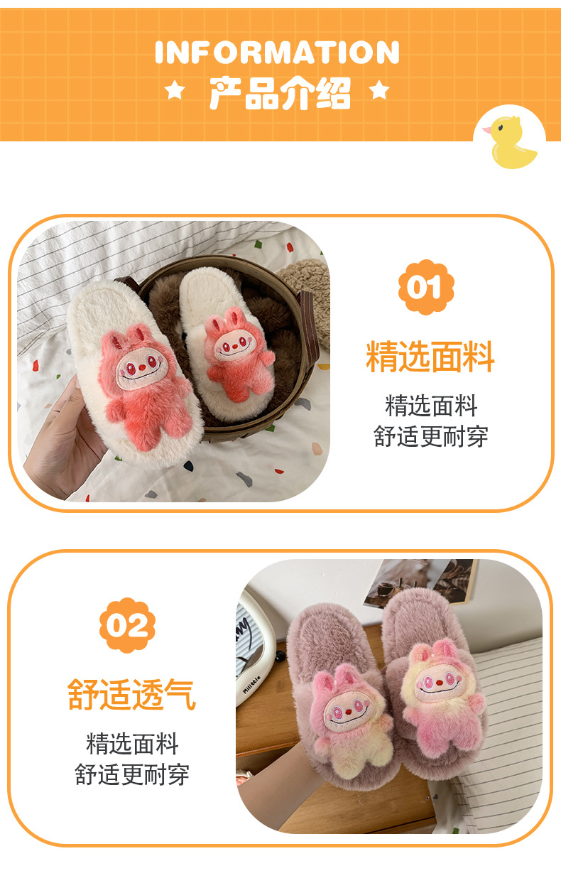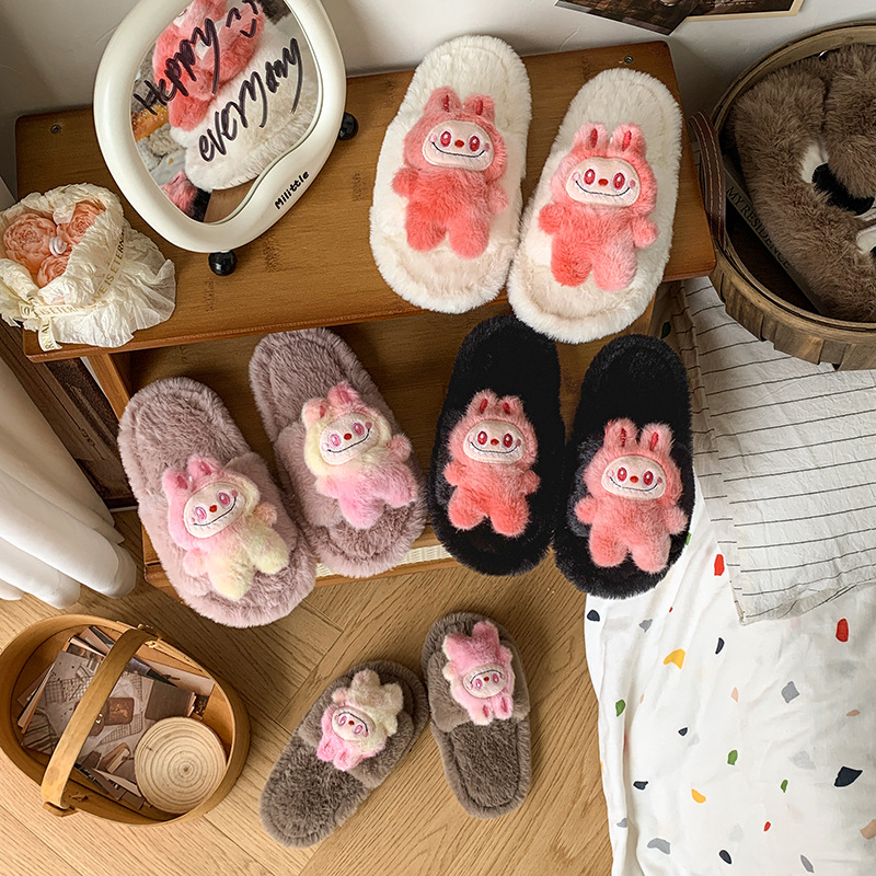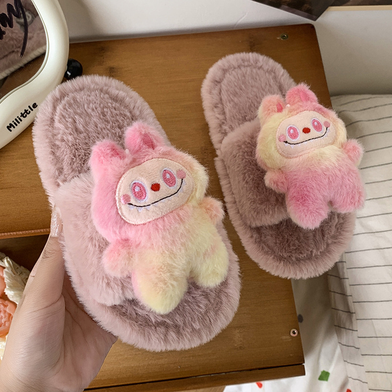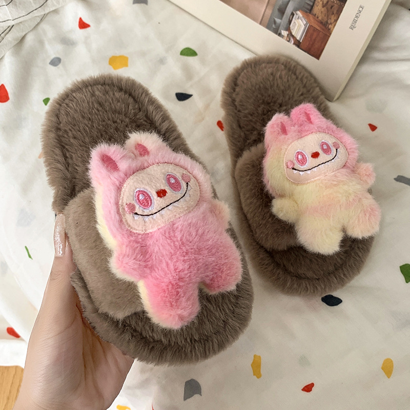 跨境亚马逊新款男女儿童拉布布一字室内居家毛毛拖鞋可爱公仔棉拖