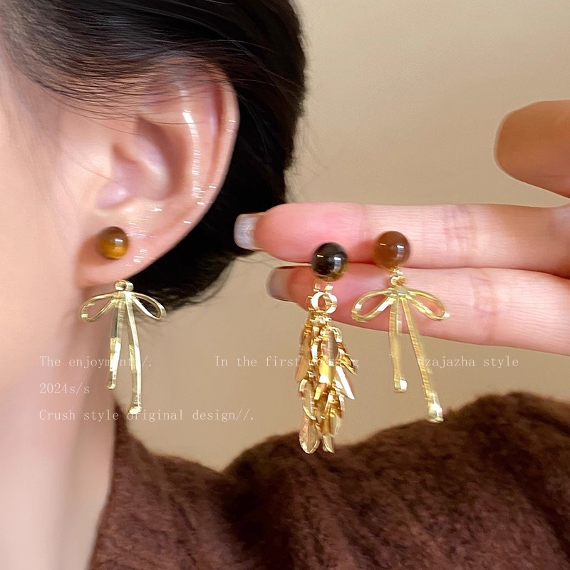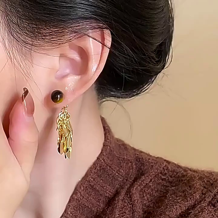 耳环饰品港风复古时尚气质虎眼石耳钉耳饰品冬款咖色美拉德耳环女