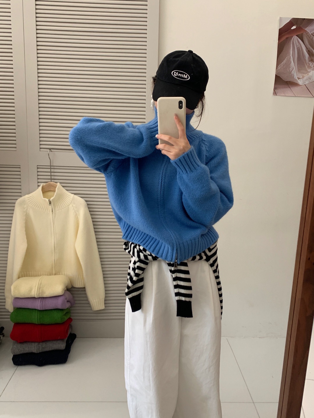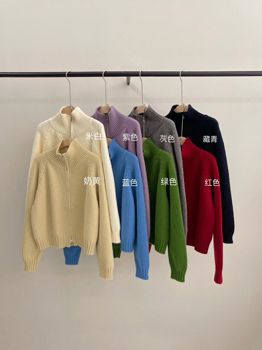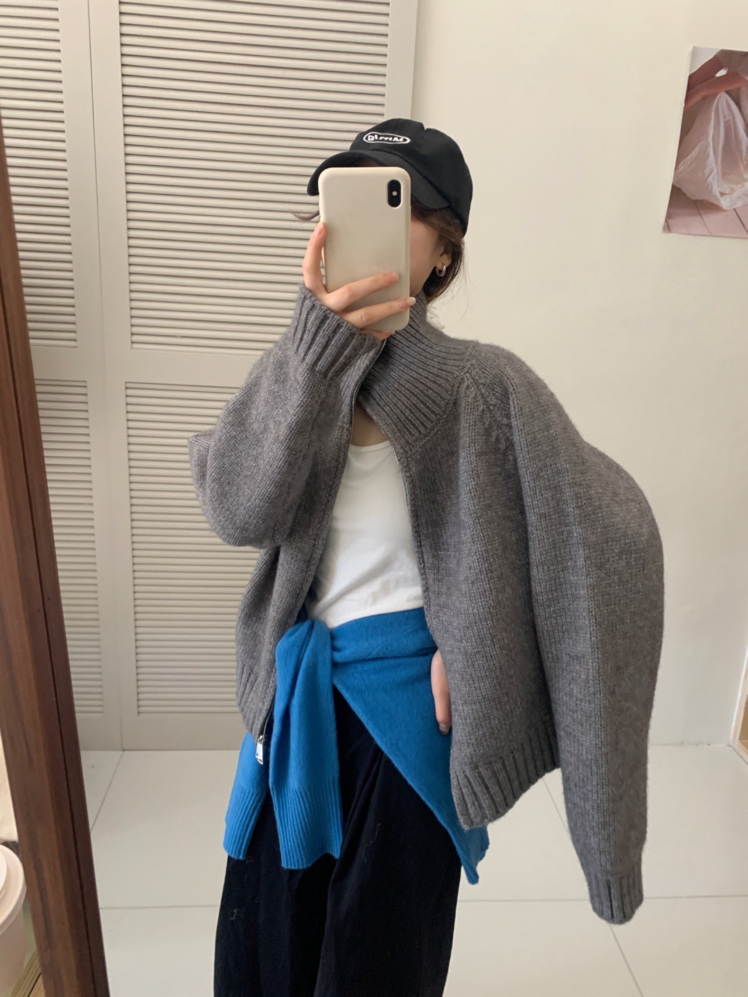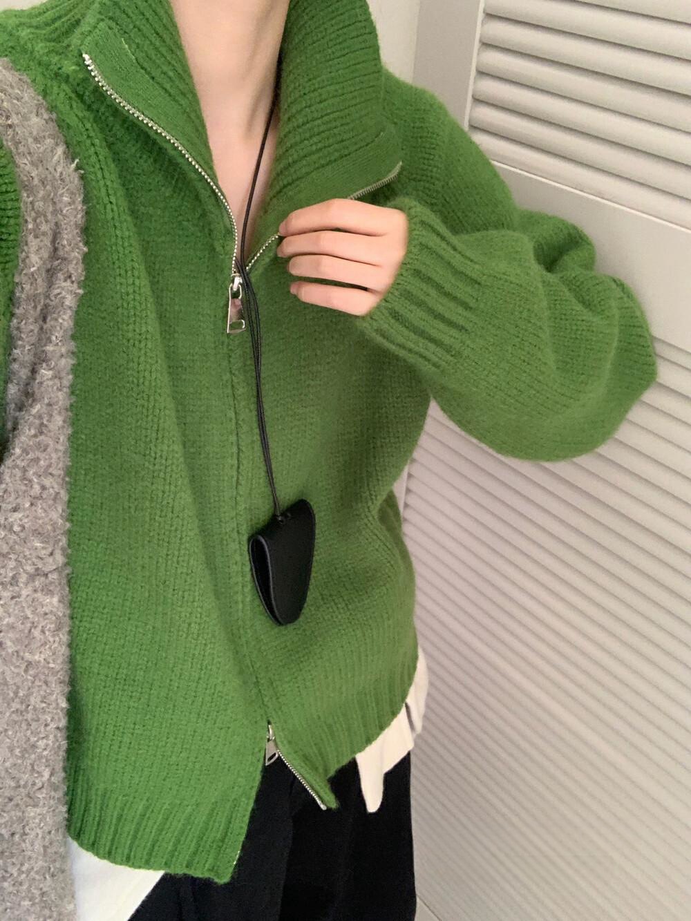 韩系简约立领拉链毛衣开衫女秋冬新款慵懒风宽松洋气短款针织外套