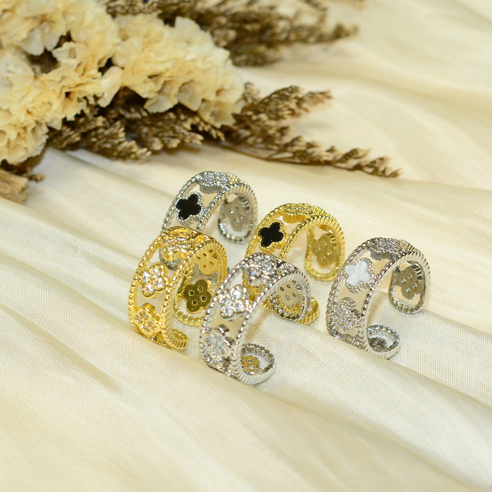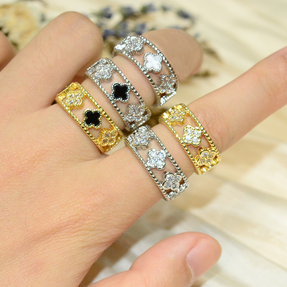 欧美时尚铜镀金四叶草戒指直播热卖镂空设计精致小众达人百搭指环