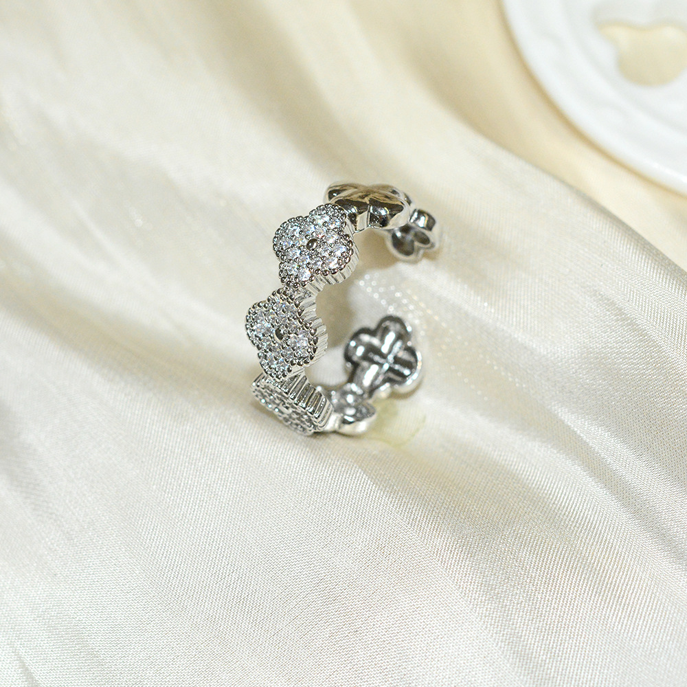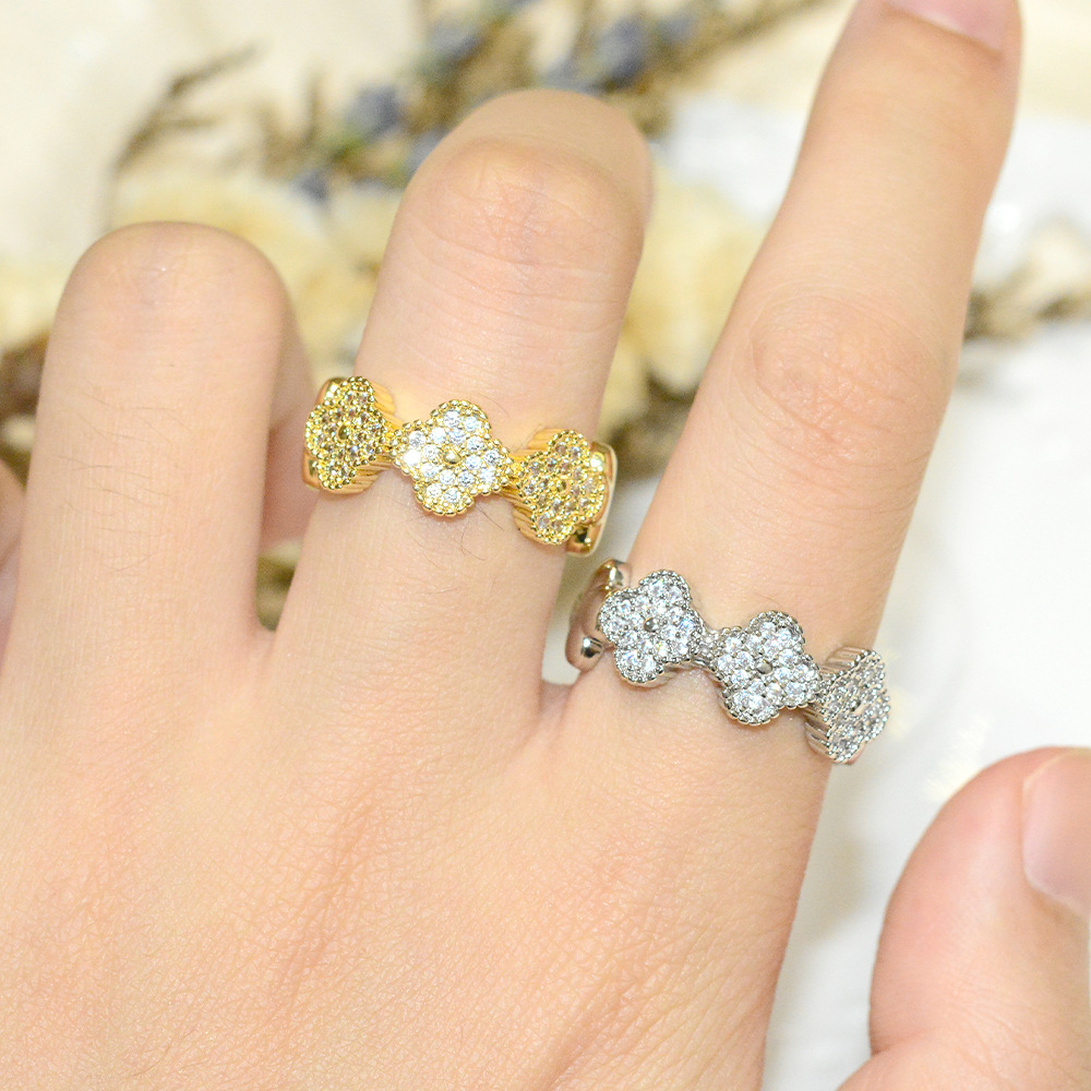 欧美跨境铜镶锆石四叶草戒指女轻奢高级感开口可调节小众花朵戒指