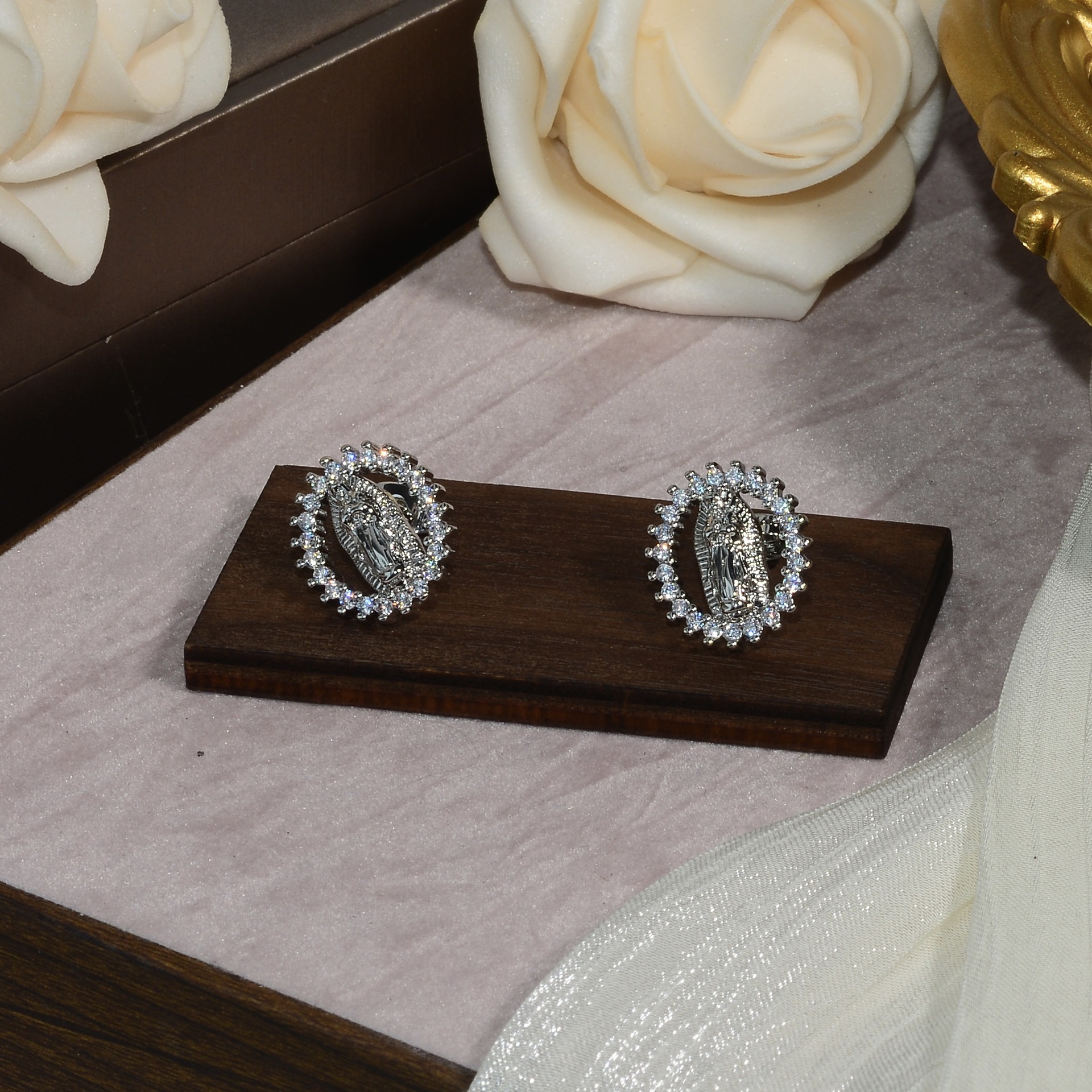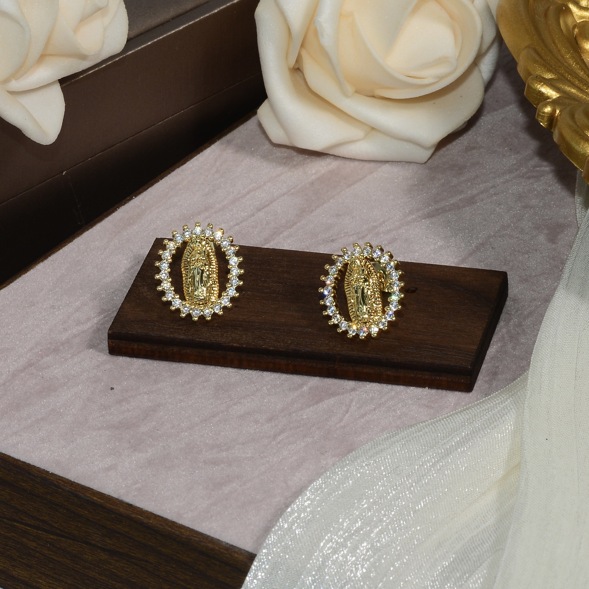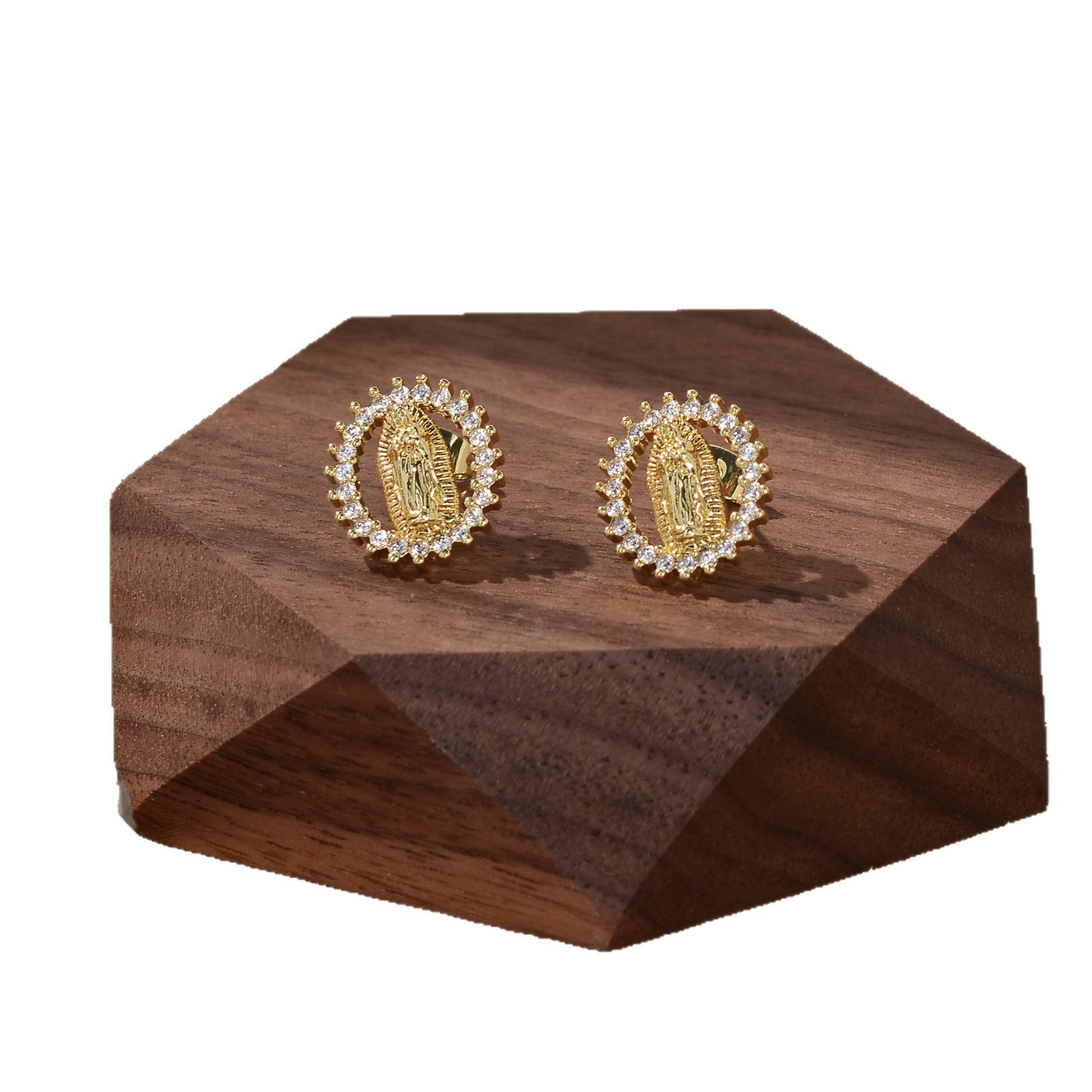 跨境热销个性宗教耳钉女铜镀金小众复古设计镶锆石圣母玛利亚耳饰