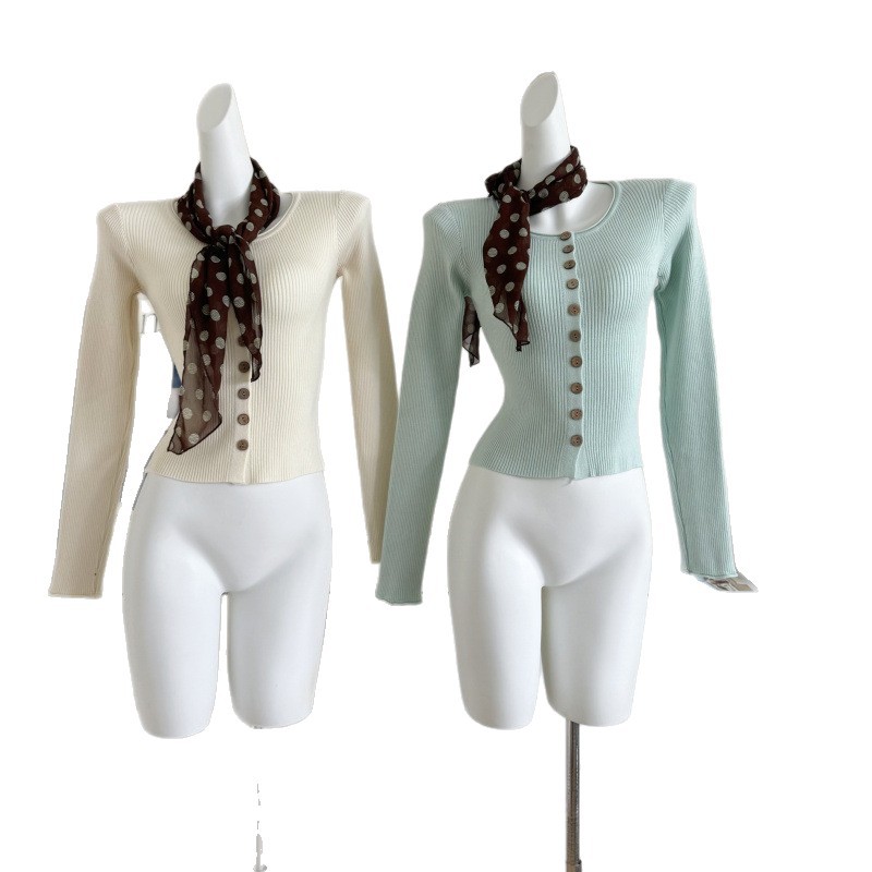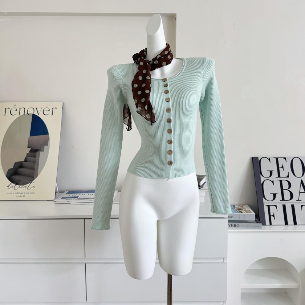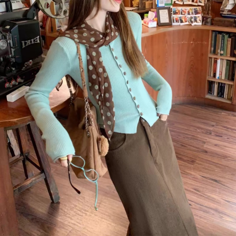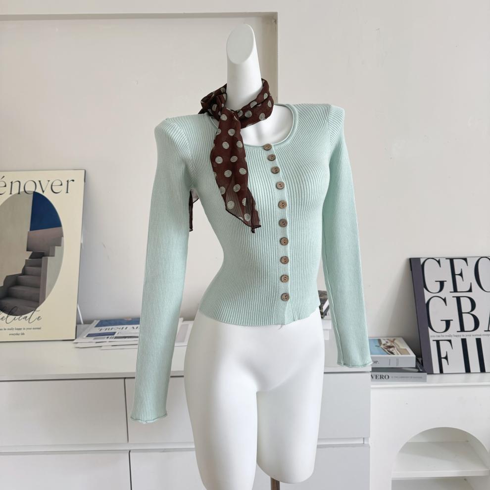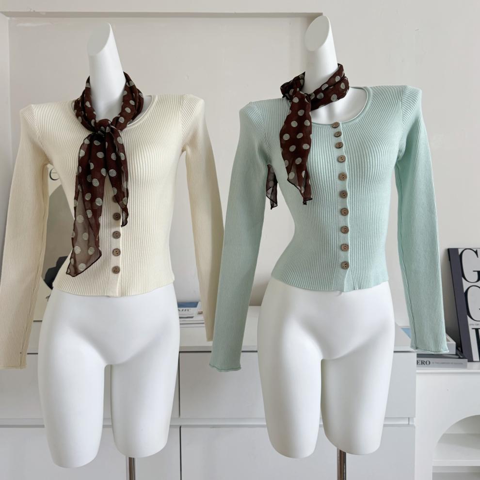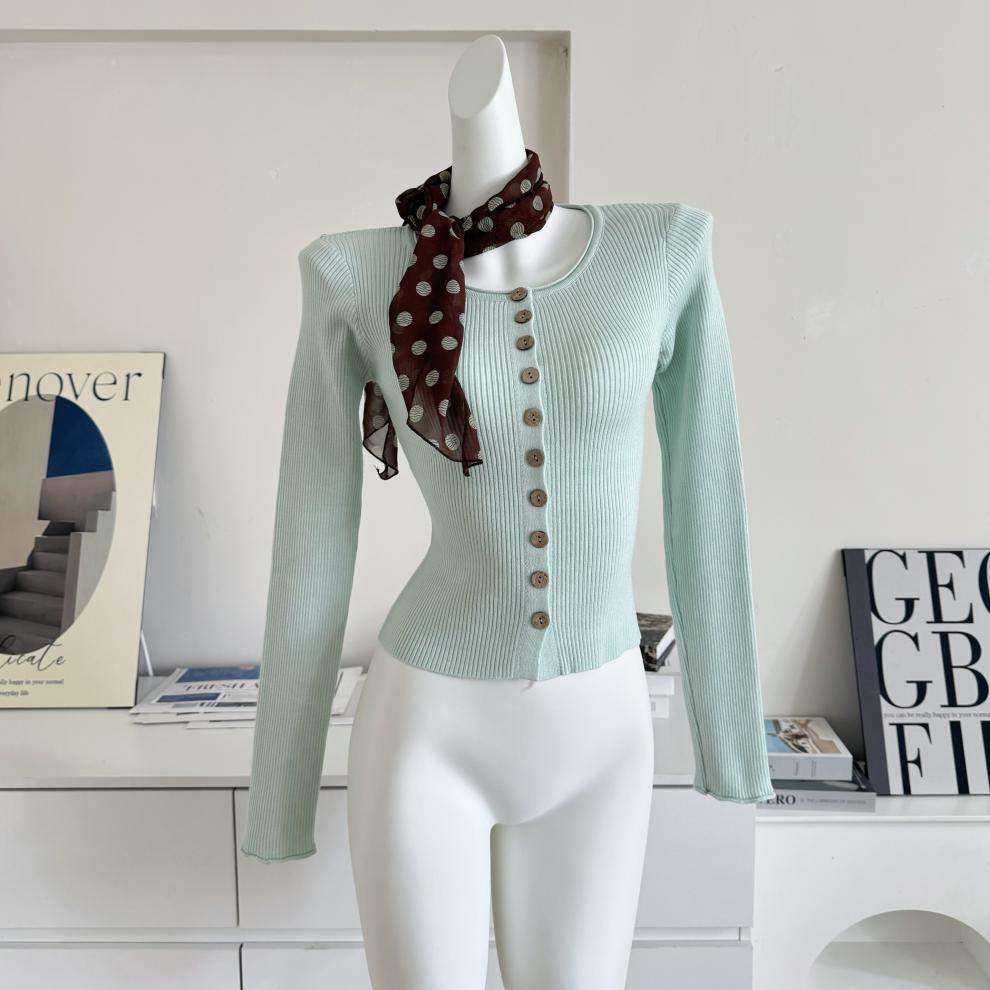 韩系绿色短款长袖针织衫女早秋修身薄款毛衣开衫单穿上衣