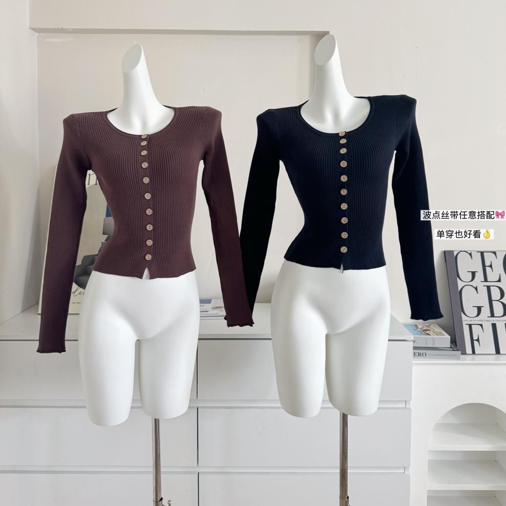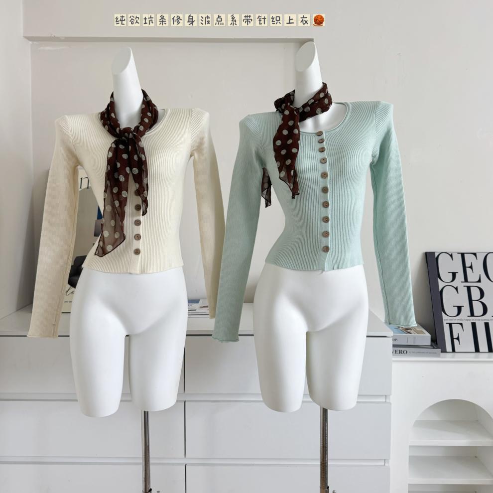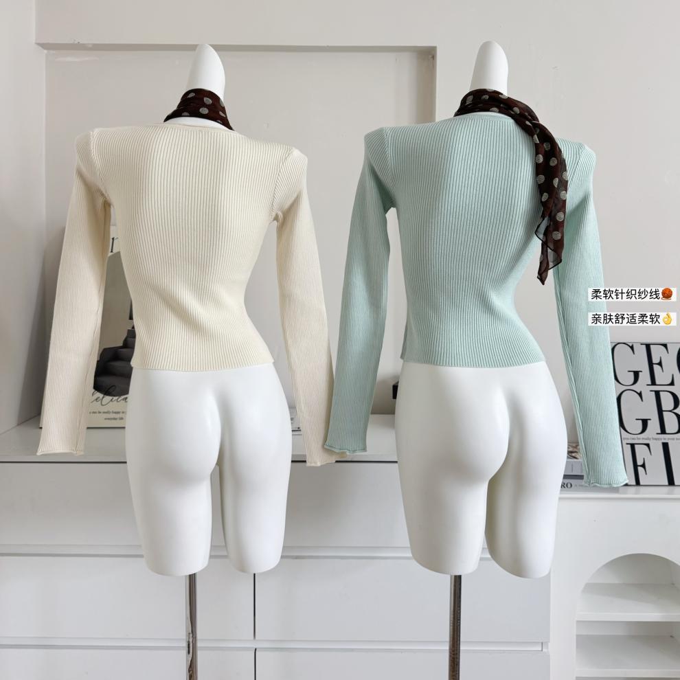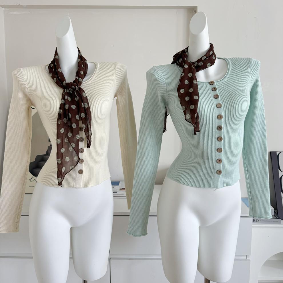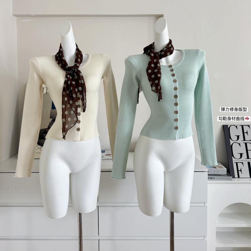 韩系绿色短款长袖针织衫女早秋修身薄款毛衣开衫单穿上衣