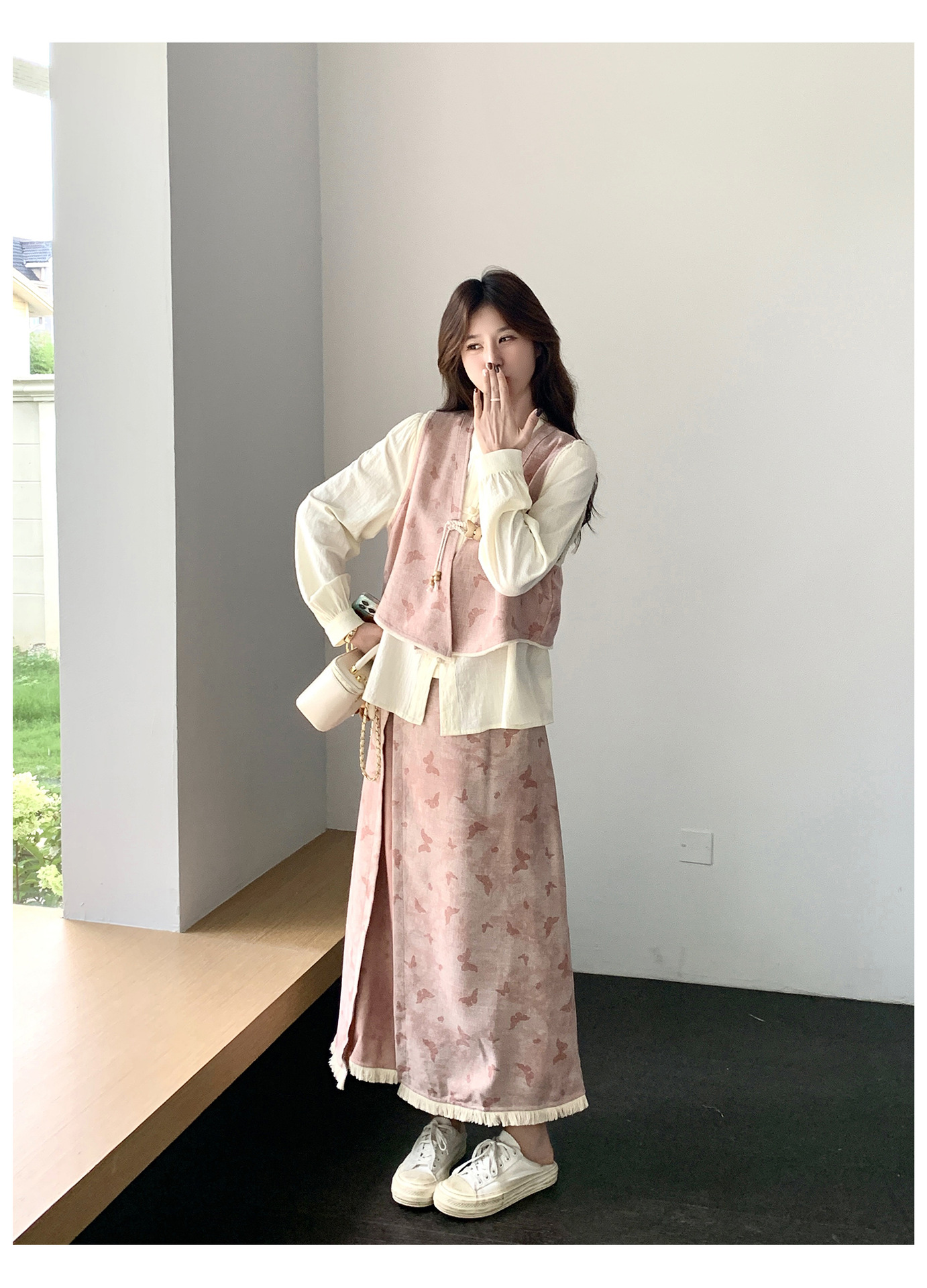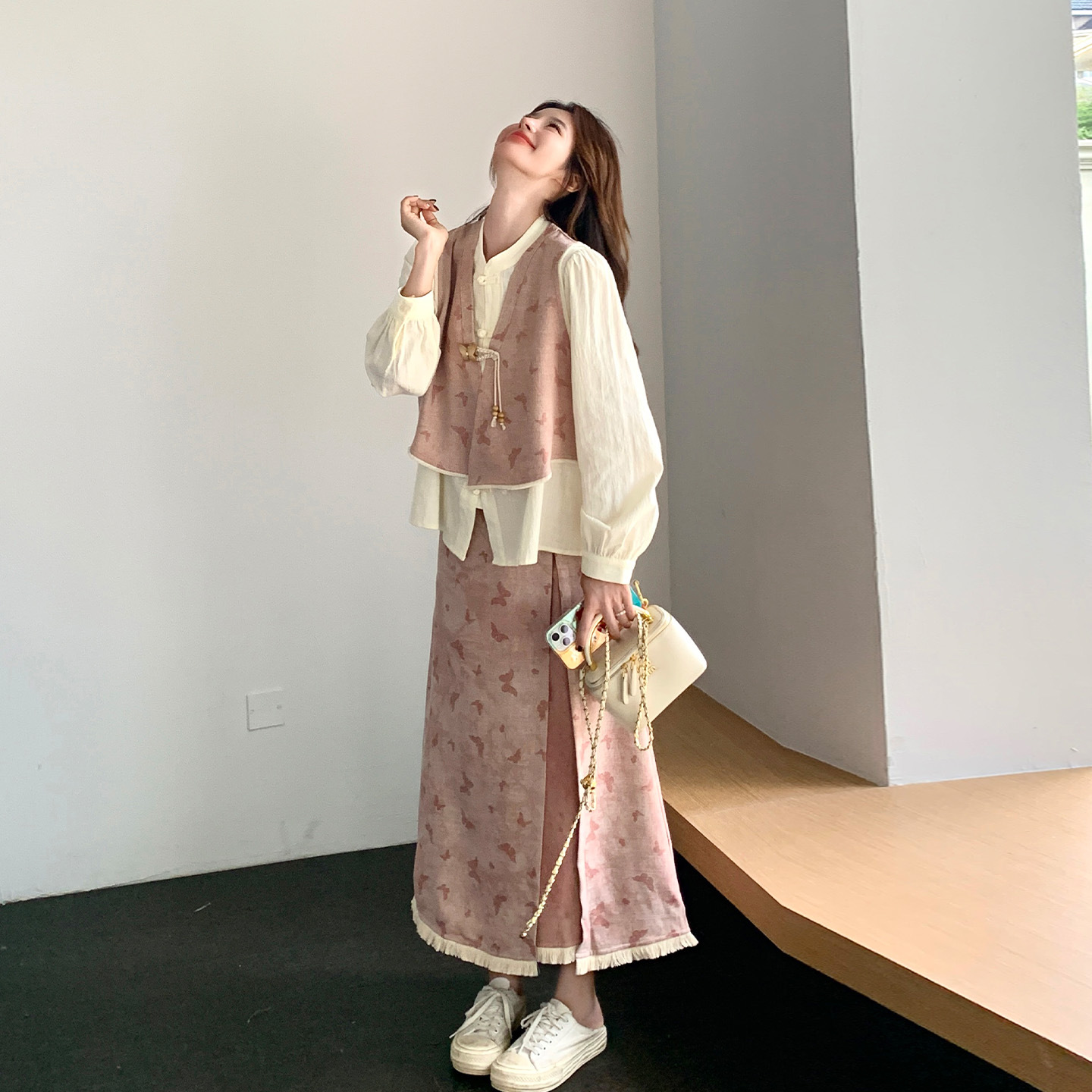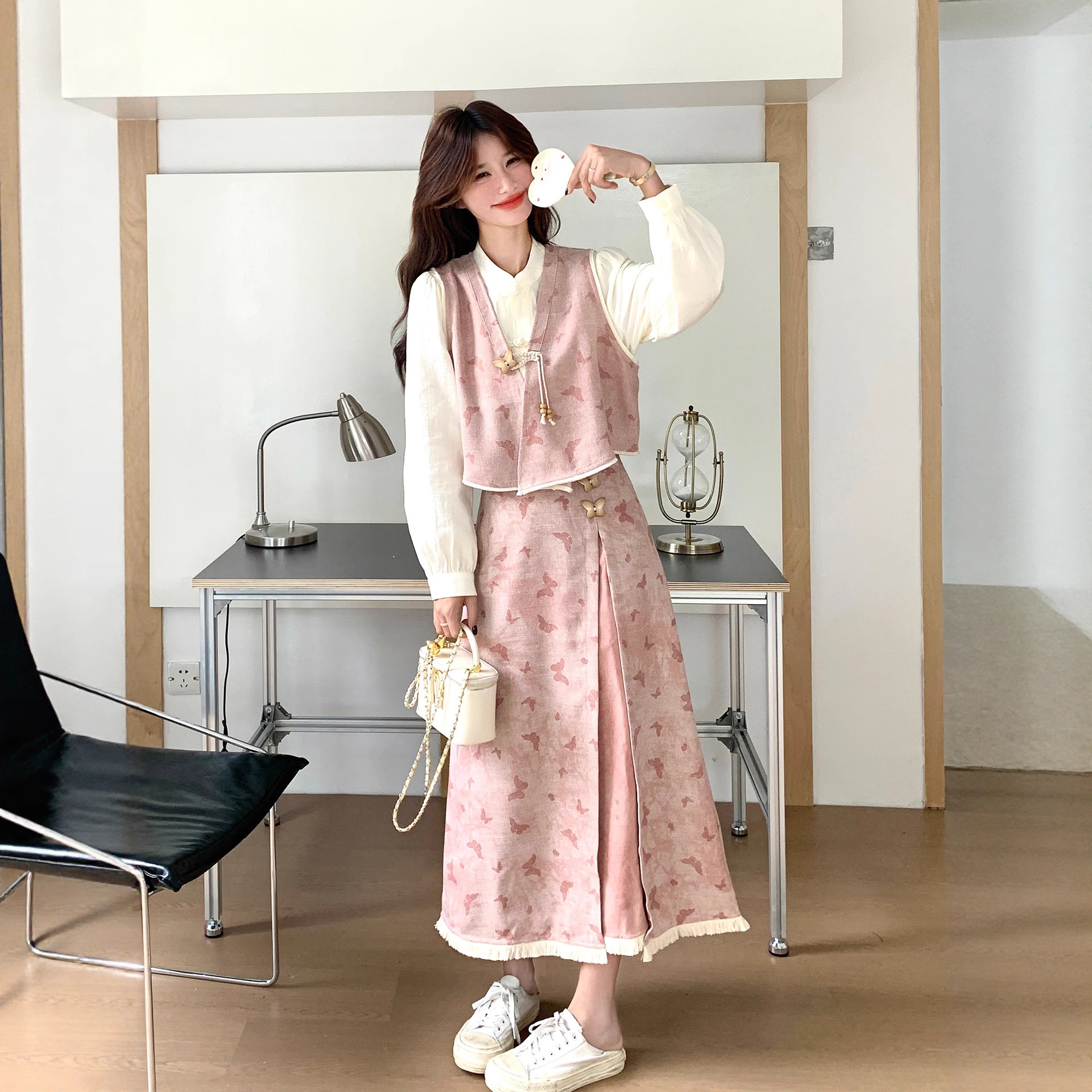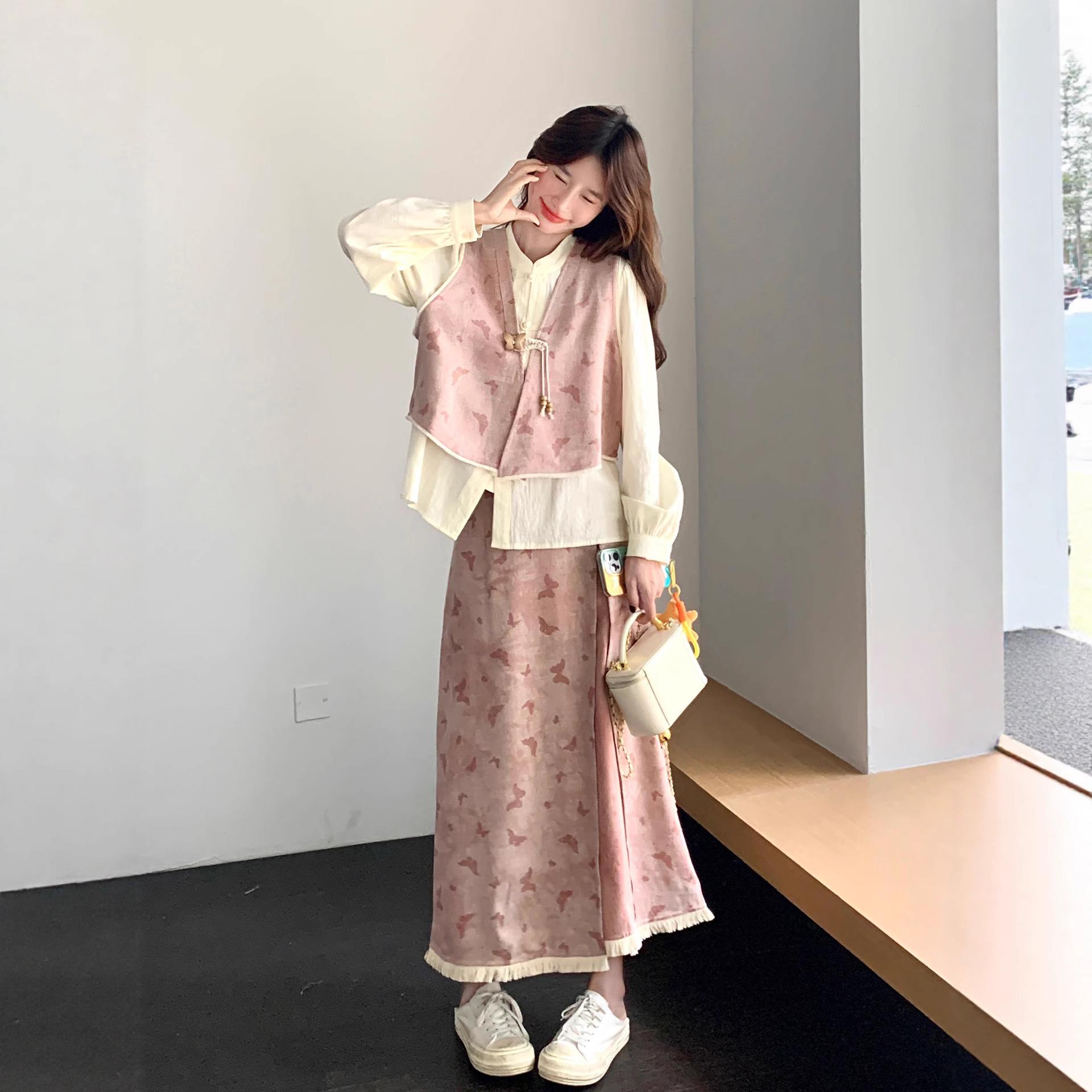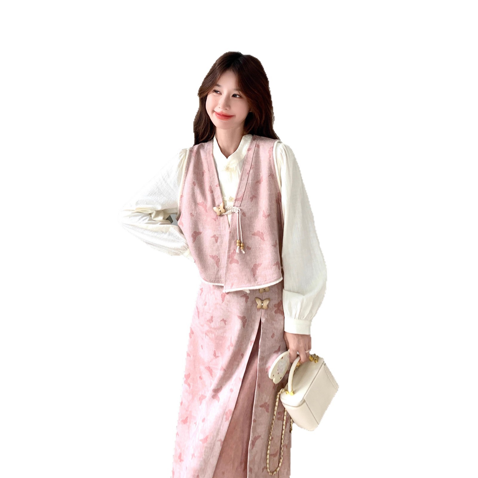 粉色新中式蝴蝶印花马甲套装裙女2025秋新款长袖衬衫半身裙三件套
