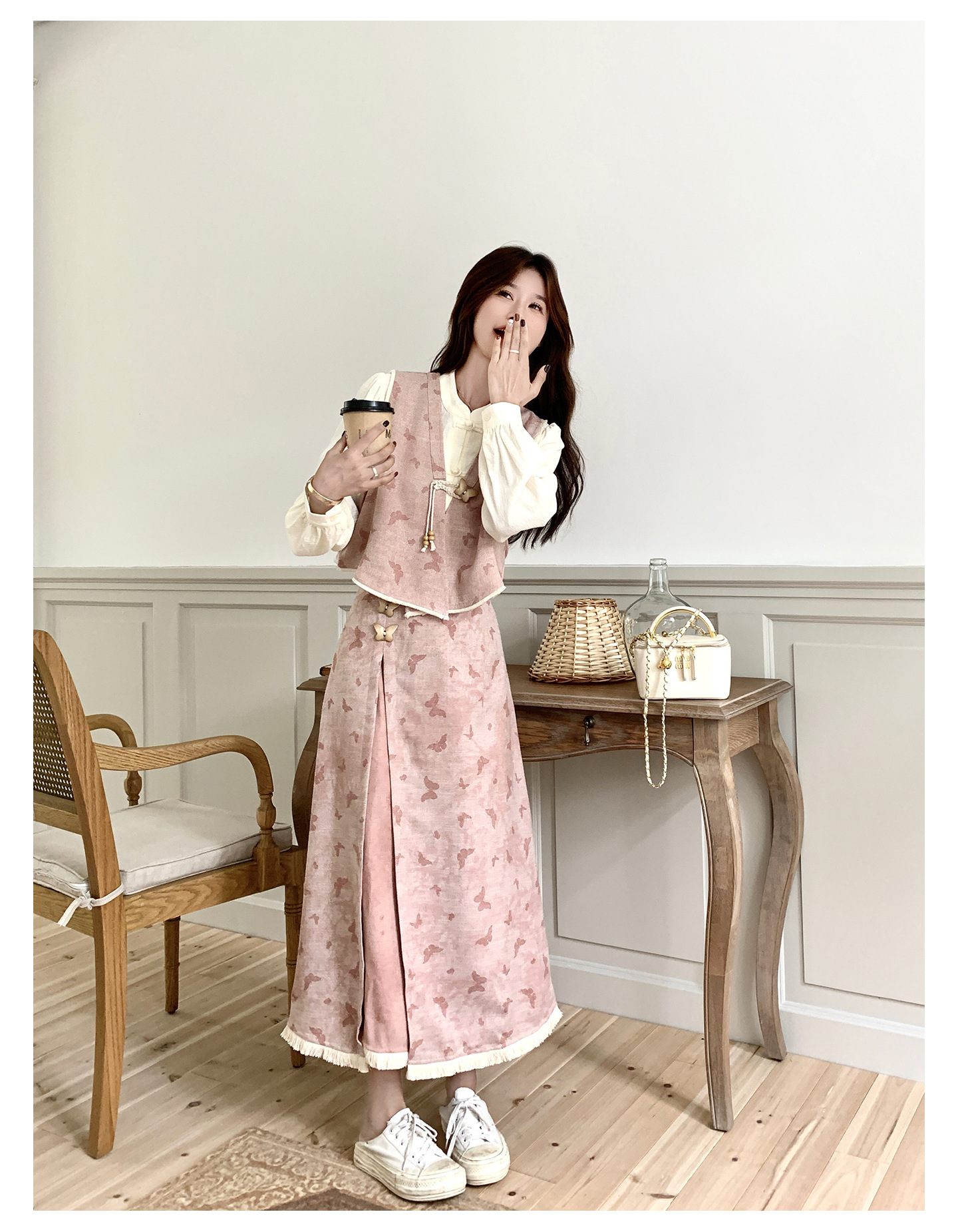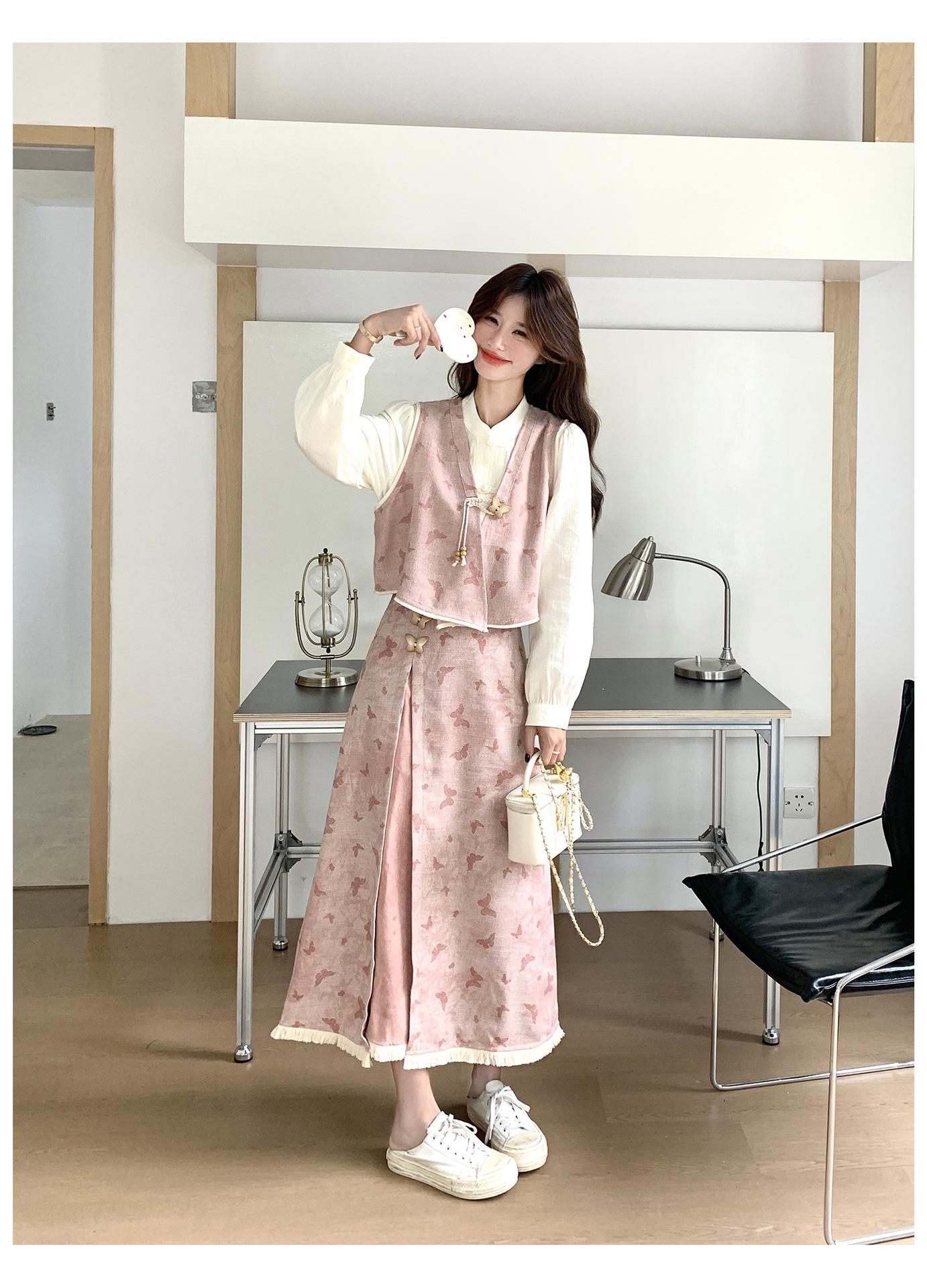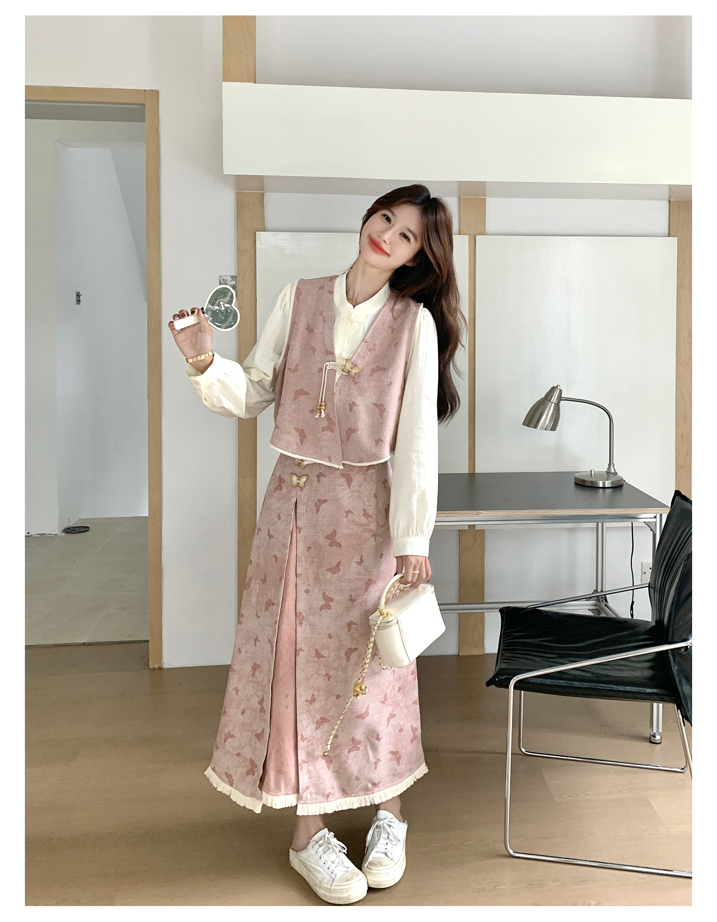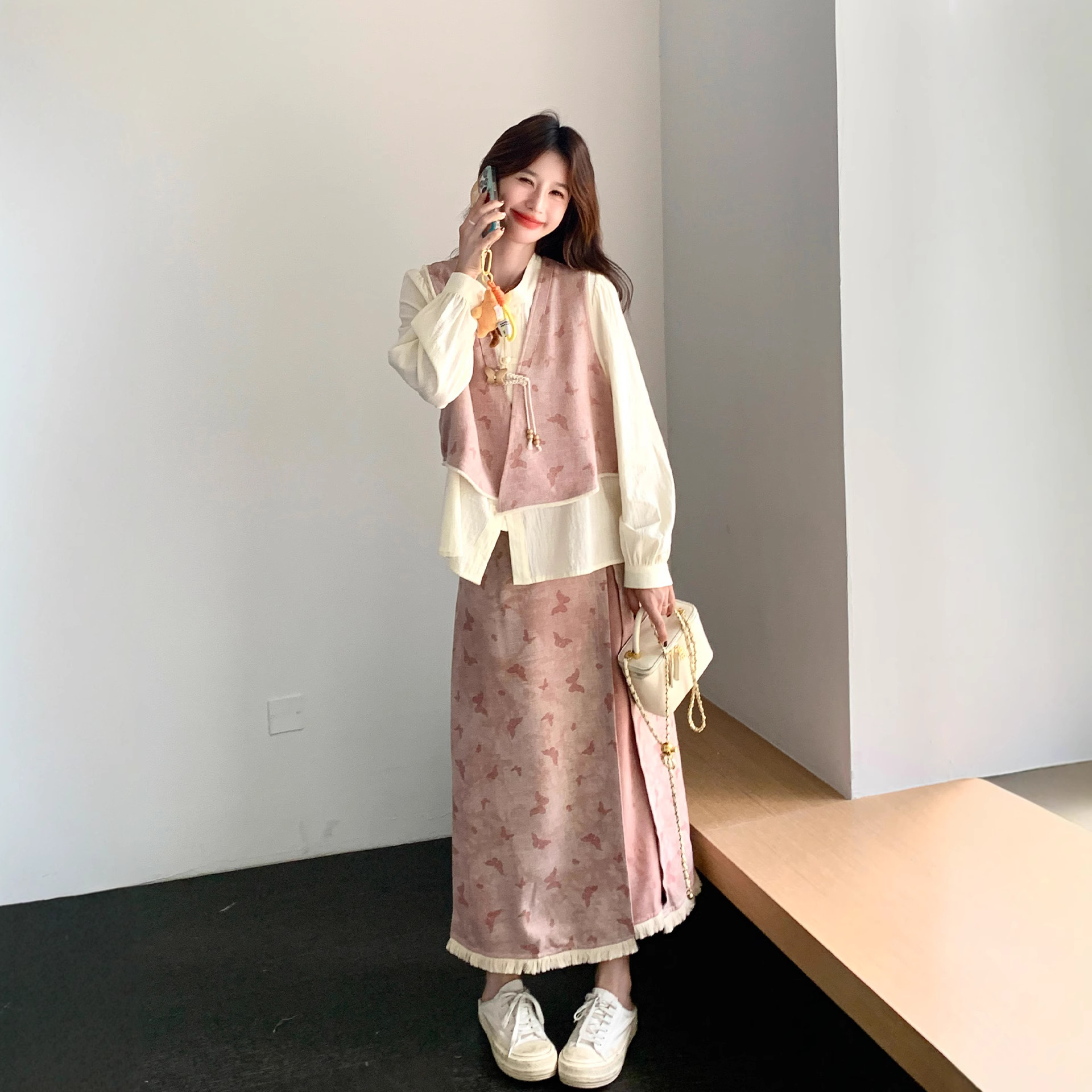 粉色新中式蝴蝶印花马甲套装裙女2025秋新款长袖衬衫半身裙三件套
