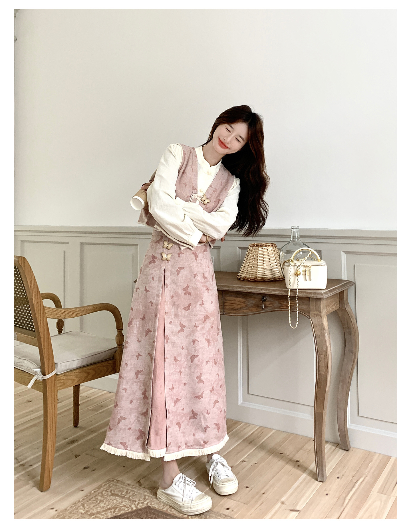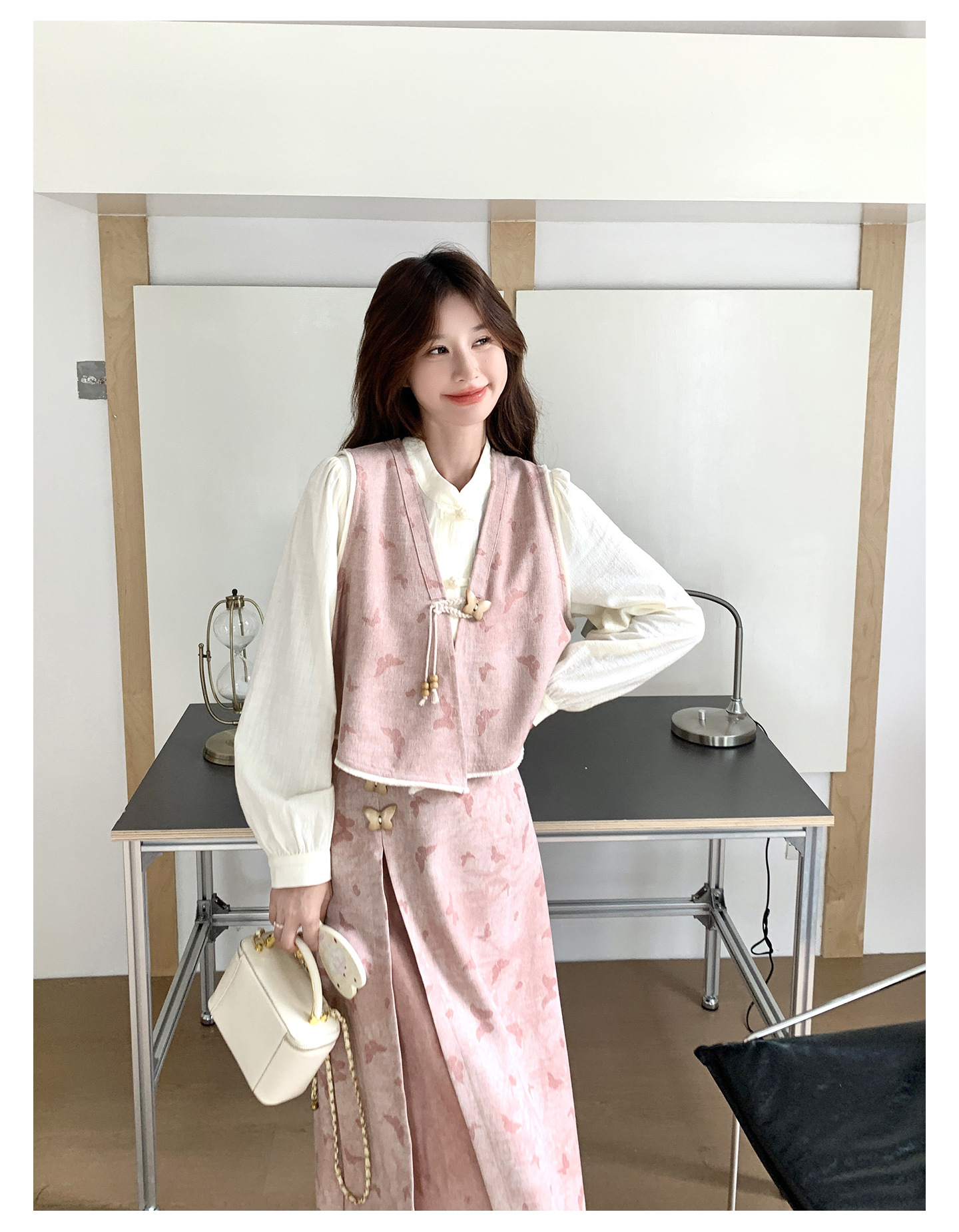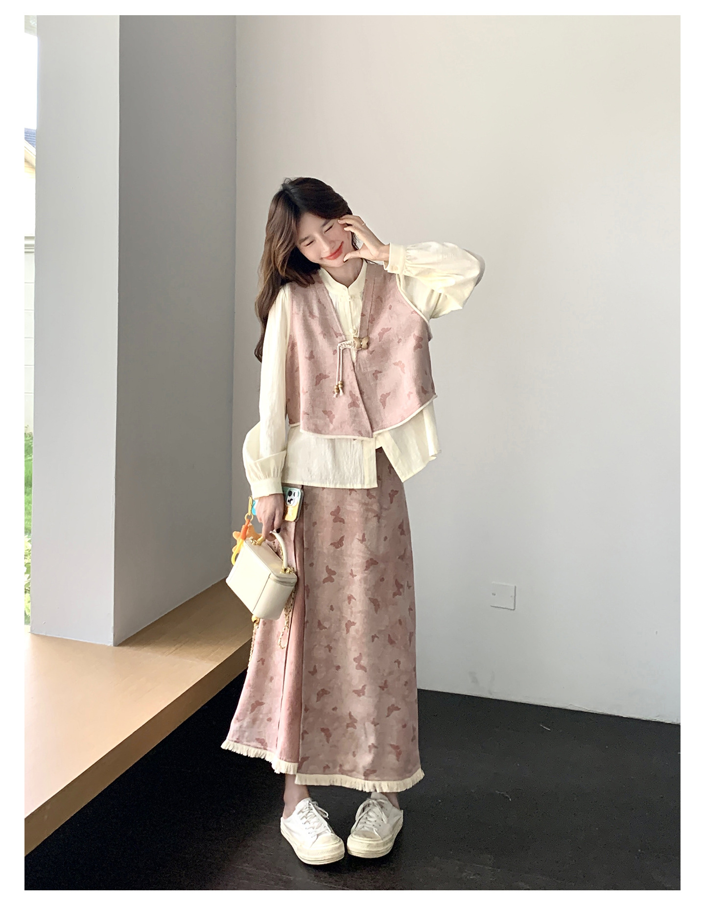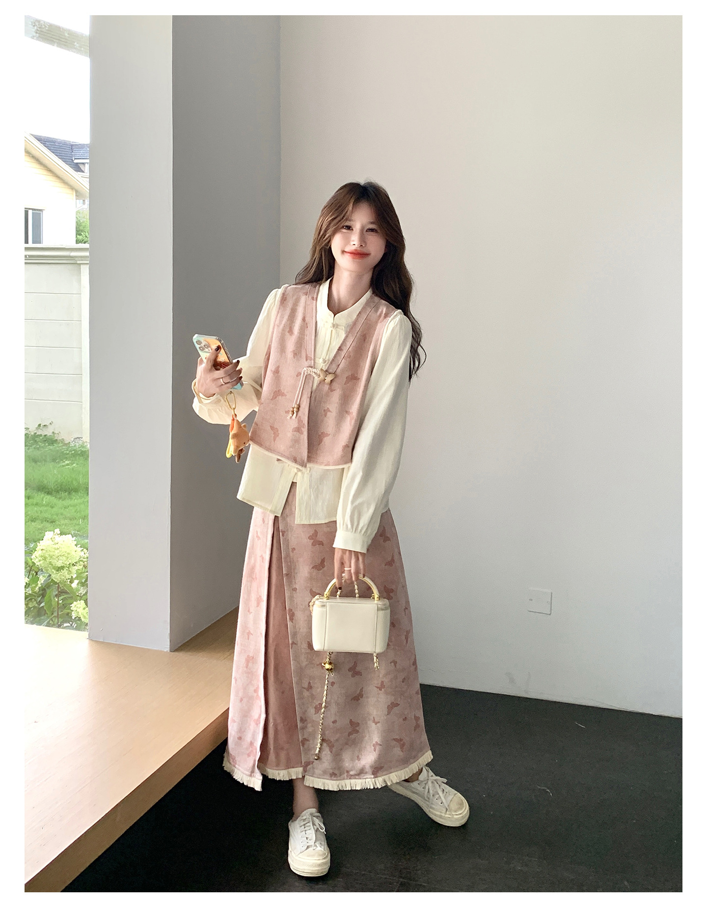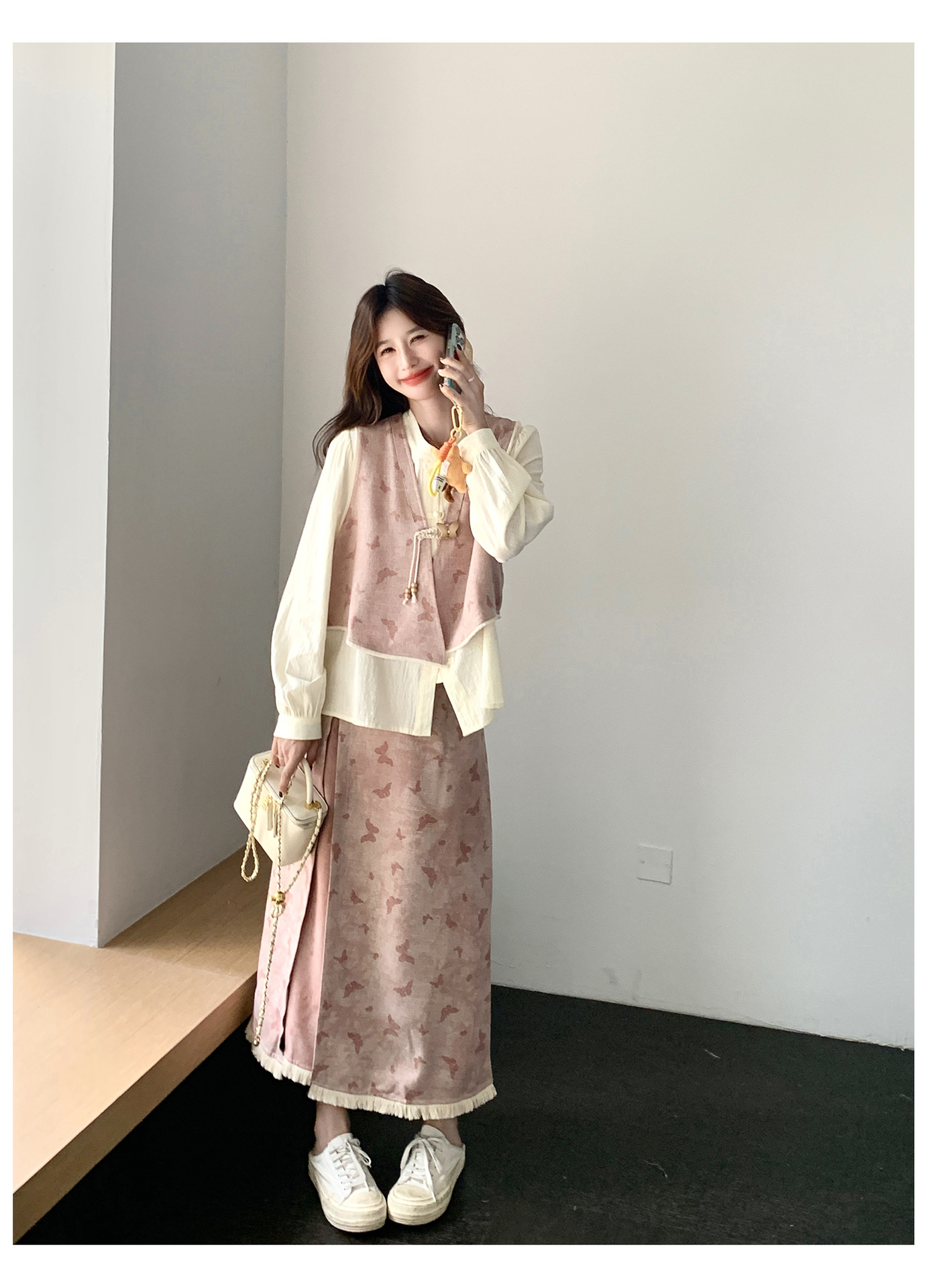 粉色新中式蝴蝶印花马甲套装裙女2025秋新款长袖衬衫半身裙三件套