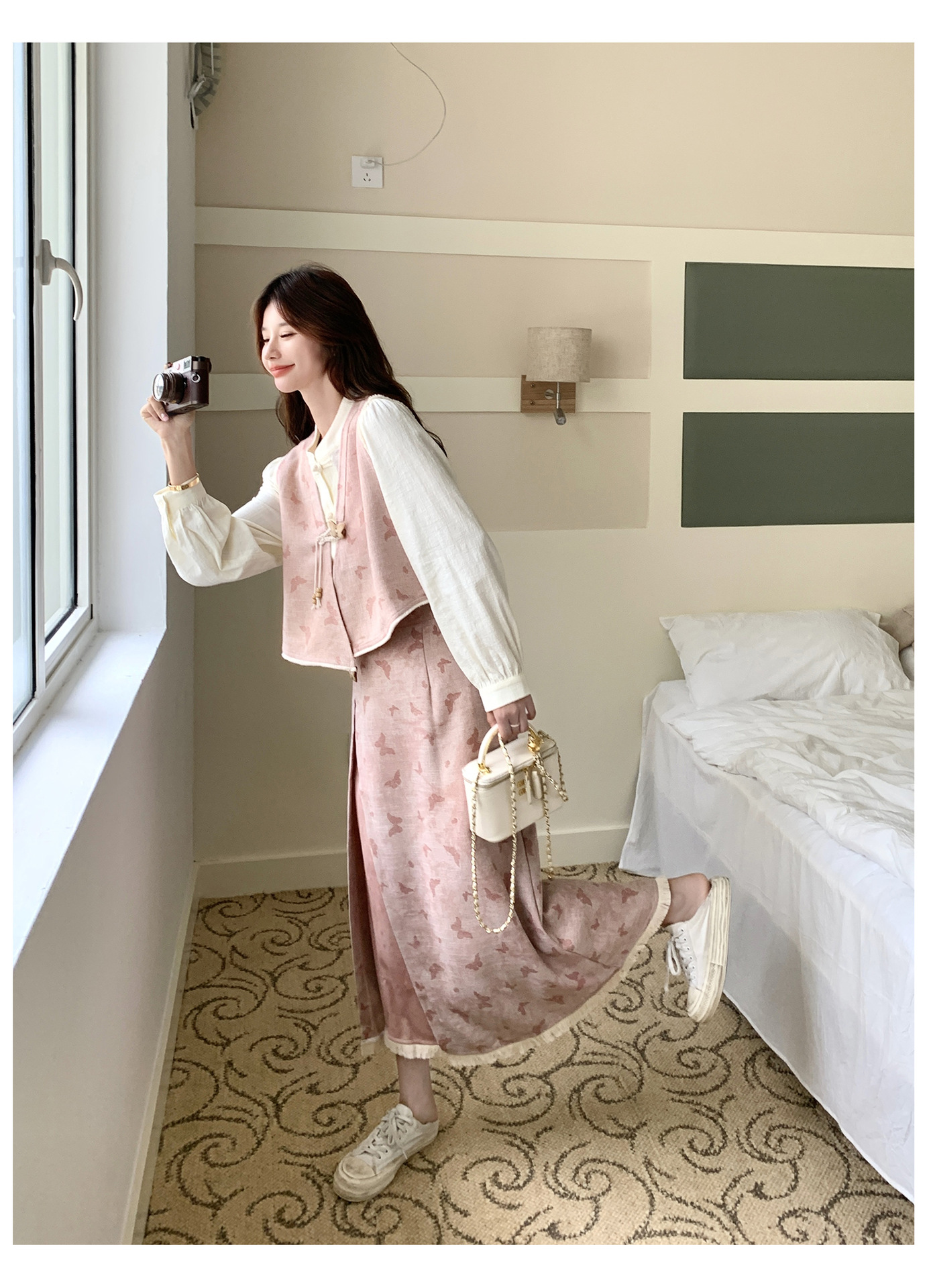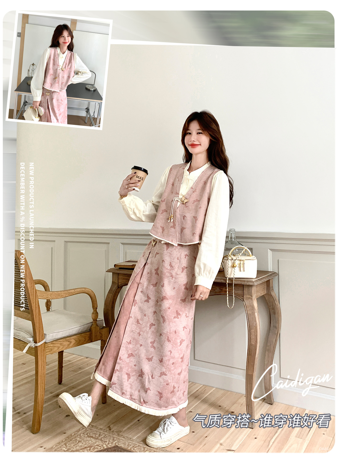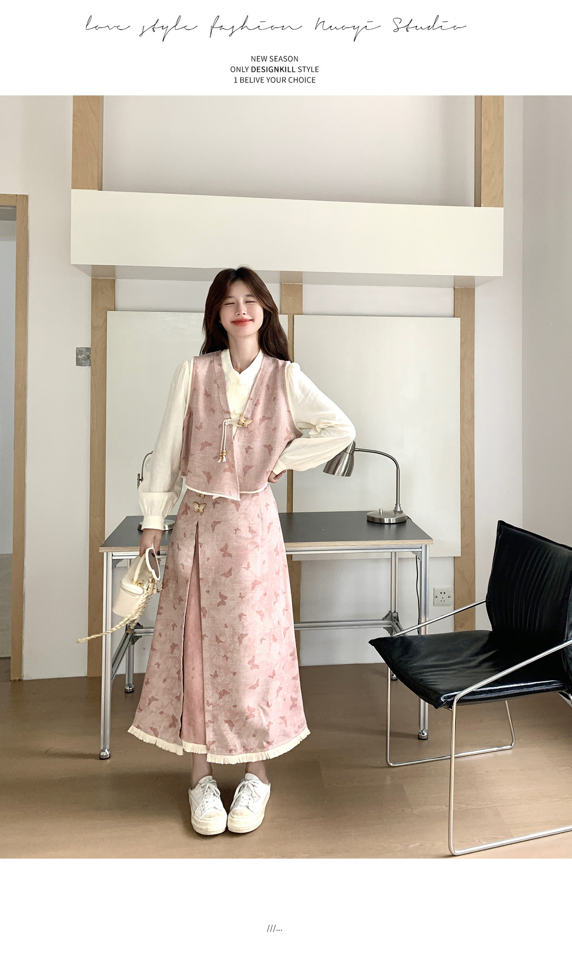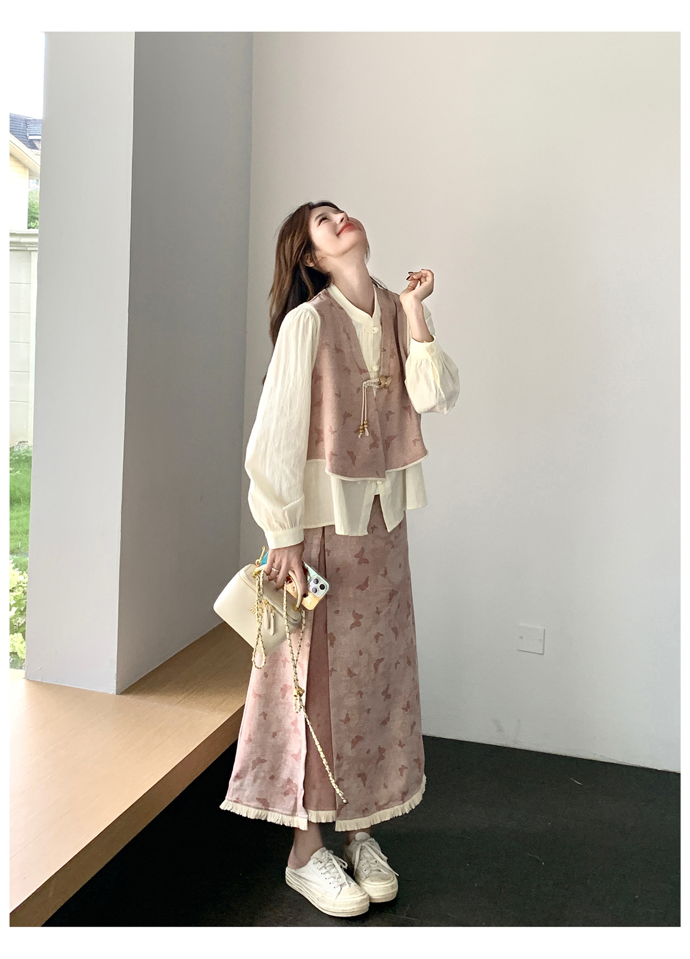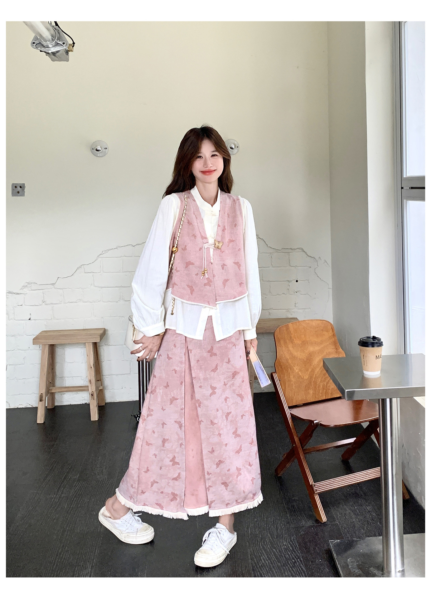 粉色新中式蝴蝶印花马甲套装裙女2025秋新款长袖衬衫半身裙三件套