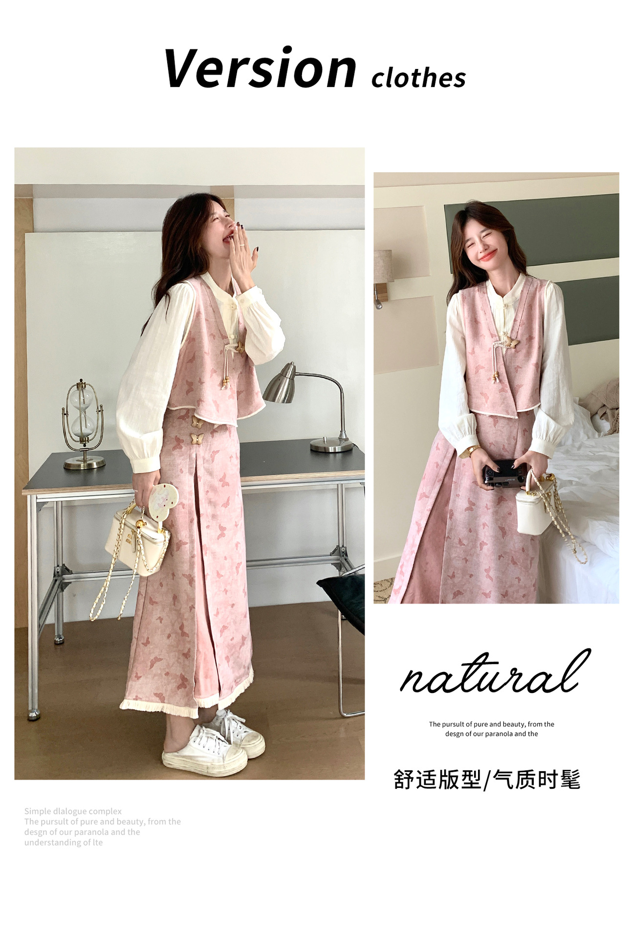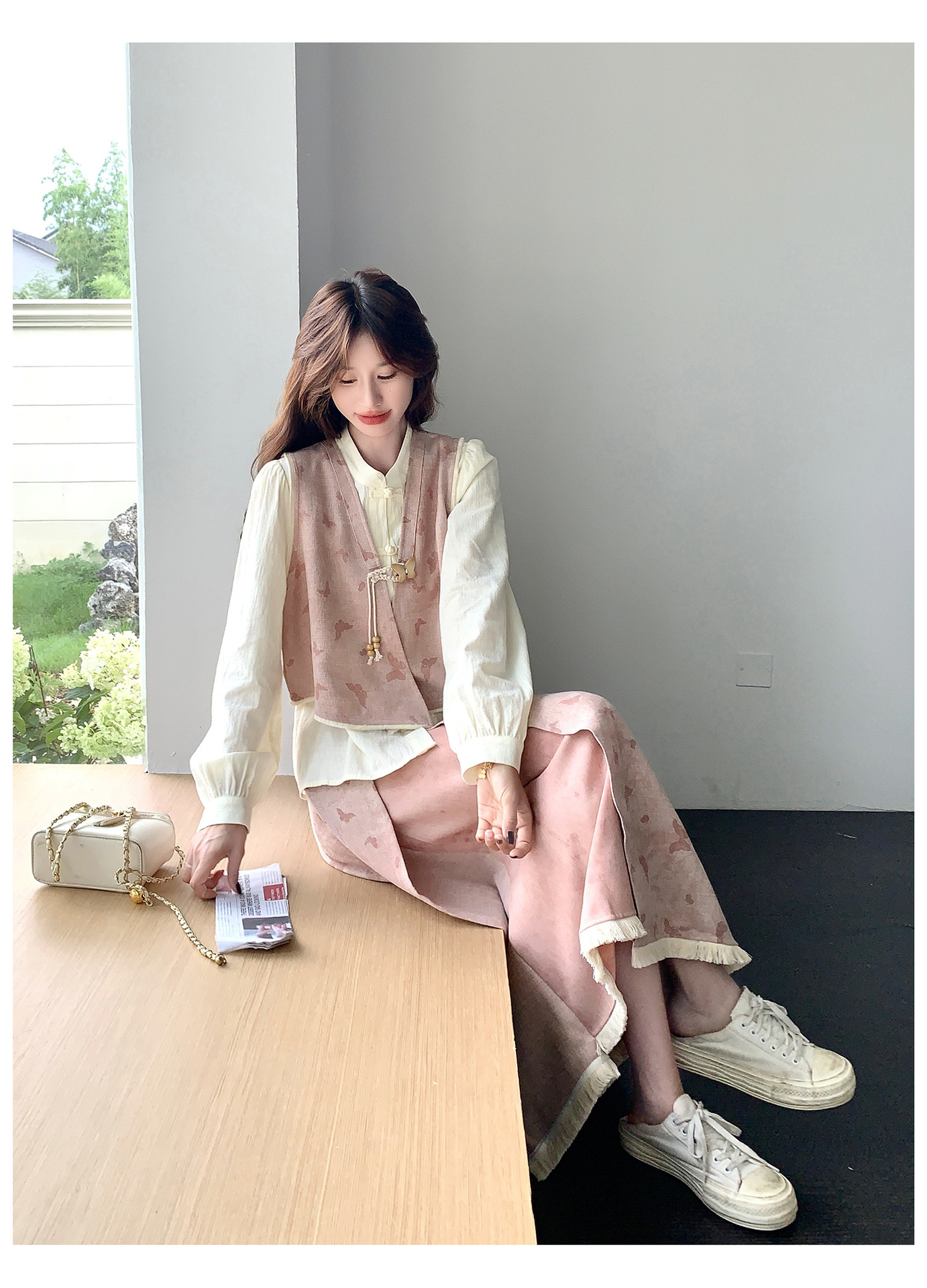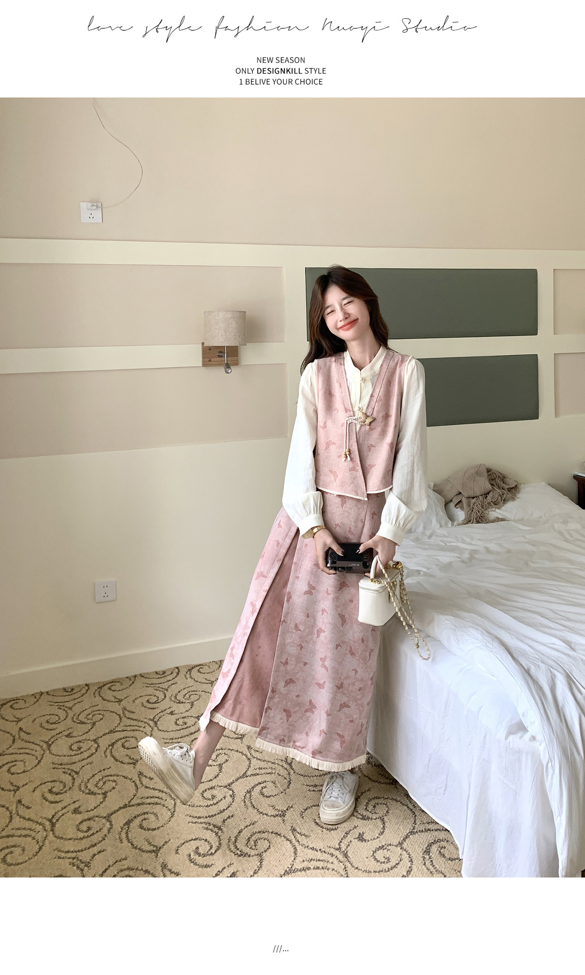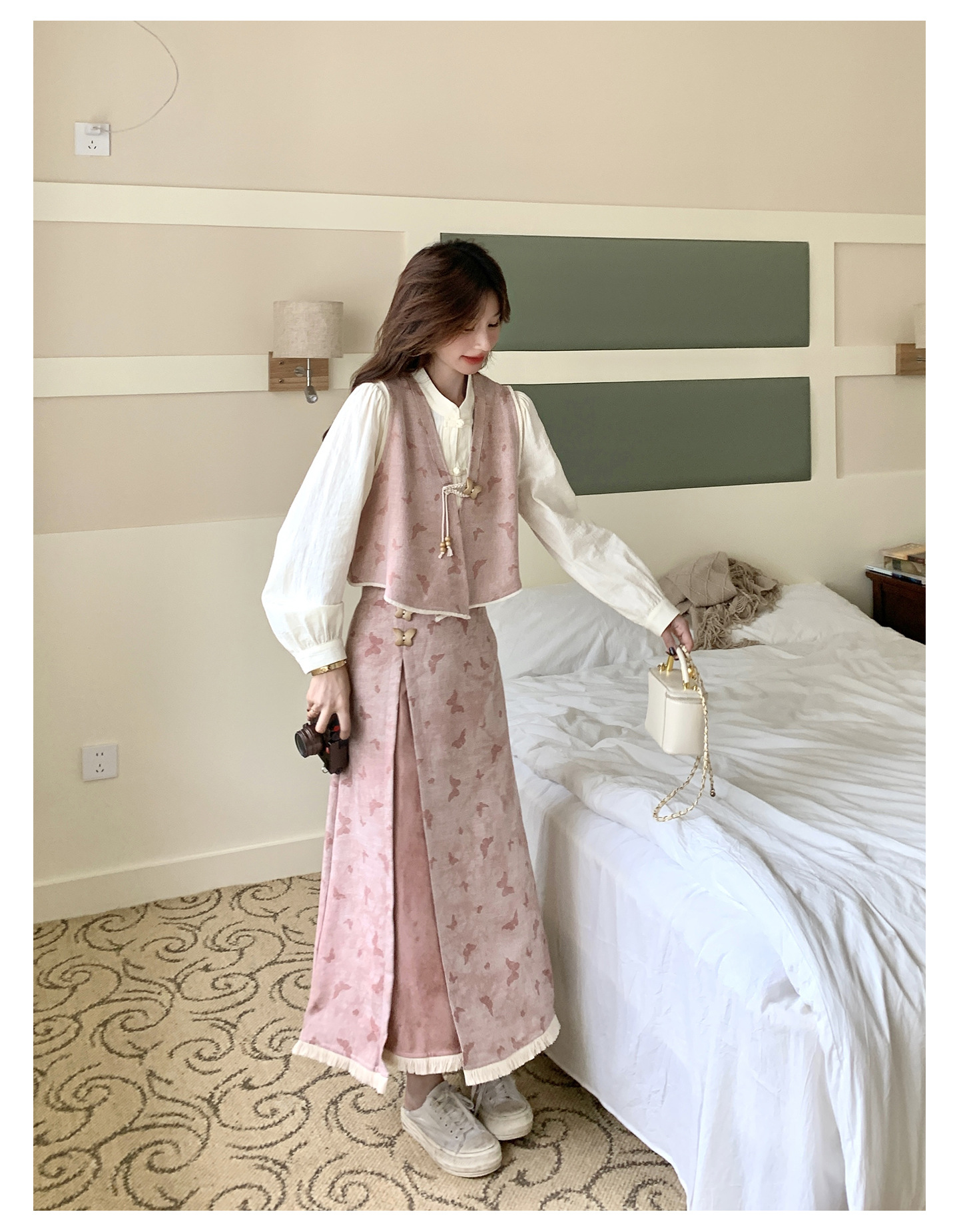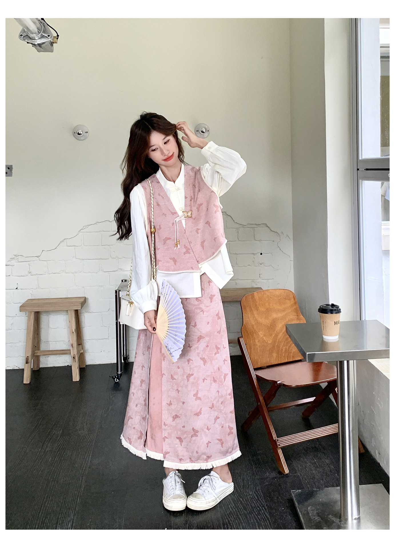 粉色新中式蝴蝶印花马甲套装裙女2025秋新款长袖衬衫半身裙三件套