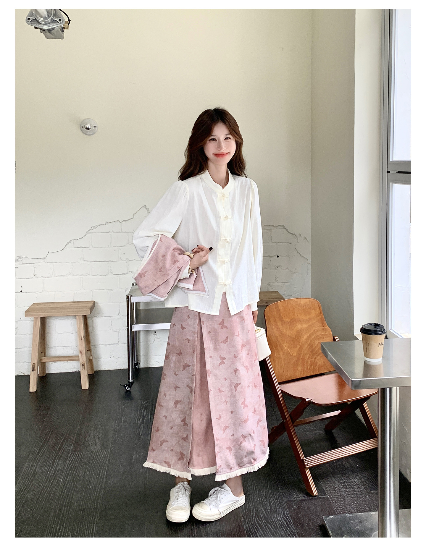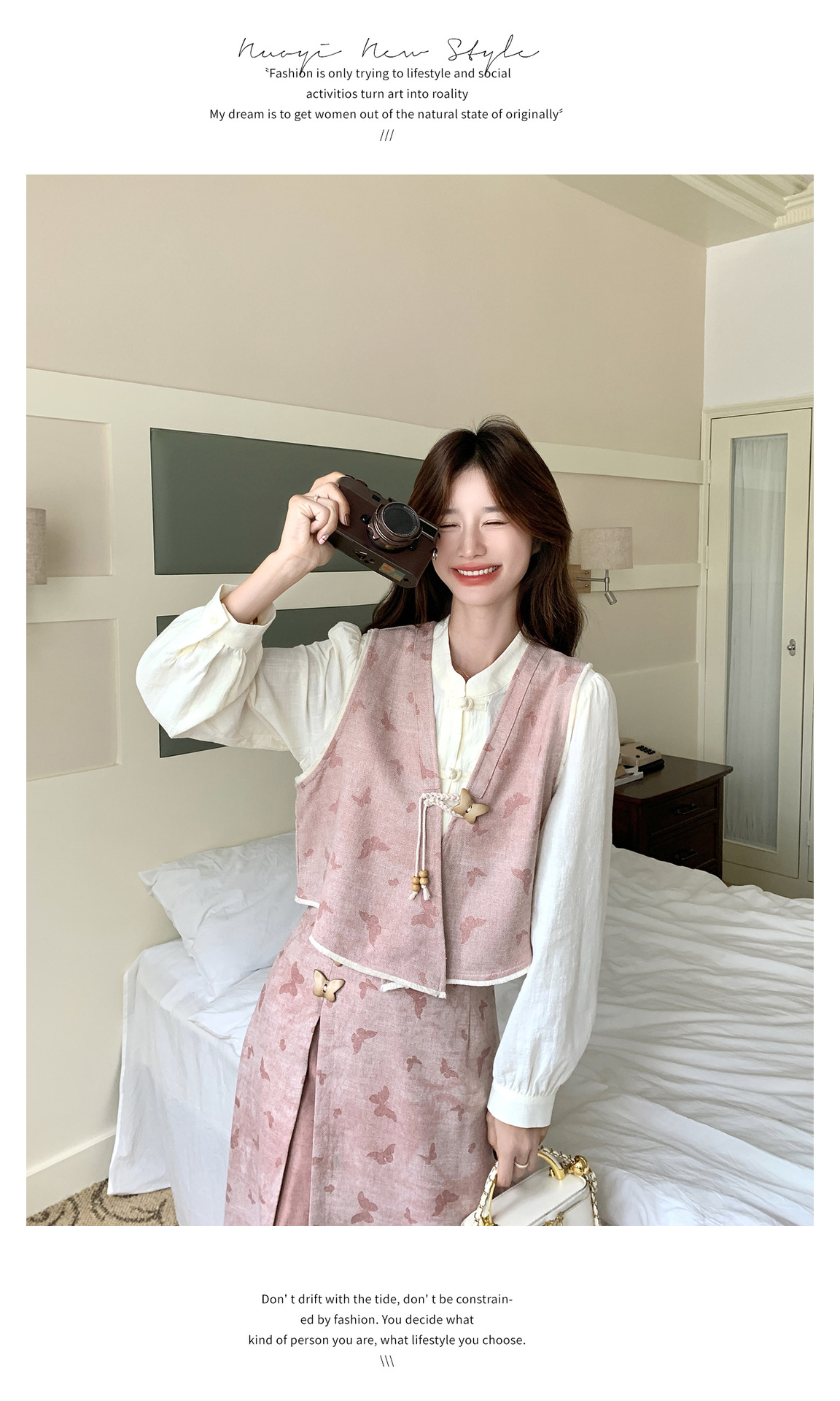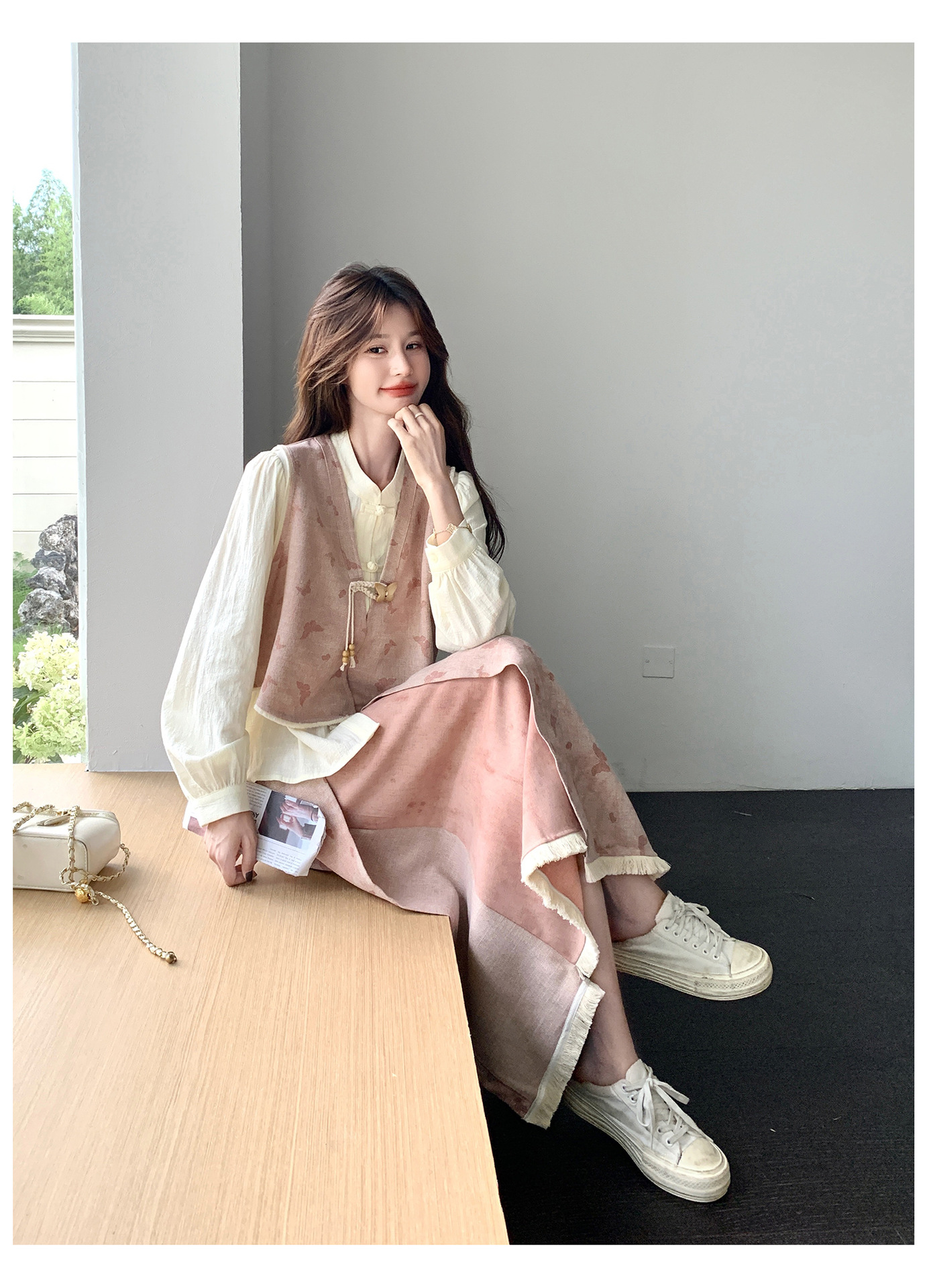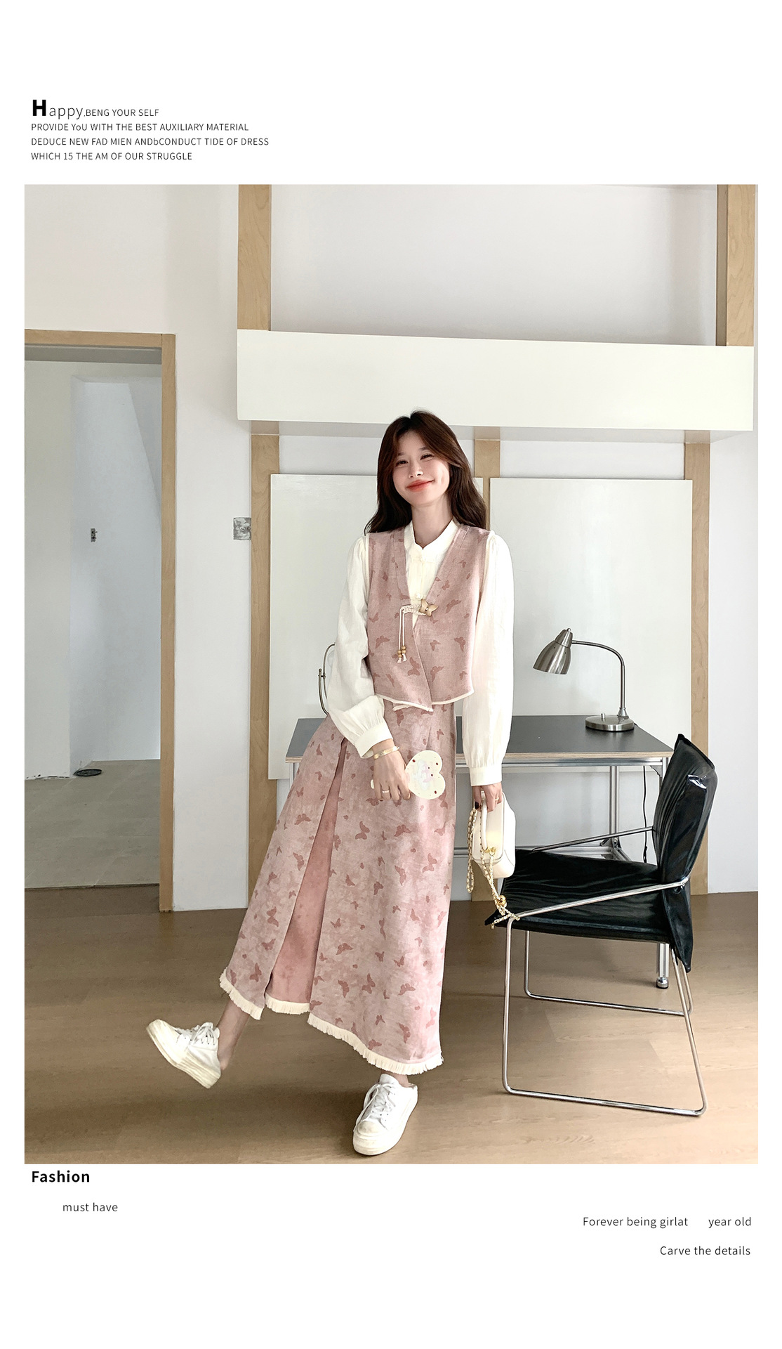粉色新中式蝴蝶印花马甲套装裙女2025秋新款长袖衬衫半身裙三件套