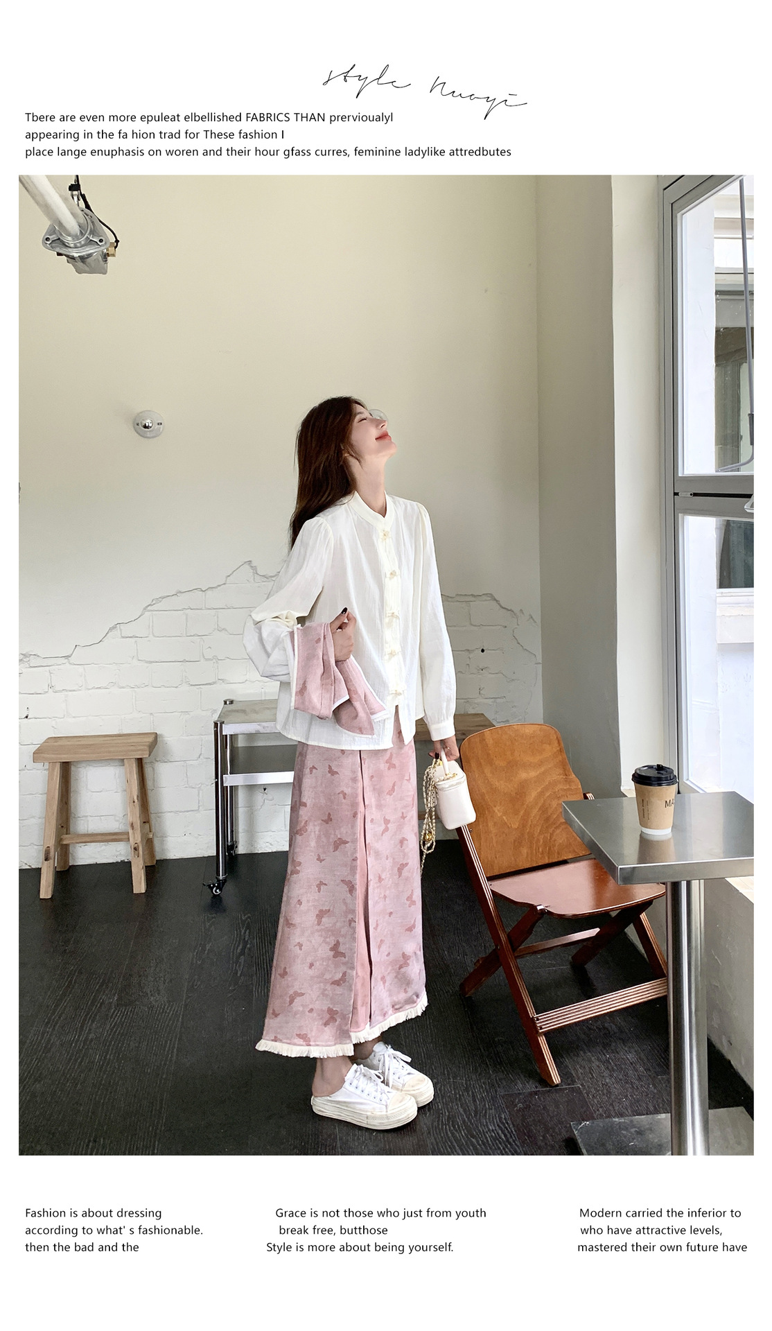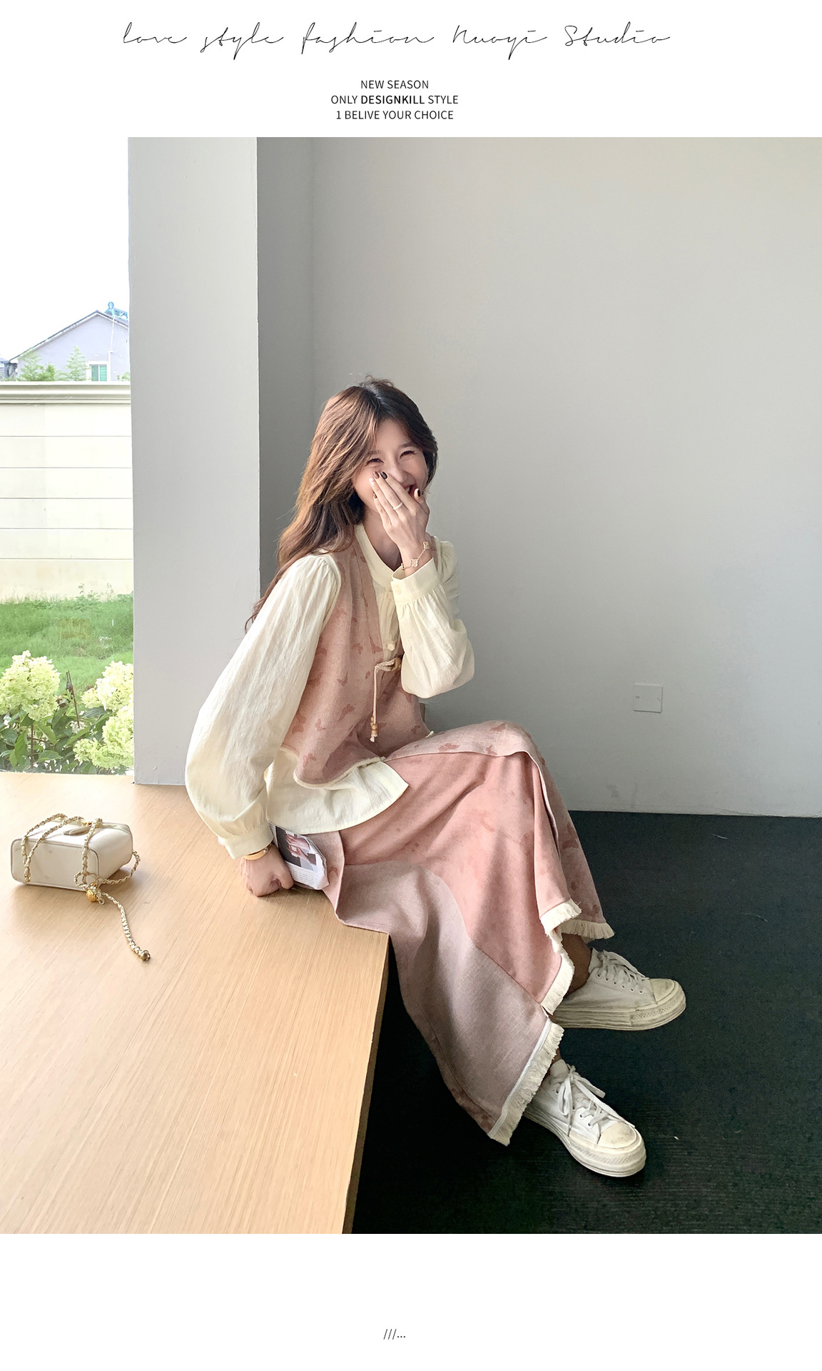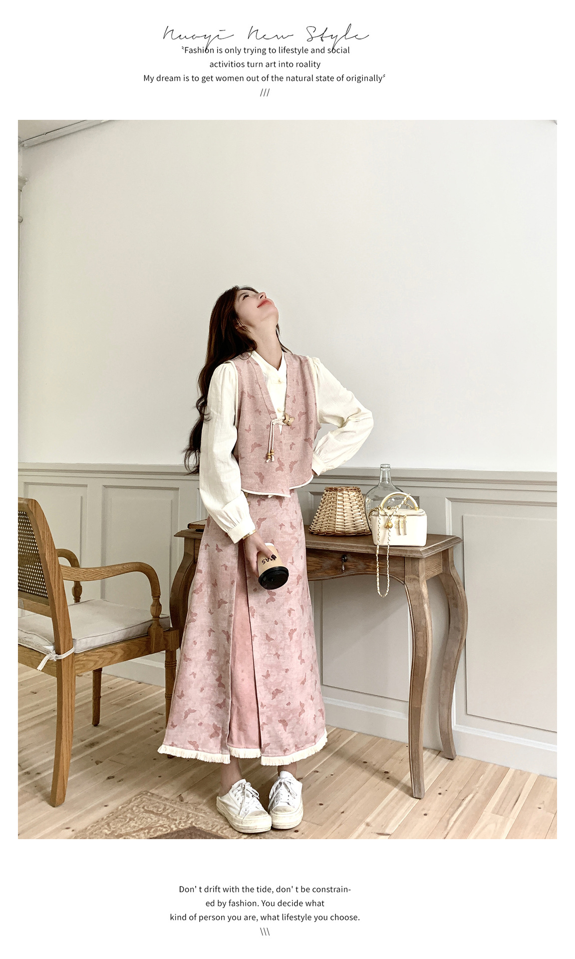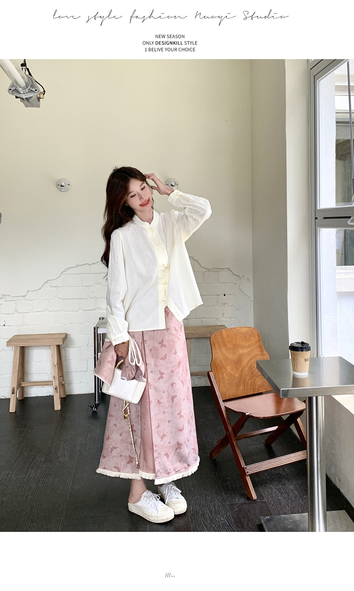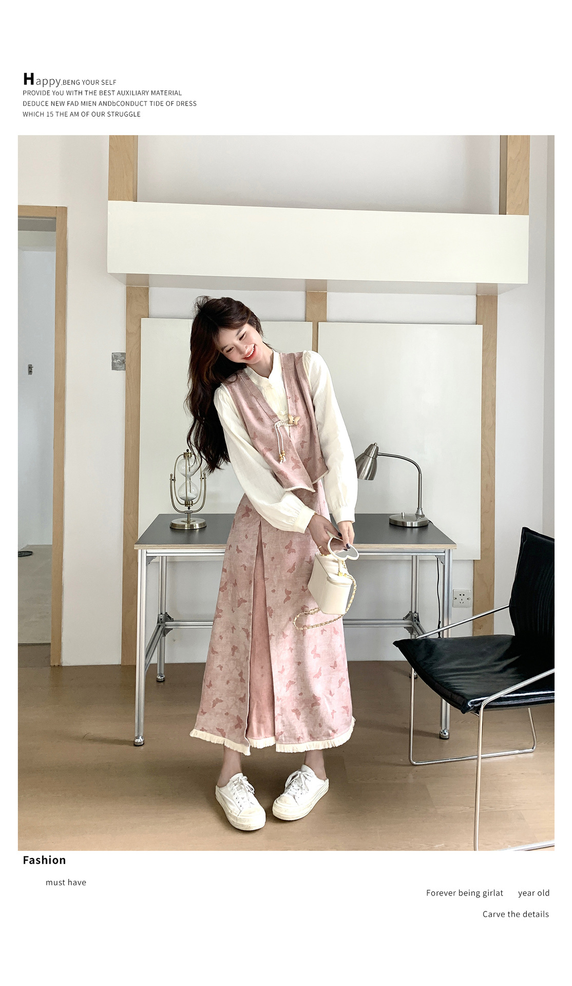 粉色新中式蝴蝶印花马甲套装裙女2025秋新款长袖衬衫半身裙三件套