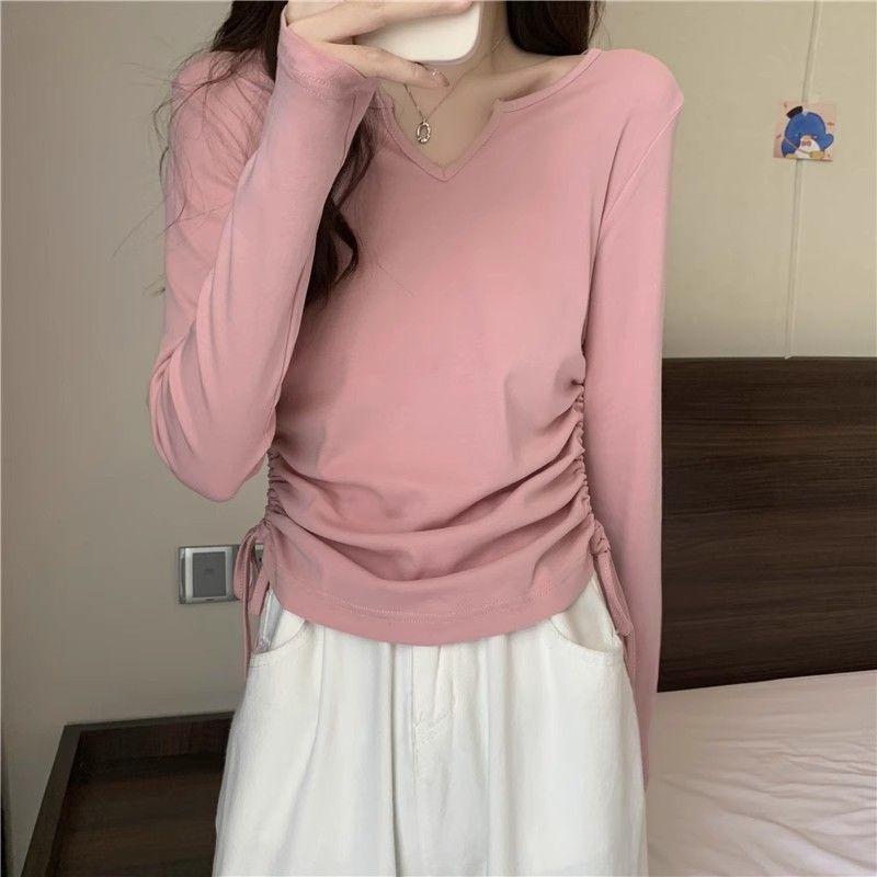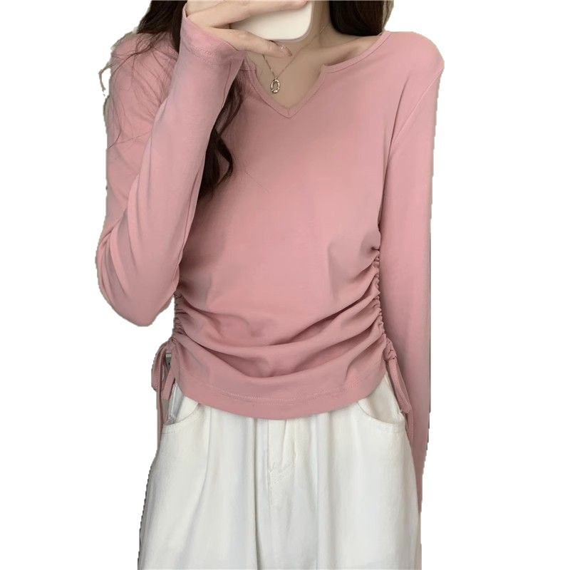 法式V领锁骨长袖内搭t恤打底衫女春小众独特别致抽绳修身百搭上衣