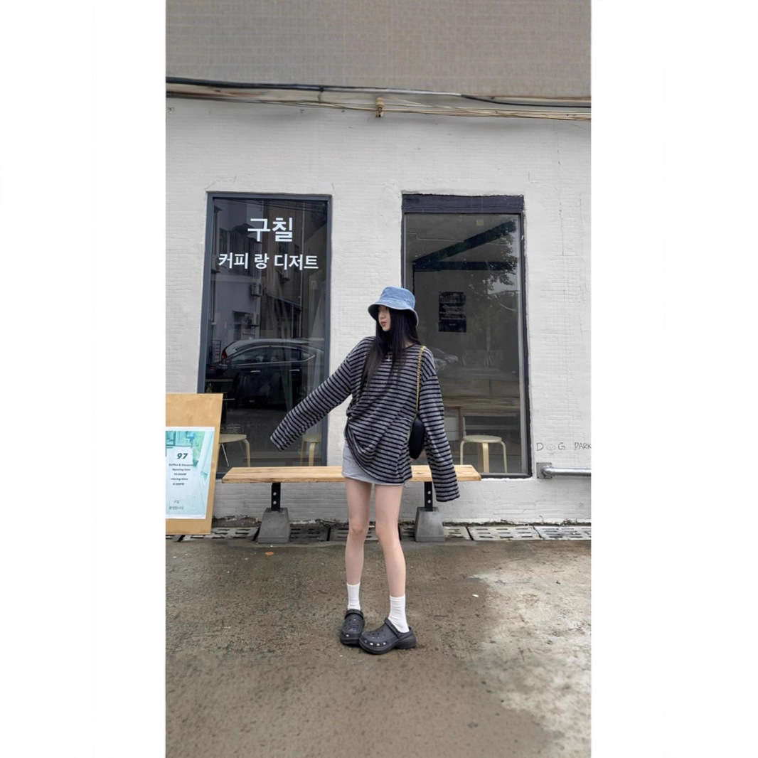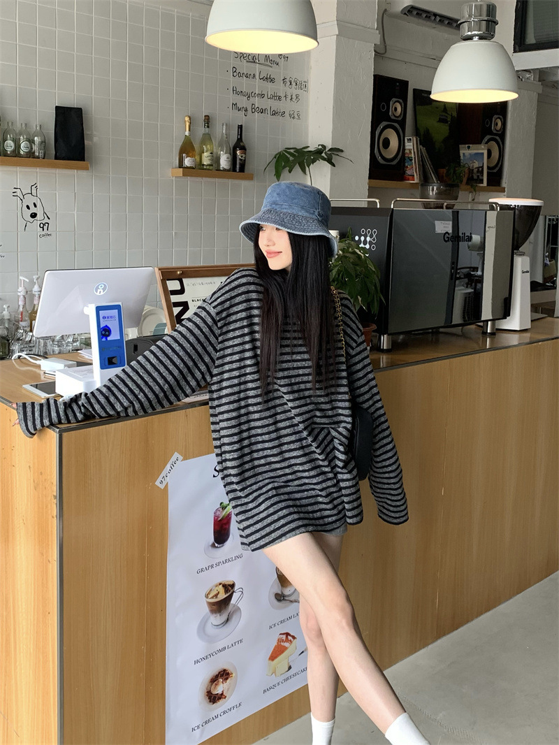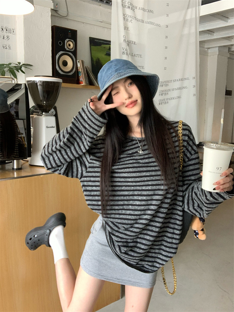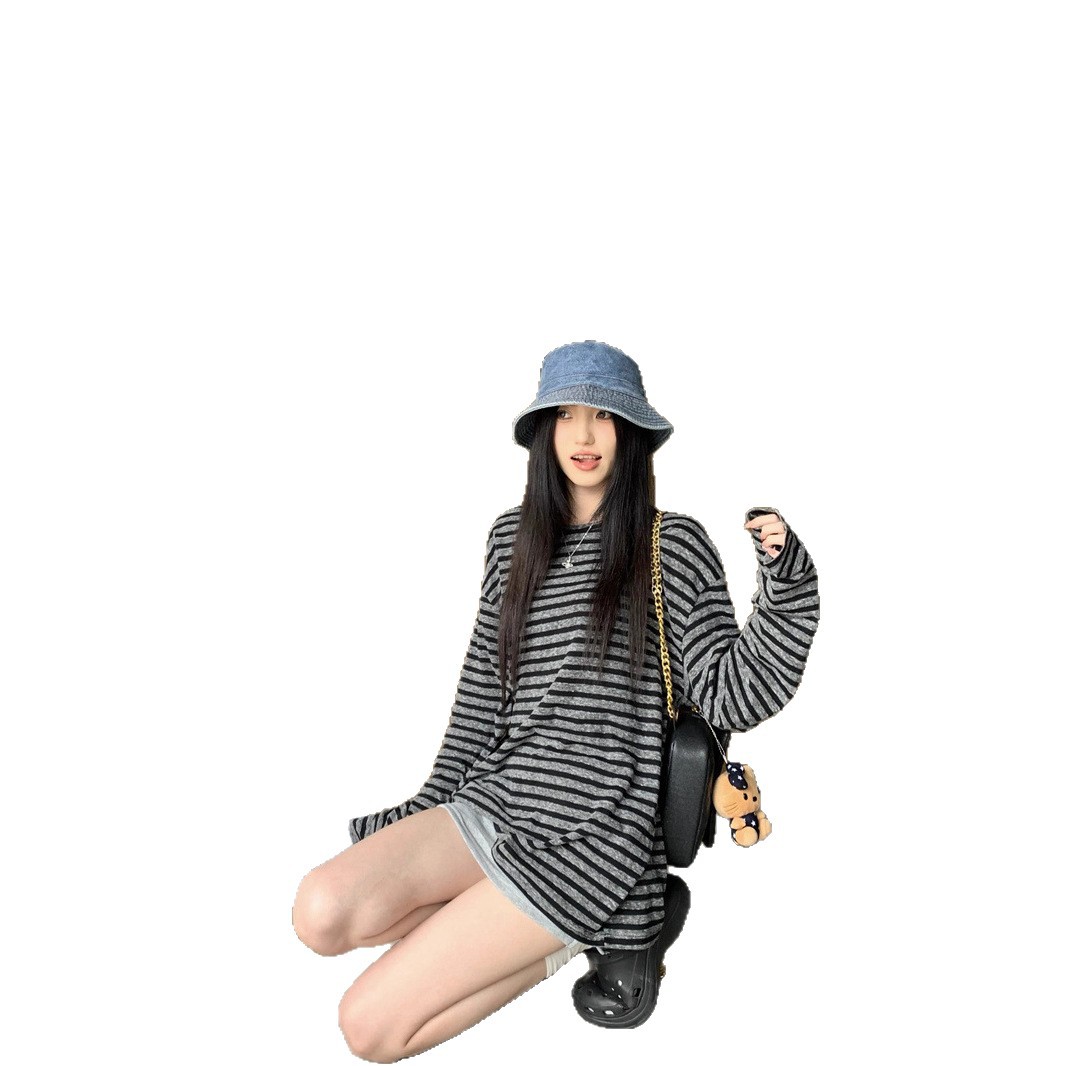 慵懒松弛感条纹长袖T恤女秋季新款韩系打底衫休闲宽松圆领上衣潮