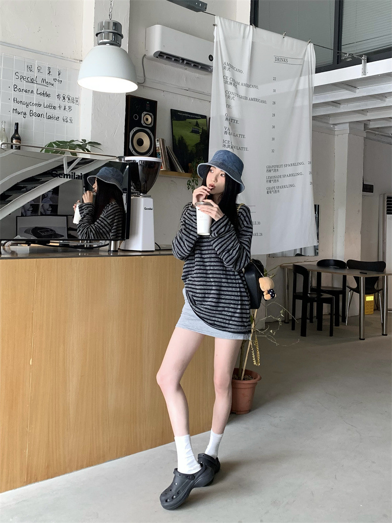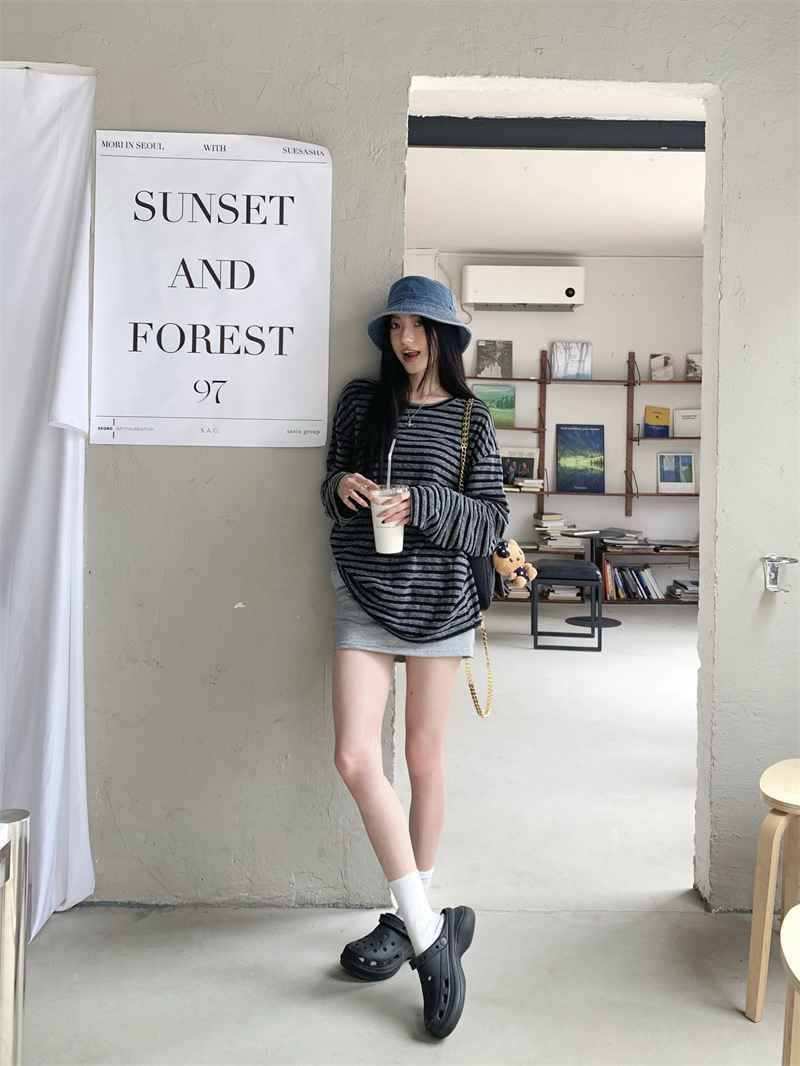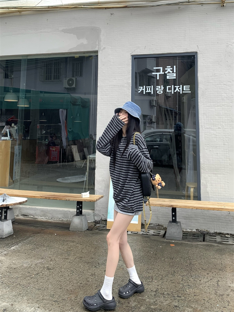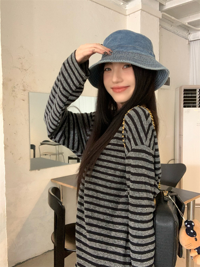 慵懒松弛感条纹长袖T恤女秋季新款韩系打底衫休闲宽松圆领上衣潮