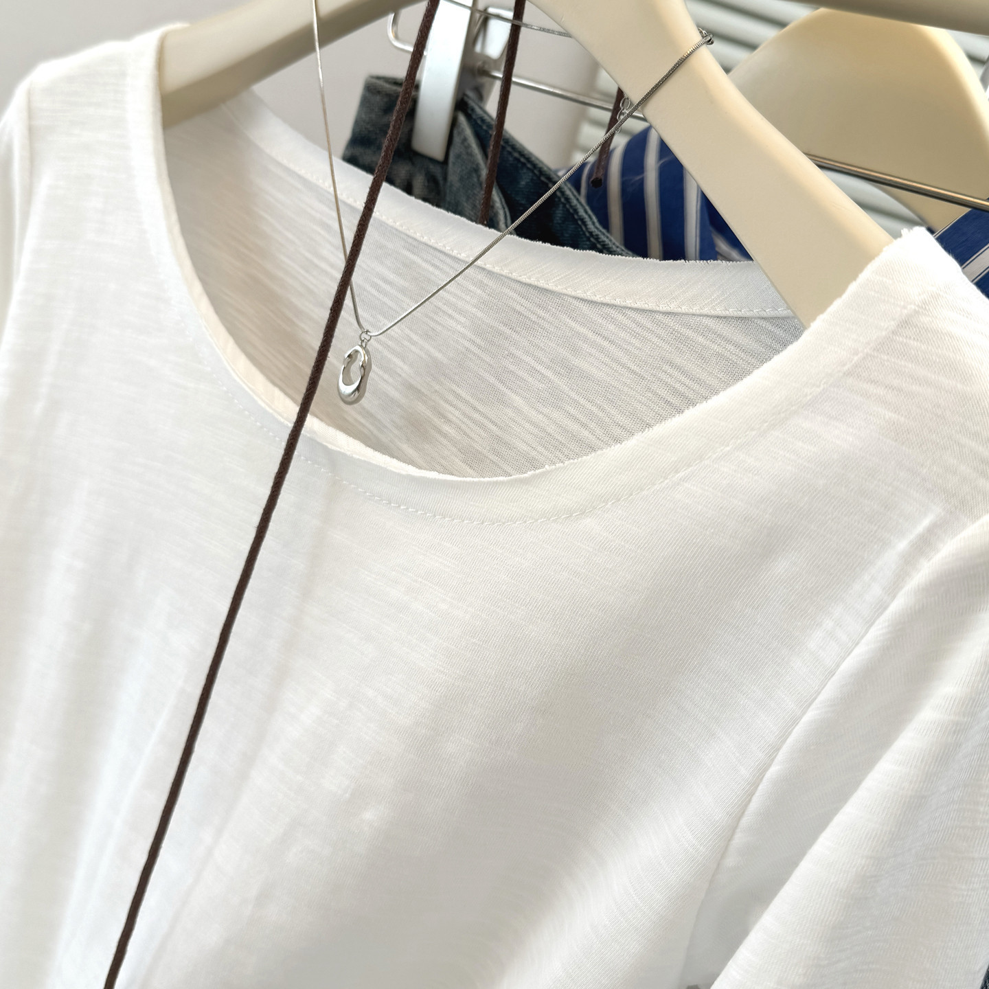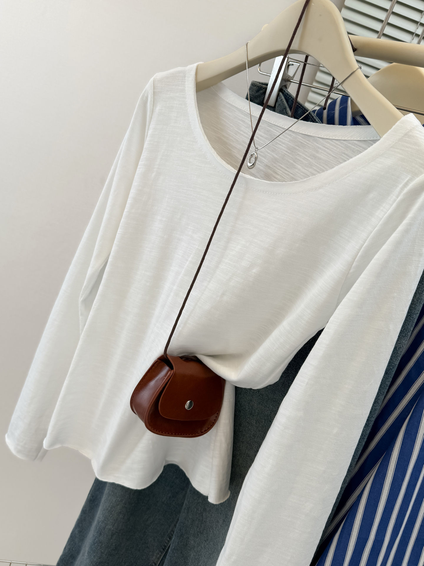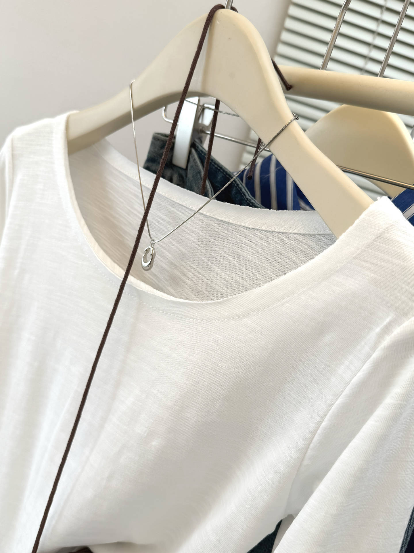 欧美风实拍白色竹节棉长袖T恤女早春秋韩版打底衫修身U领上衣