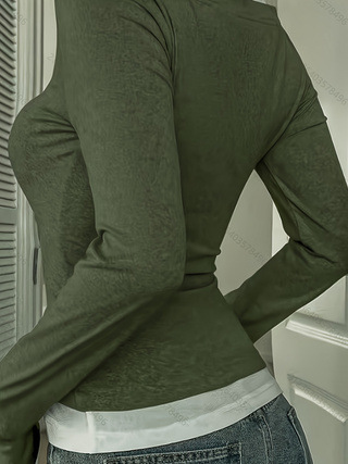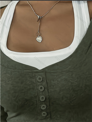 女装时尚假两件方领纽扣装饰修身长袖针织上衣
