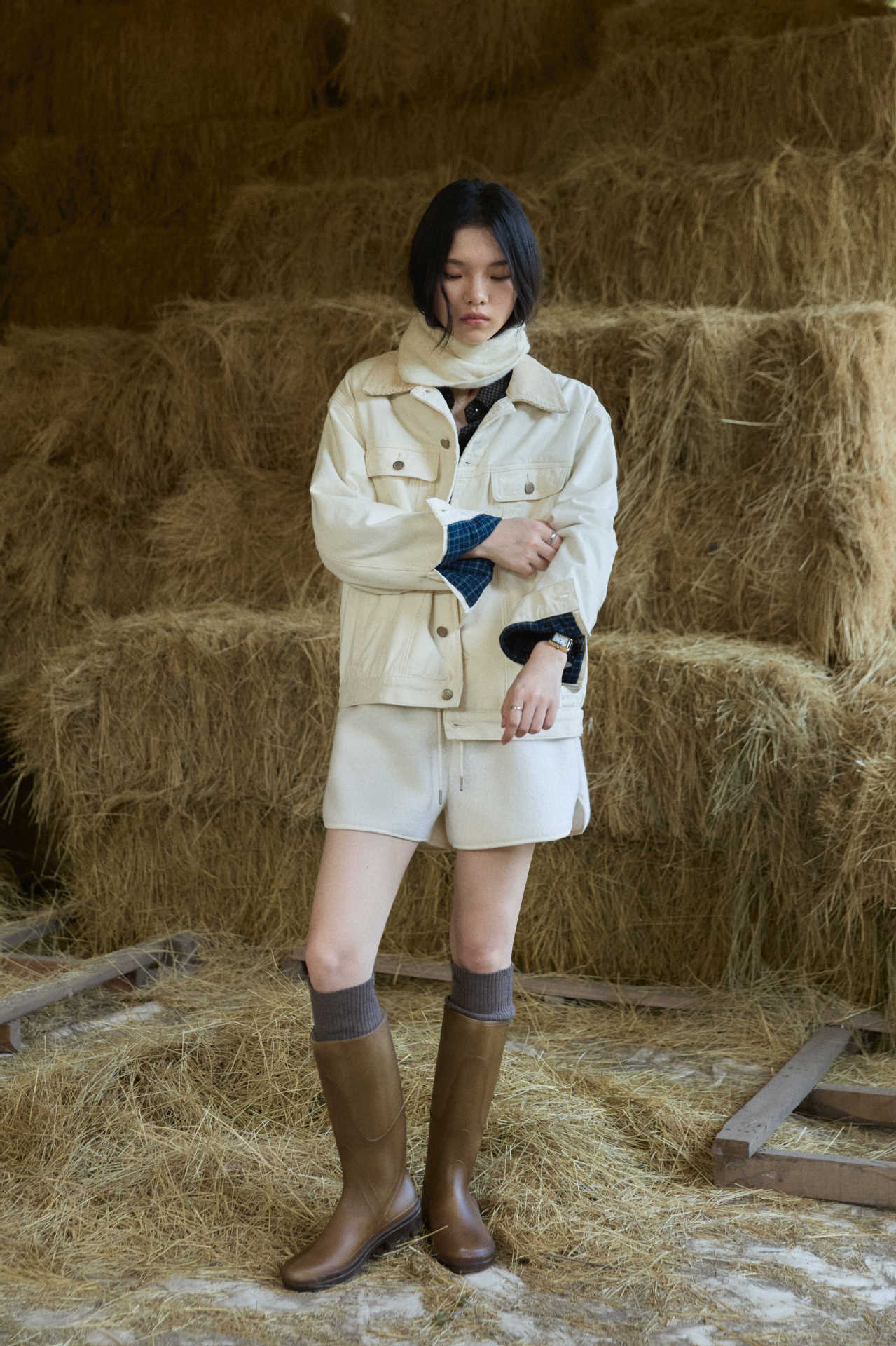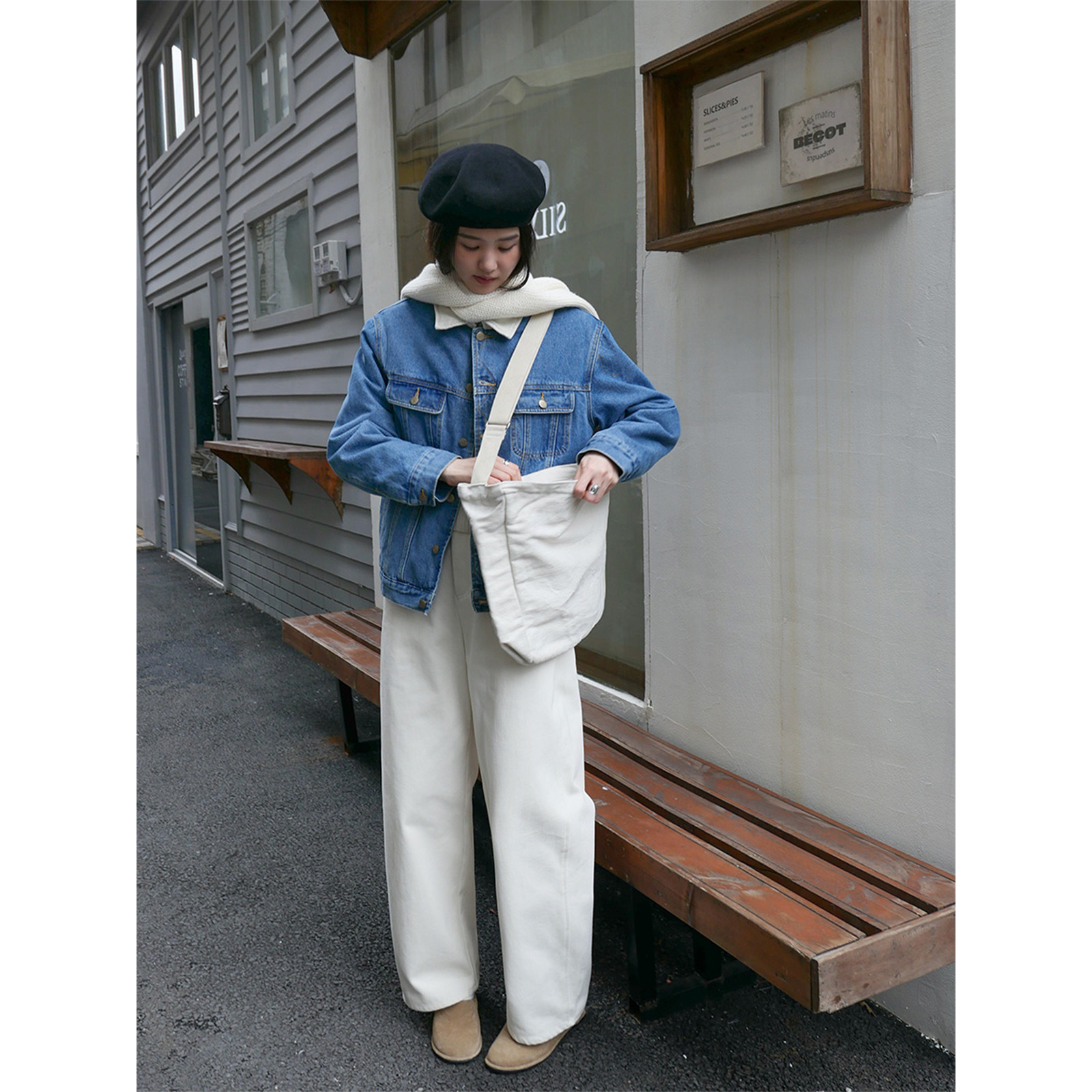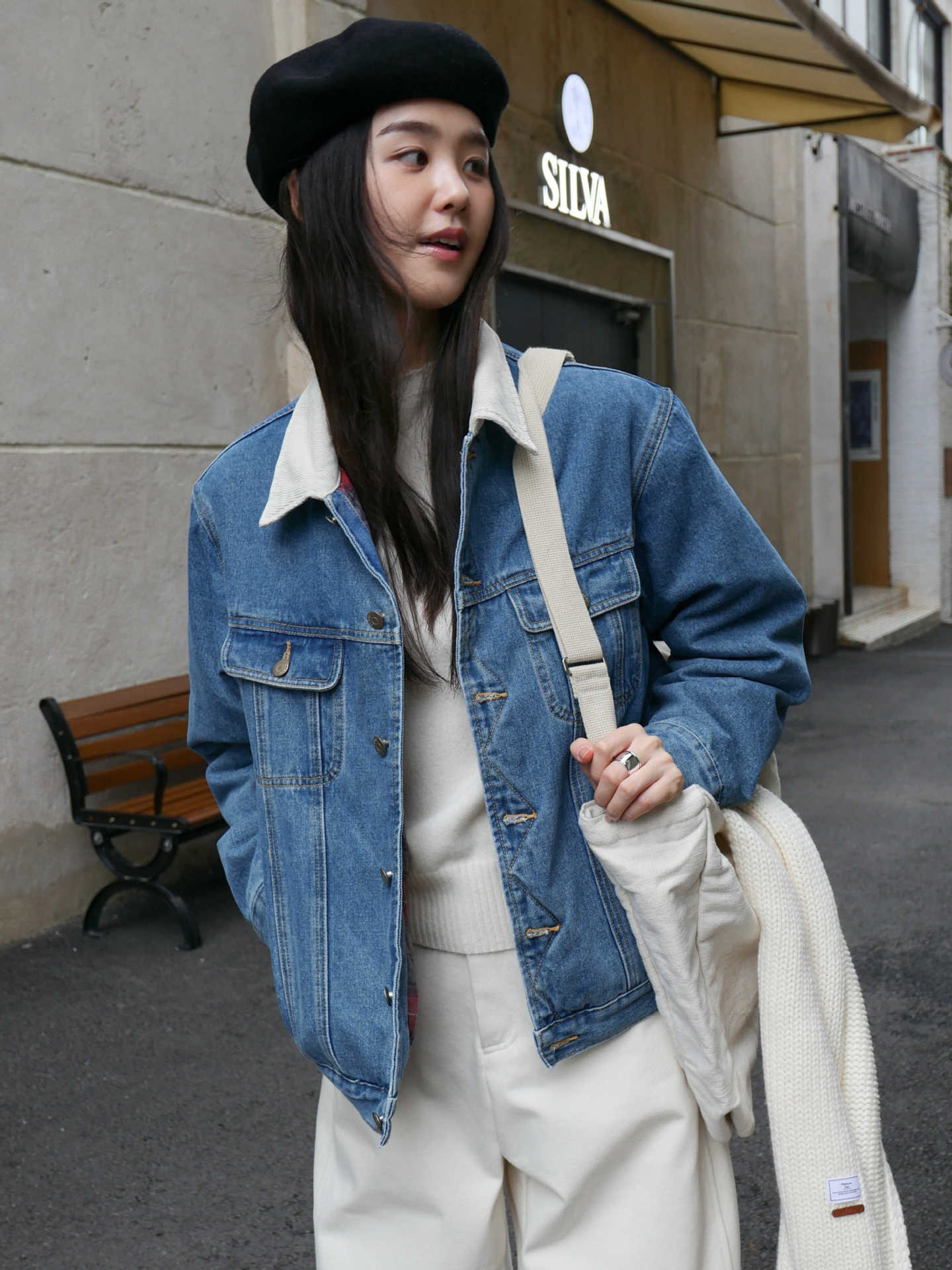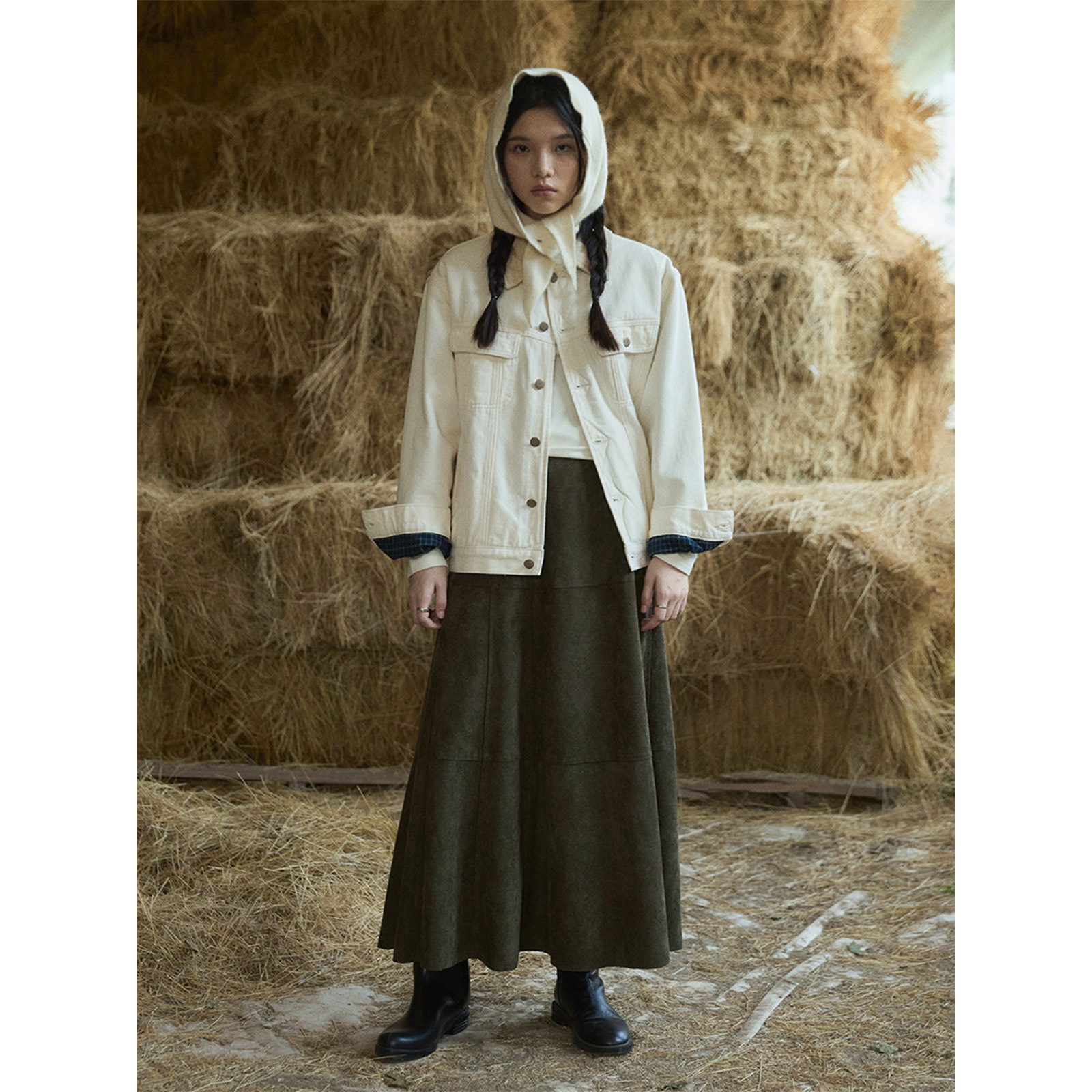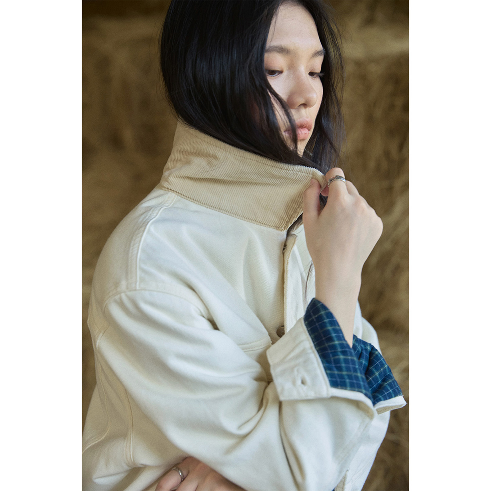 时简 苏格兰格调 巴恩风灯芯绒撞色牛仔外套复古时髦裥棉夹克2373