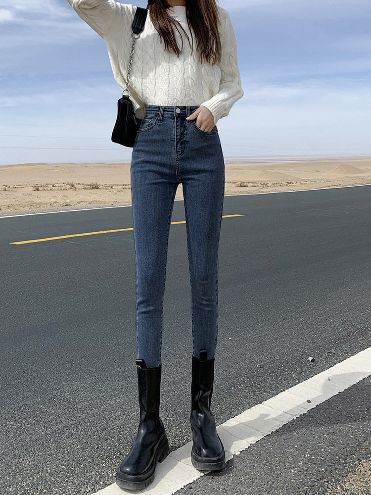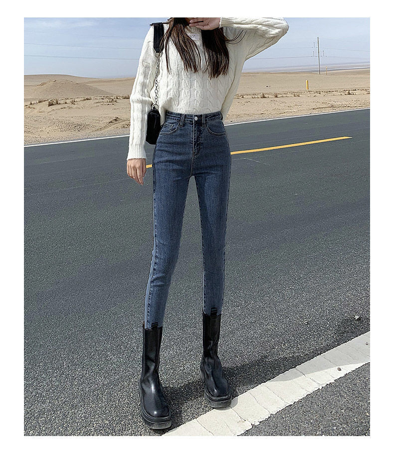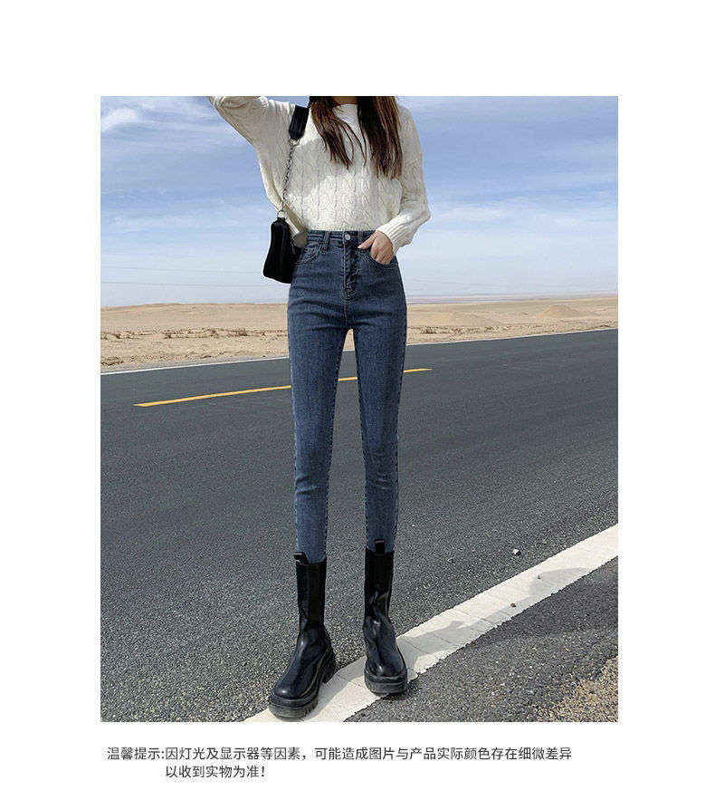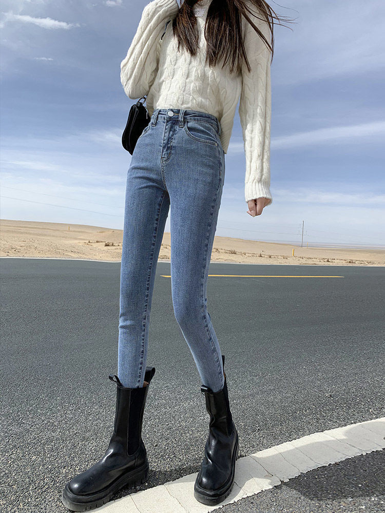 春秋新款韩版高腰弹力小脚牛仔裤女蓝灰色修身显瘦九分紧身铅笔裤