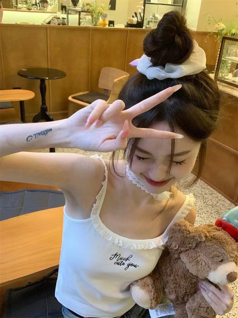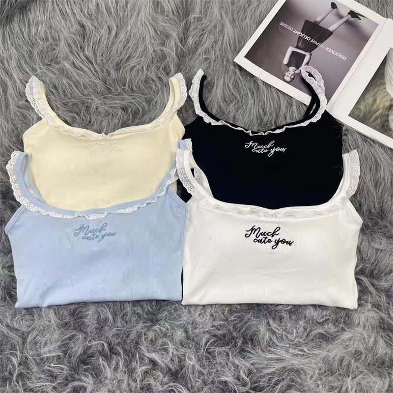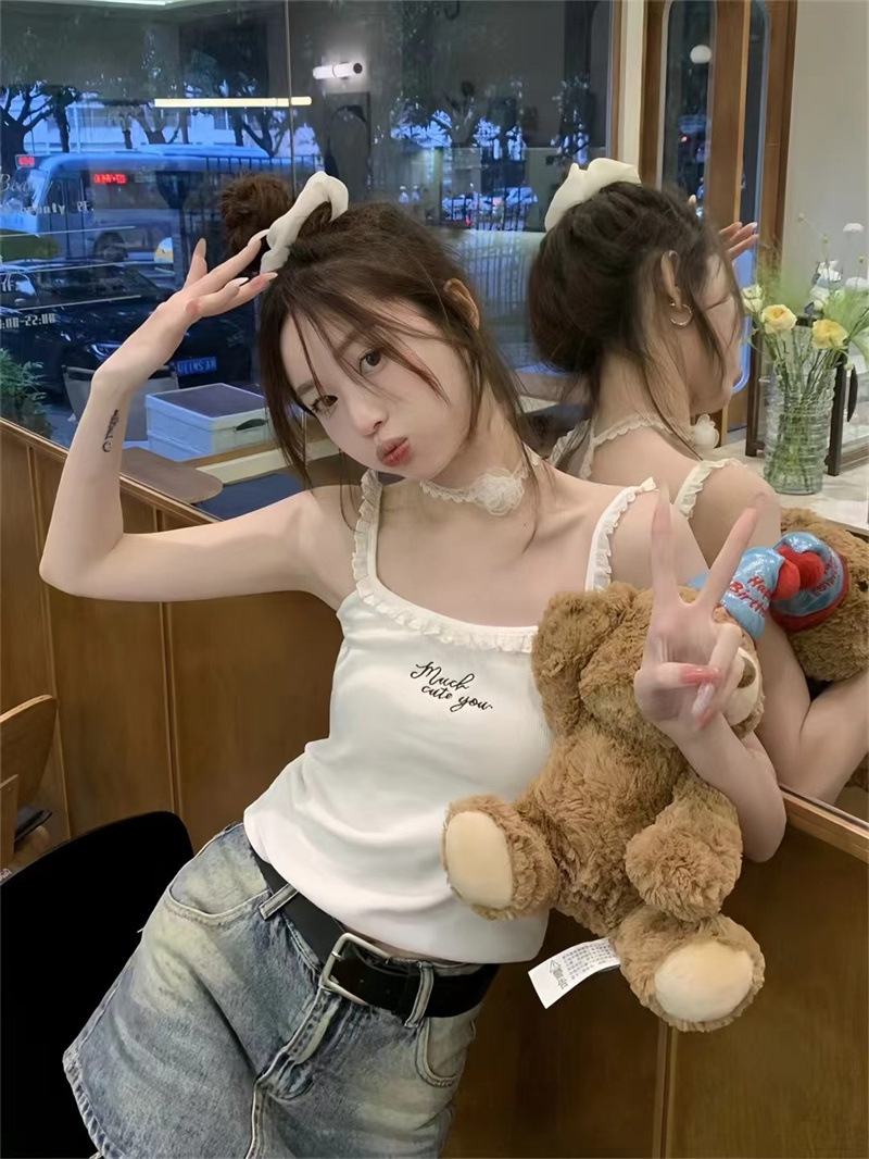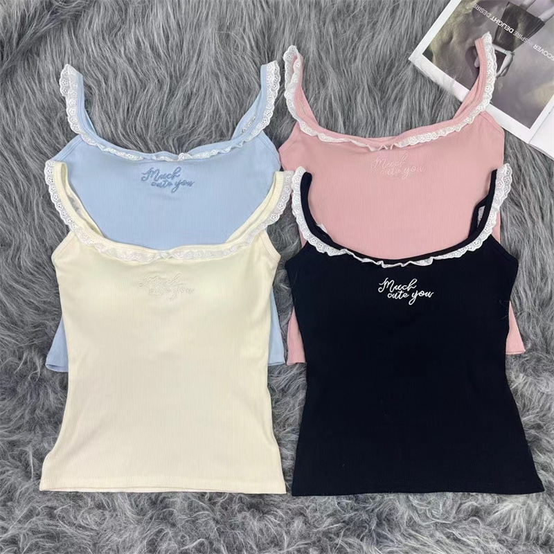 纯欲bm风别致绝美蕾丝木耳边带胸垫吊带背心女外穿修身短款小上衣
