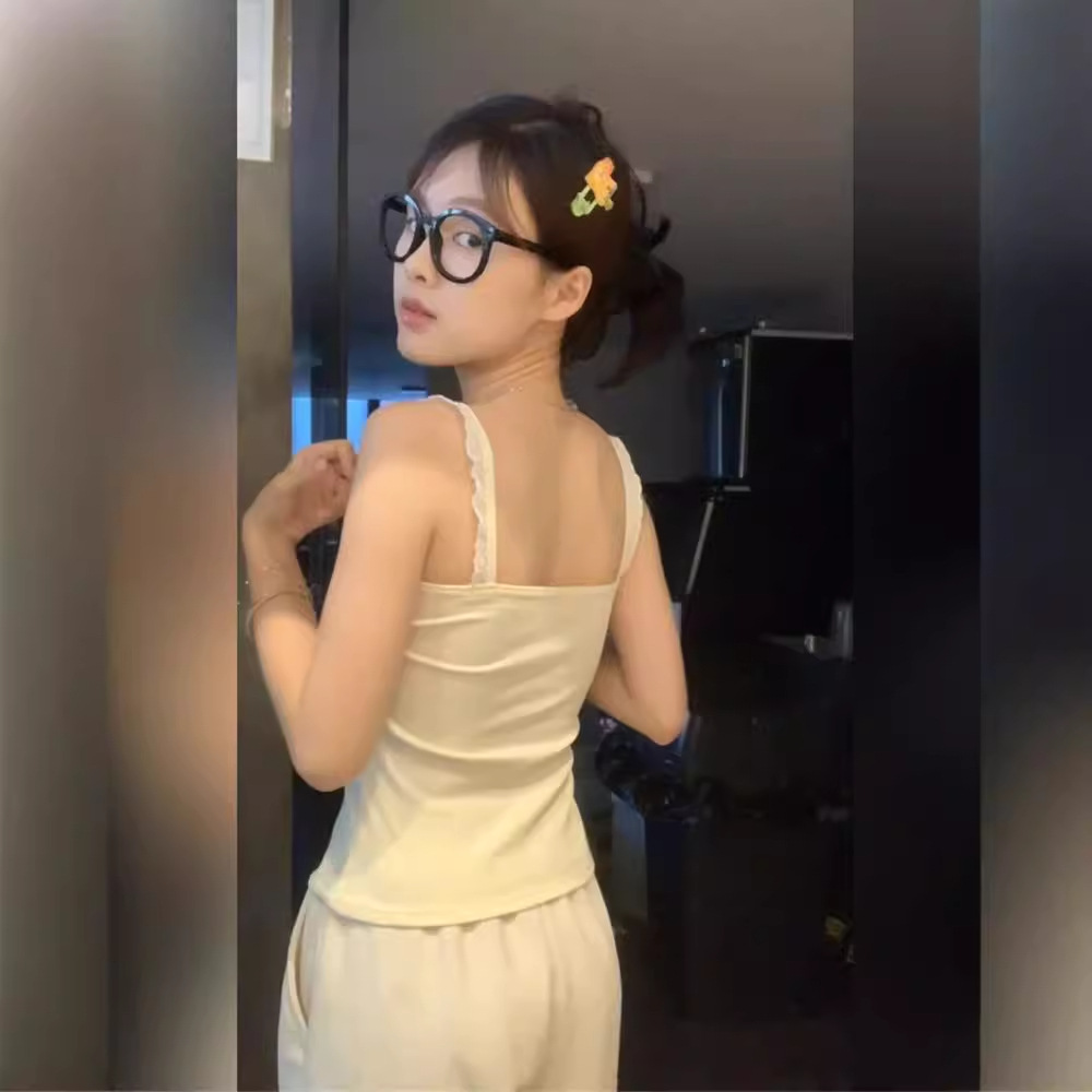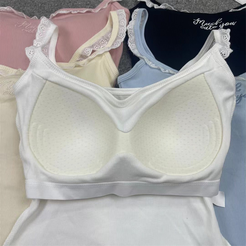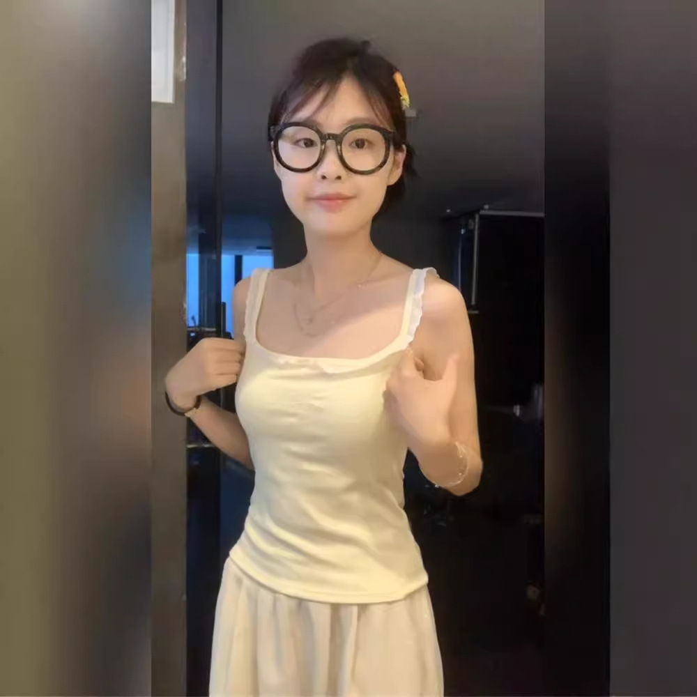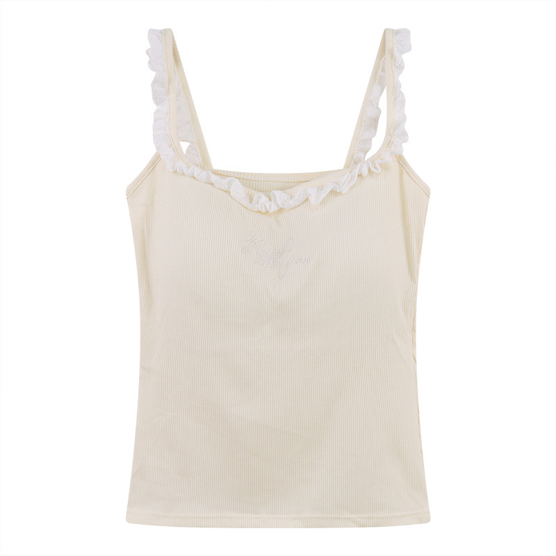 纯欲bm风别致绝美蕾丝木耳边带胸垫吊带背心女外穿修身短款小上衣