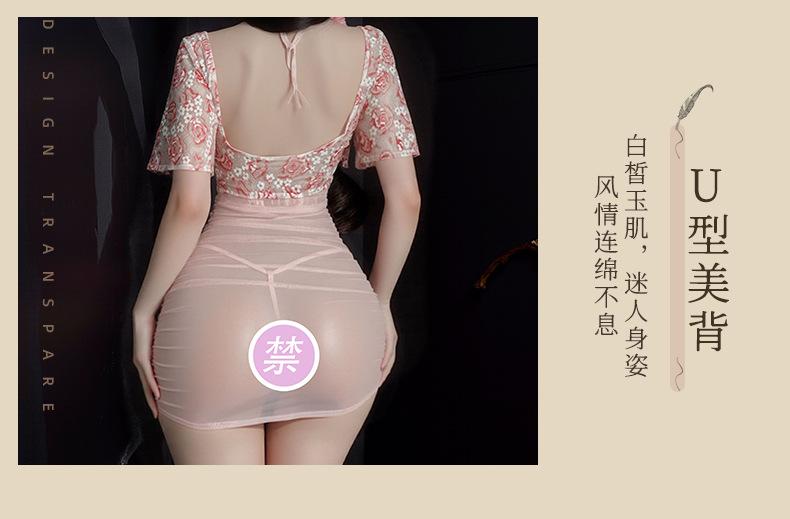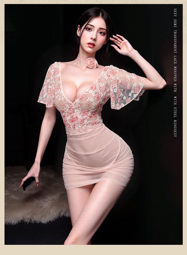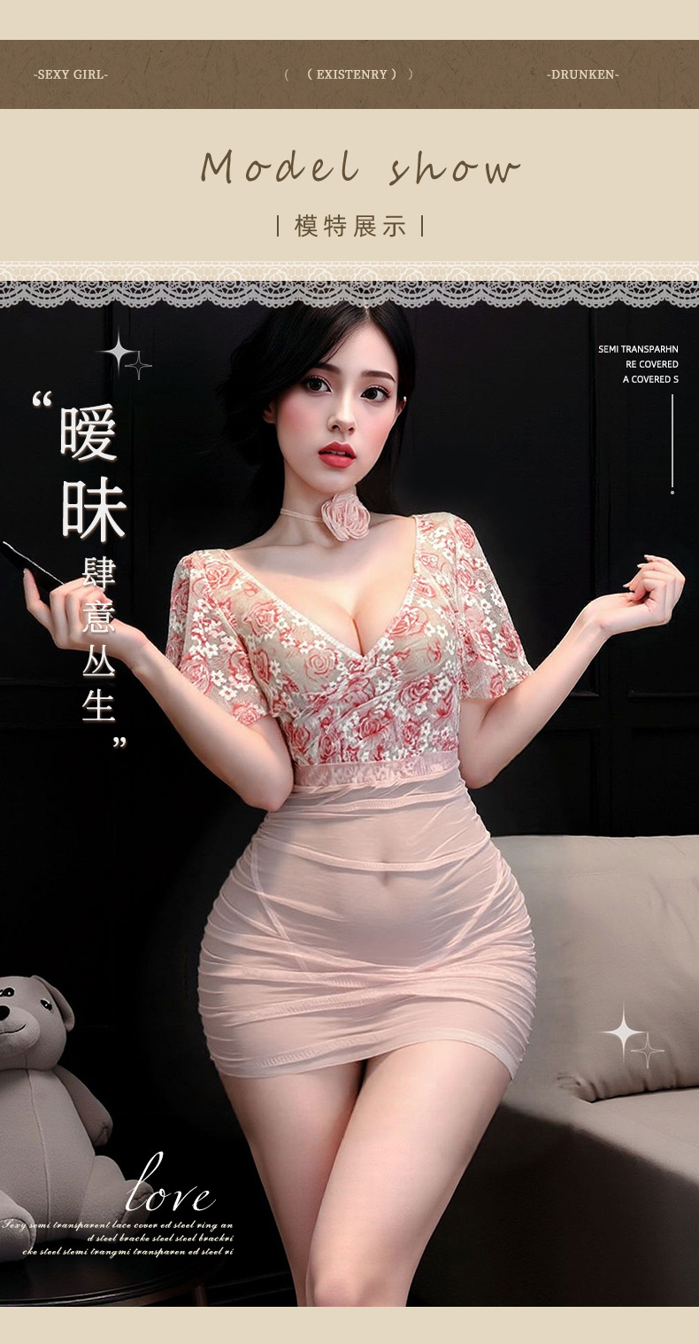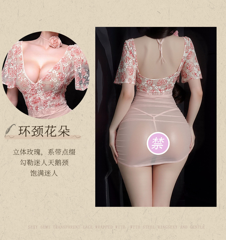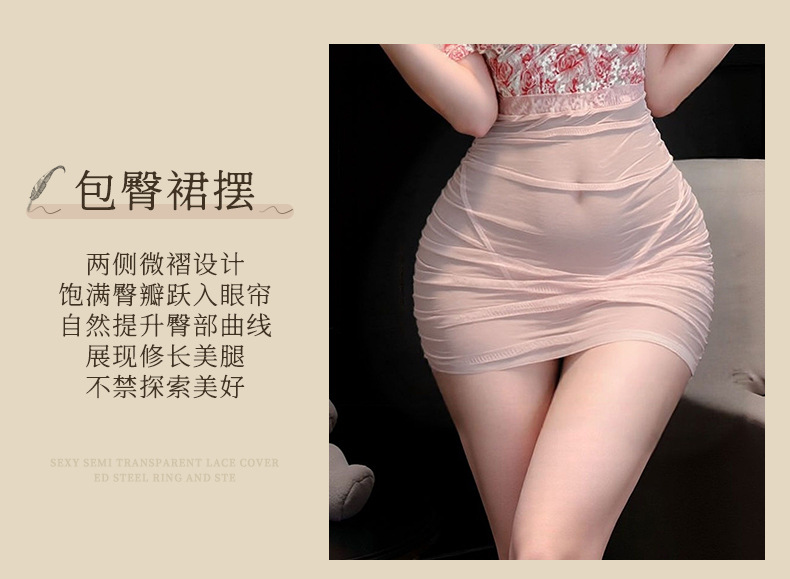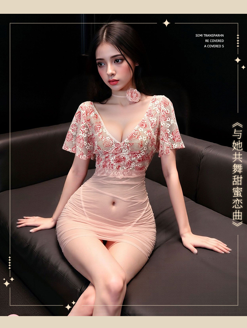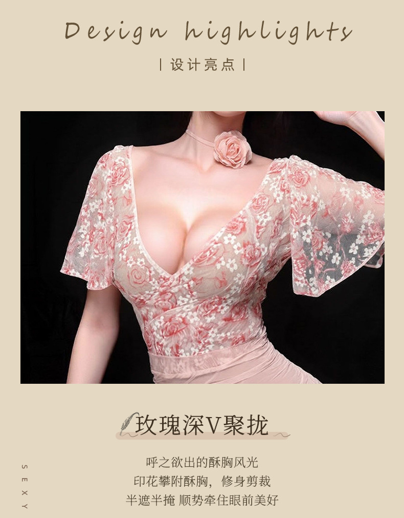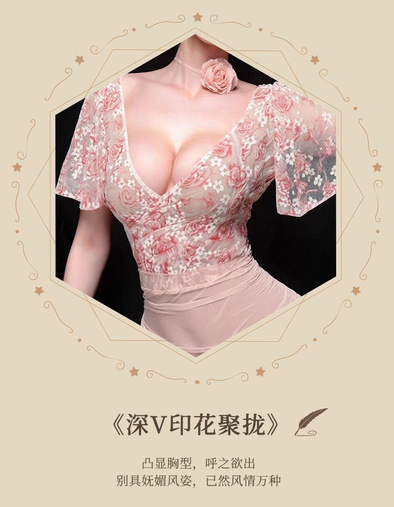情趣内衣火辣性感纯欲透视深V碎花玫瑰轻纱高腰包臀调情睡衣套装