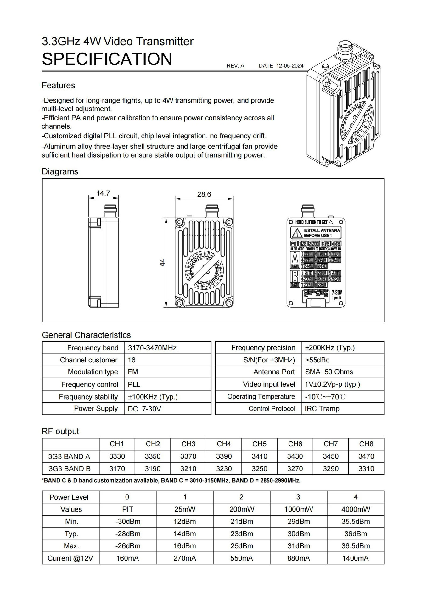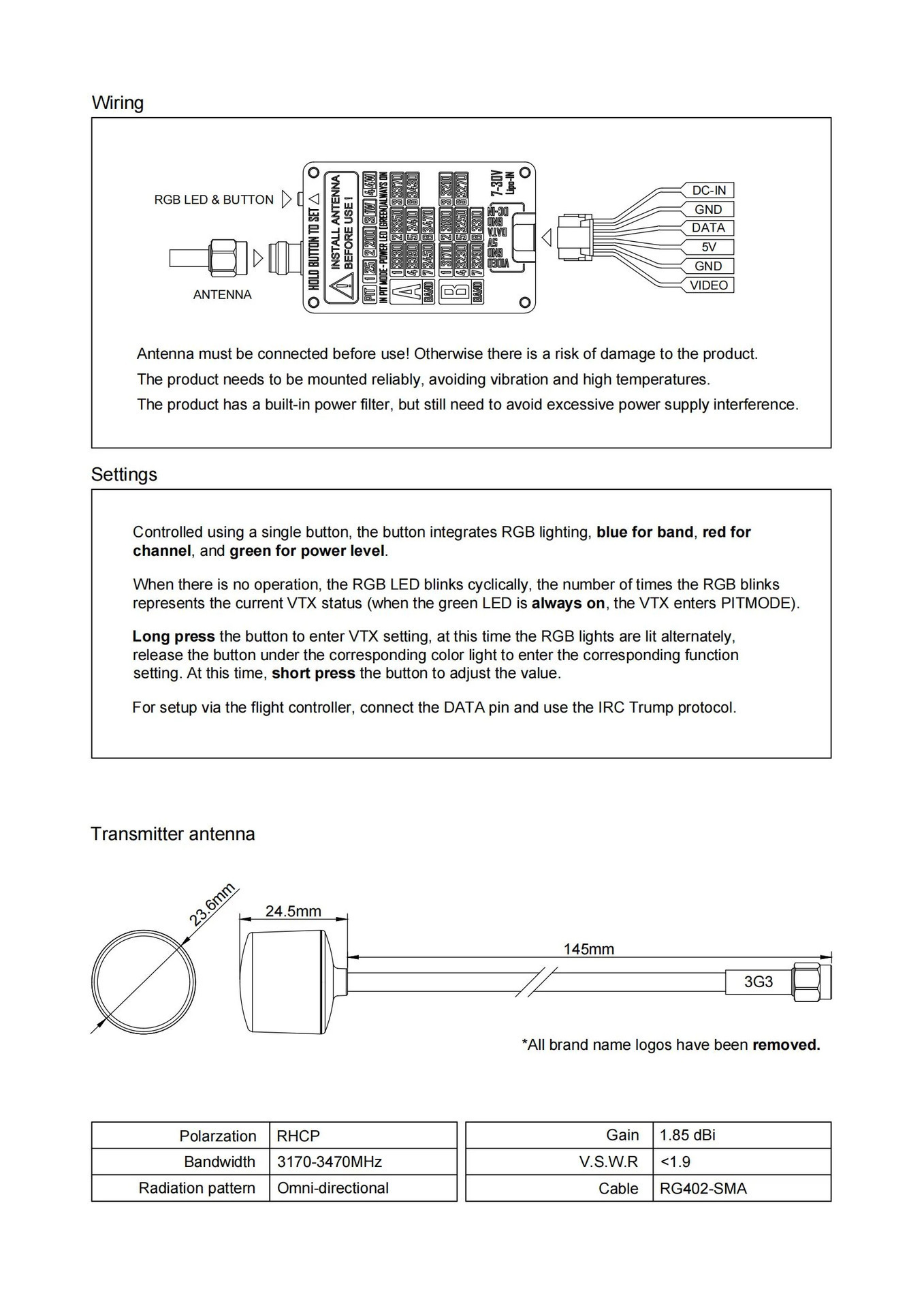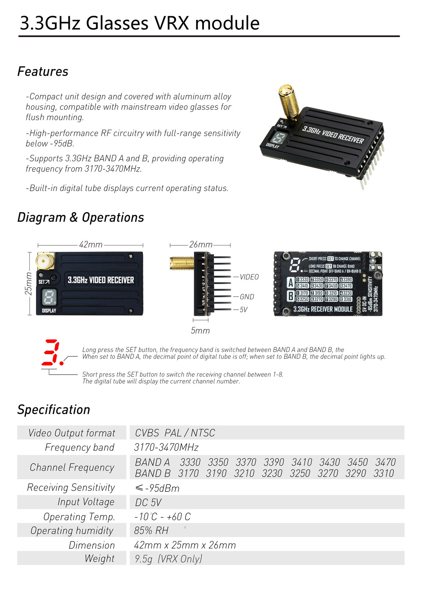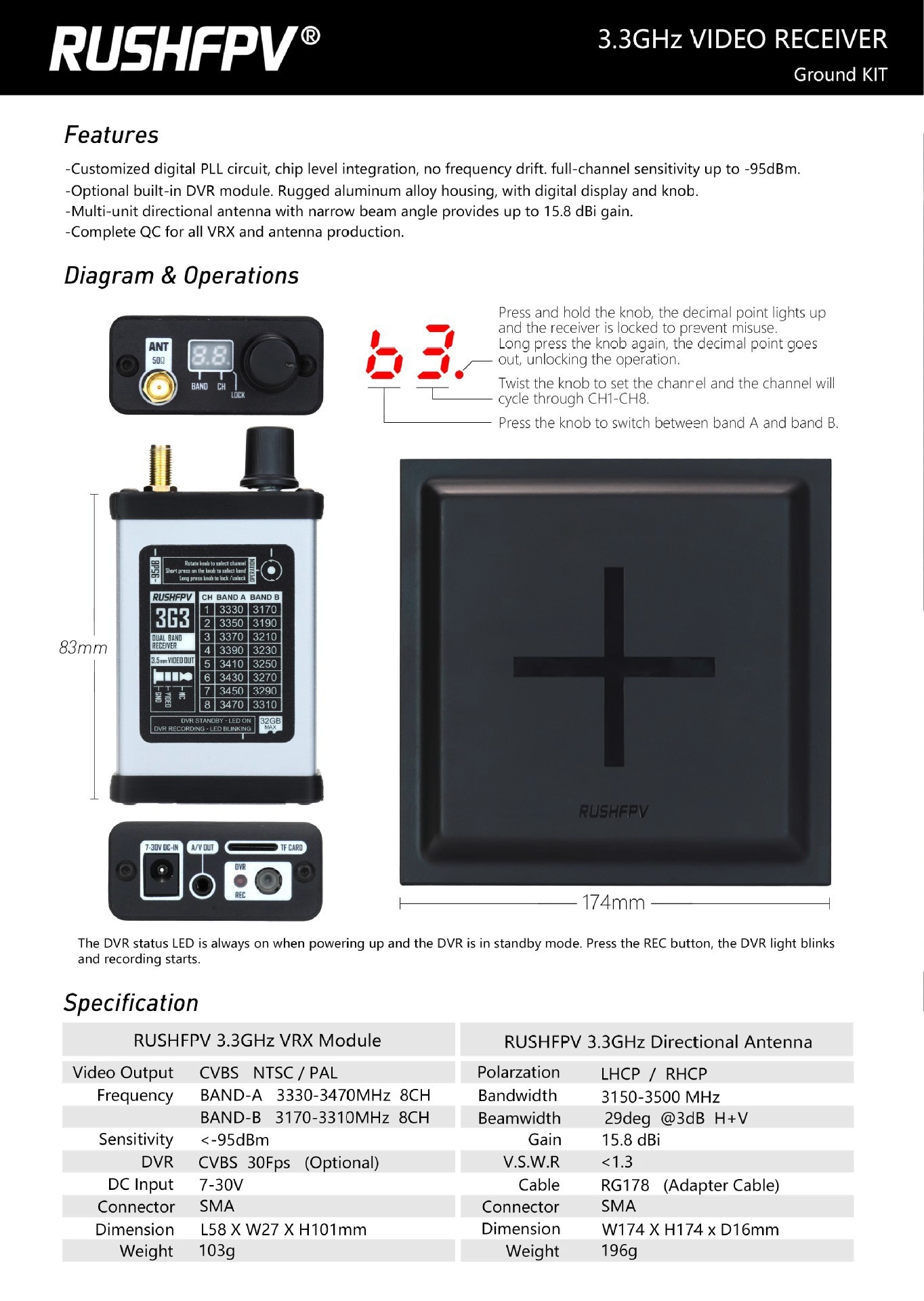 RUSHFPV 3.3G 4W VTX VRX 图传发射 接收套装 视频眼镜模块带天线