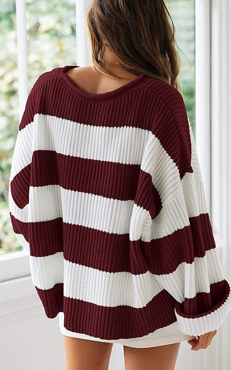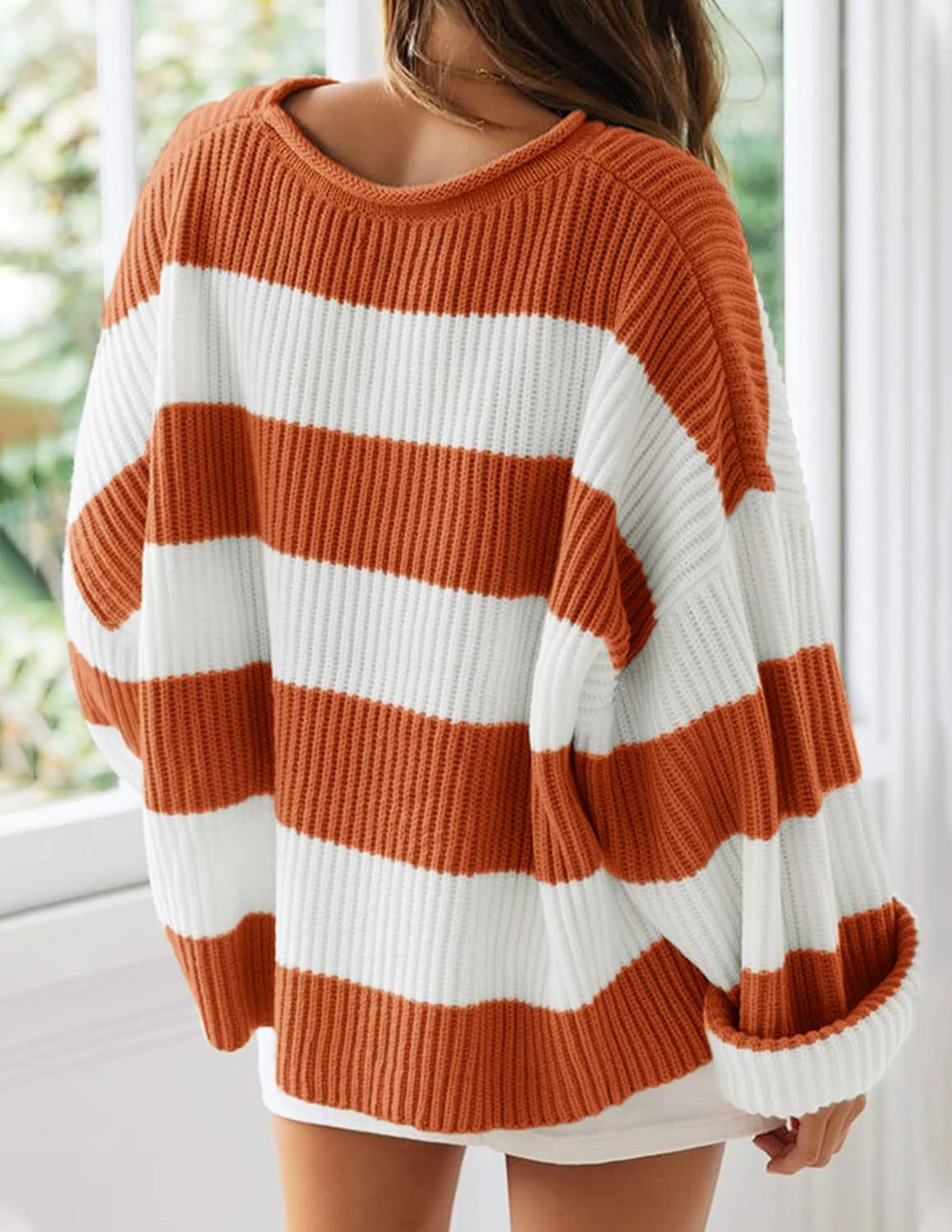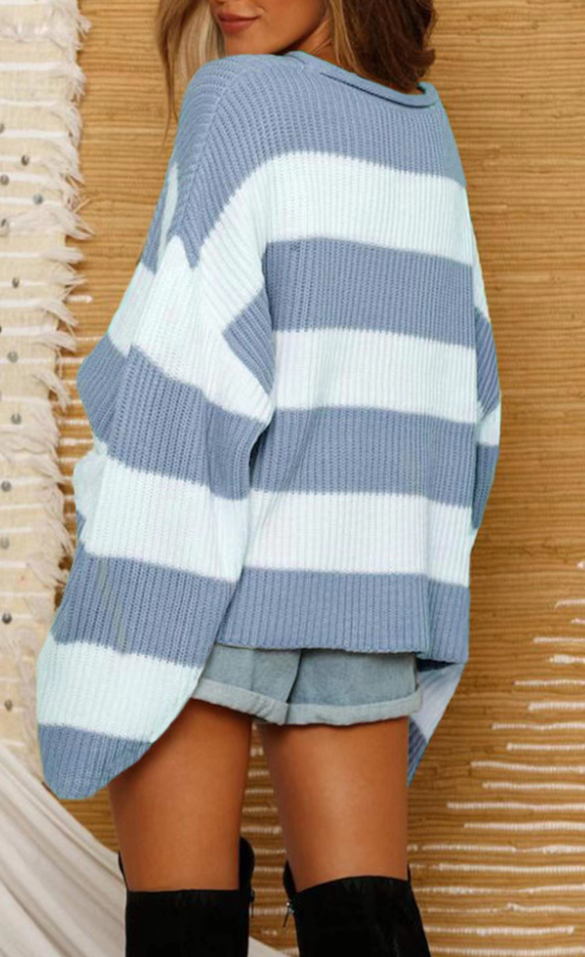 亚马逊2023秋冬圆领长袖条纹针织衫跨境欧美女装喇叭袖宽松毛衣女