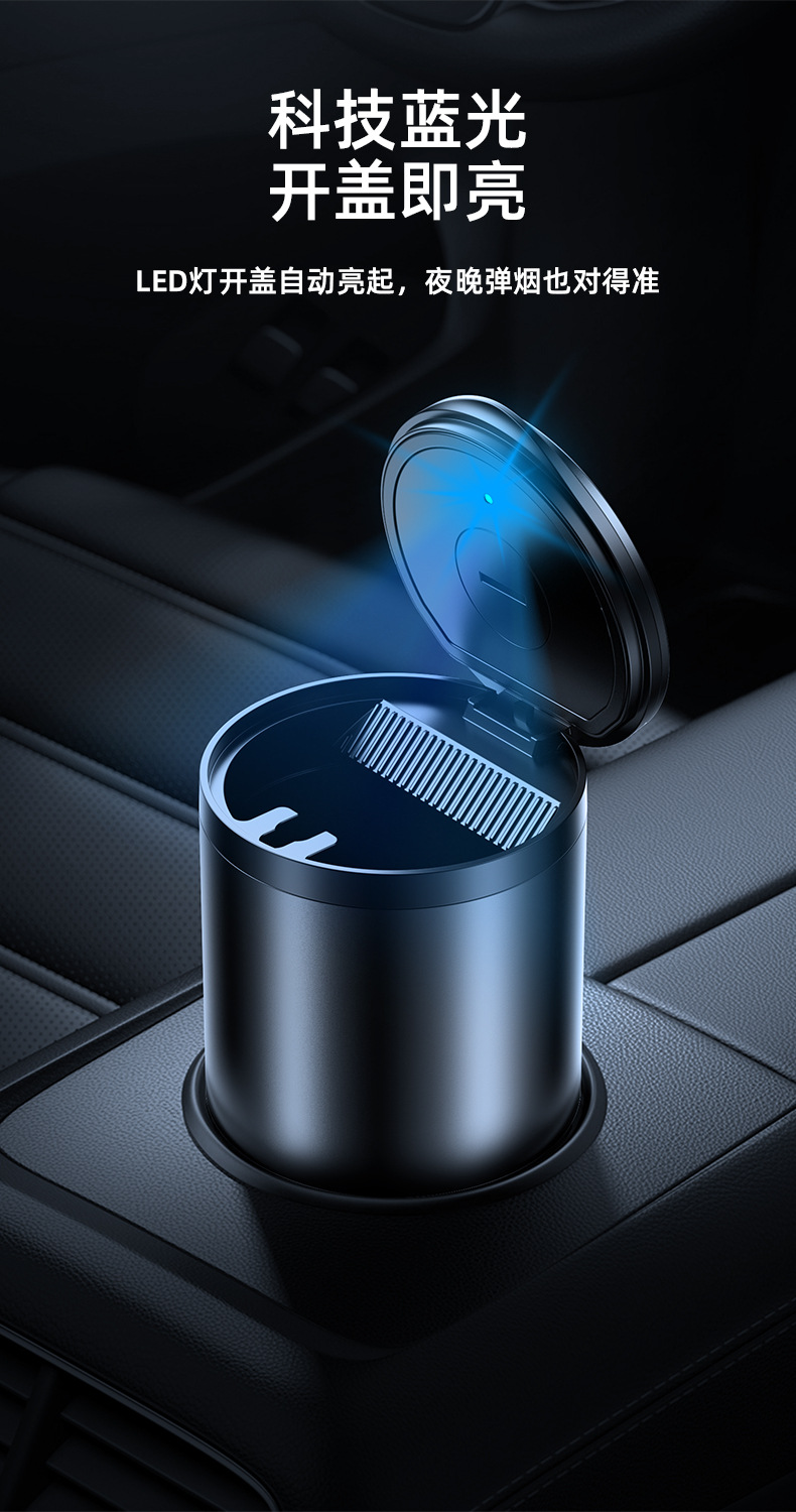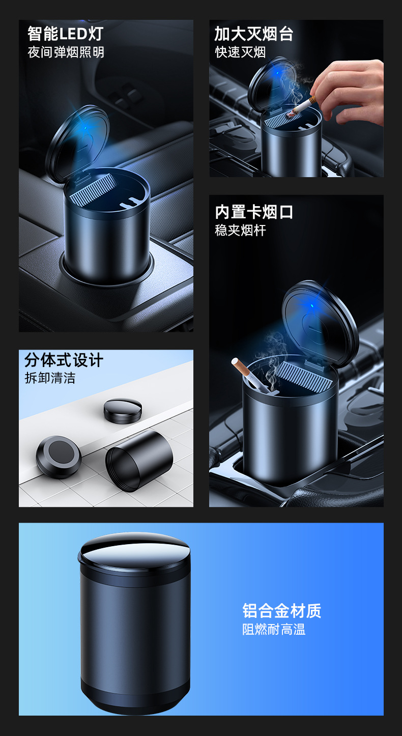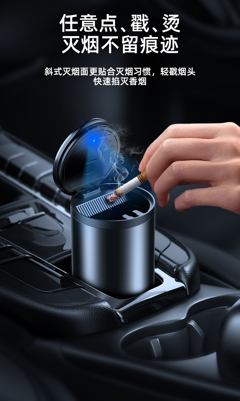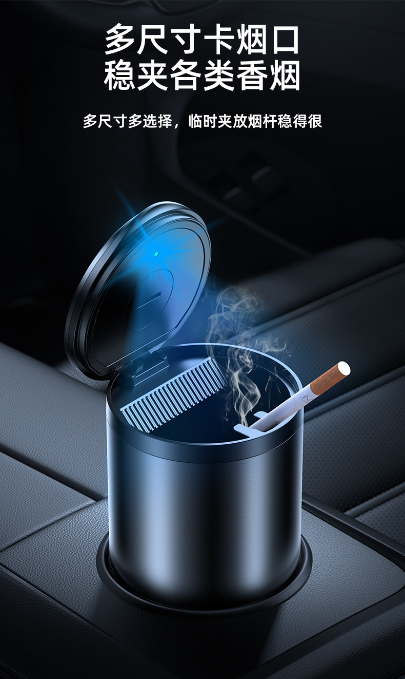 车载烟灰缸汽车高级感矮款防飞灰铝合金不锈钢带灯带盖带车标logo
