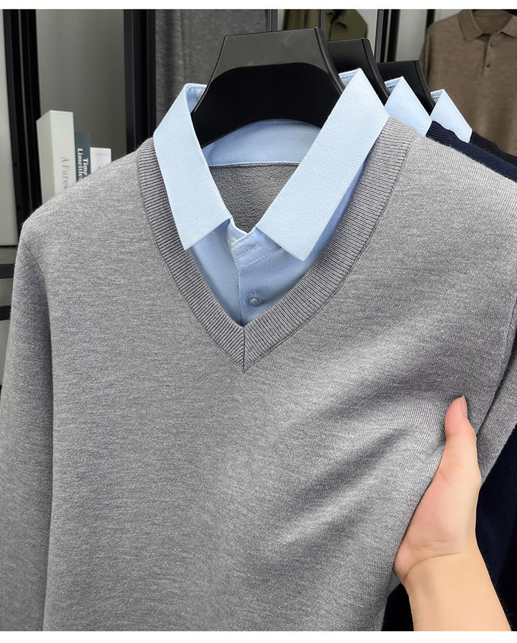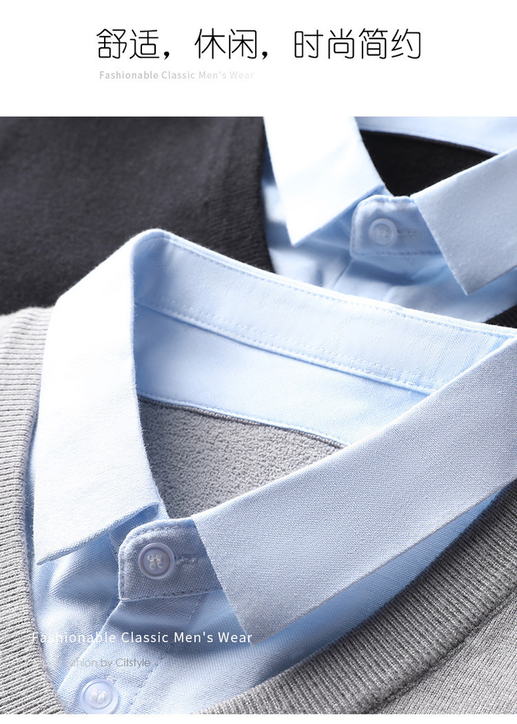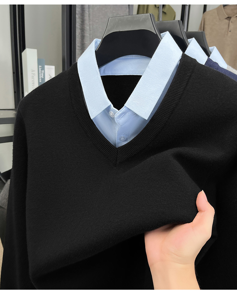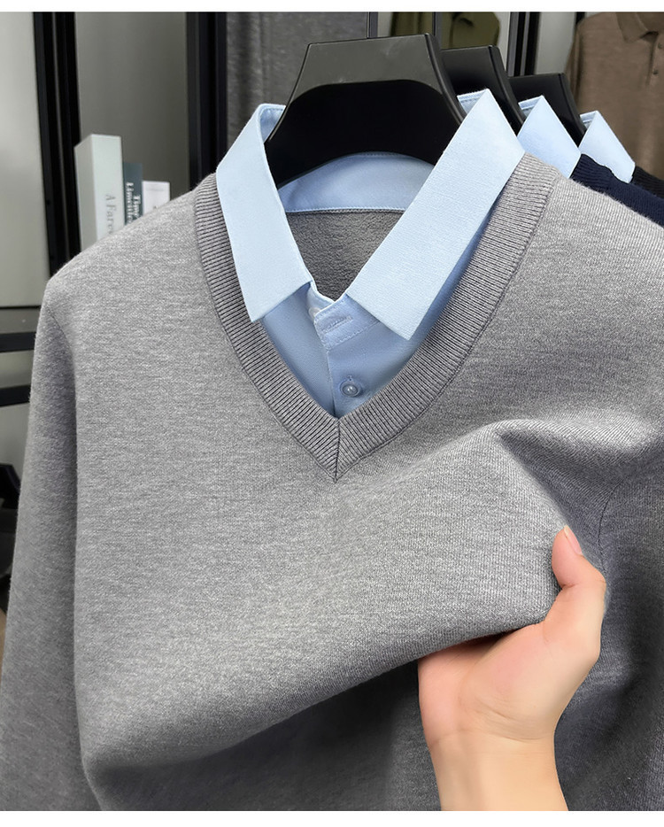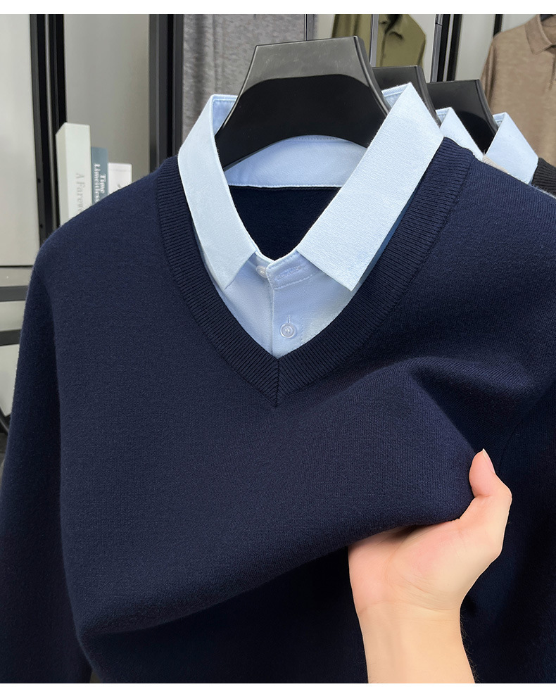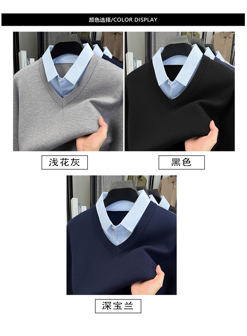 2025秋冬一体绒加绒加厚600克毛衣男针织假两件衬衫领纯色打底衫
