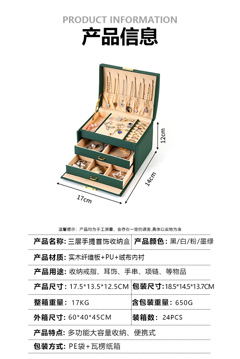 欧式轻奢三层首饰盒PU珠宝手提收纳盒复古感饰品展示盒桌面摆件