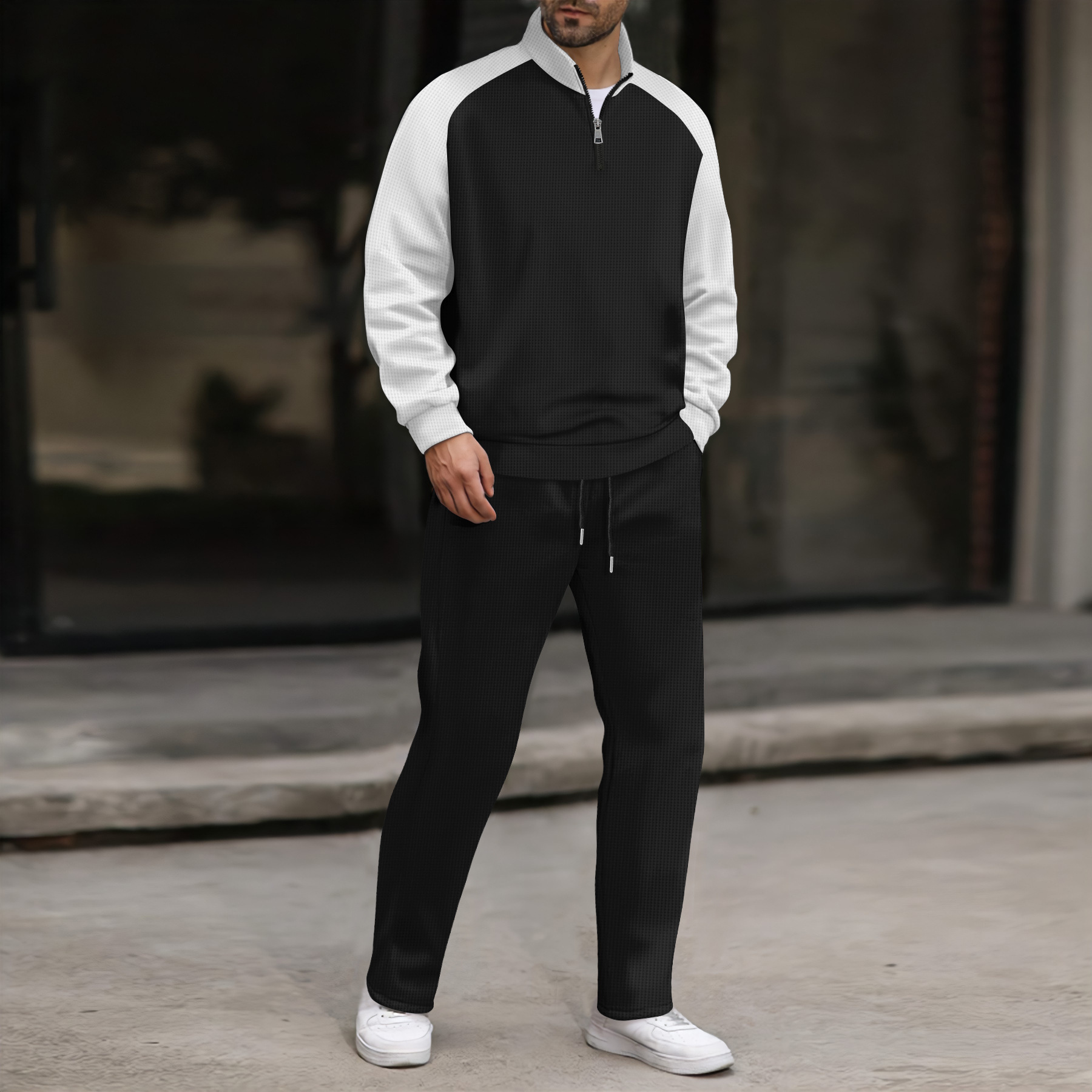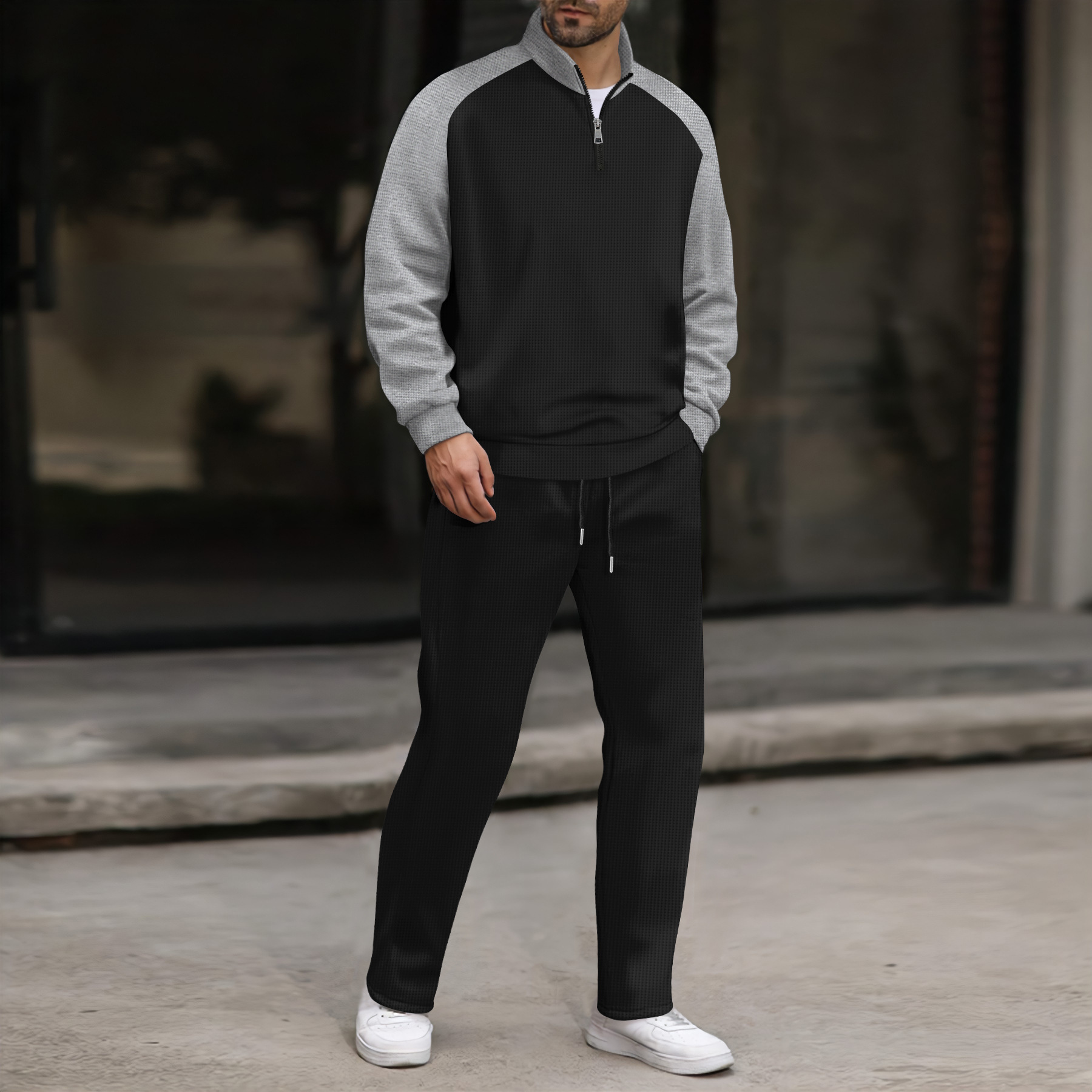 新款男士卫衣立领半拉链长袖上衣跨境潮流秋冬百搭黑色长裤套装