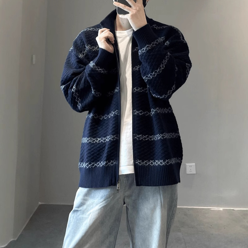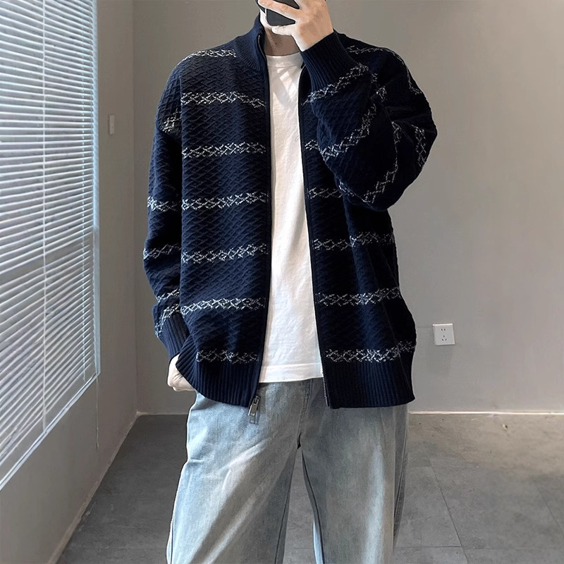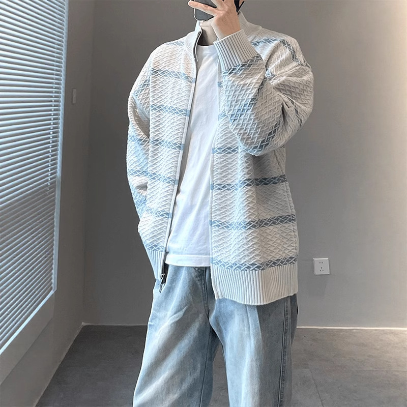 蓝白撞色条纹针织衫男款秋季穿搭潮牌高级感立领格纹开衫毛衣外套