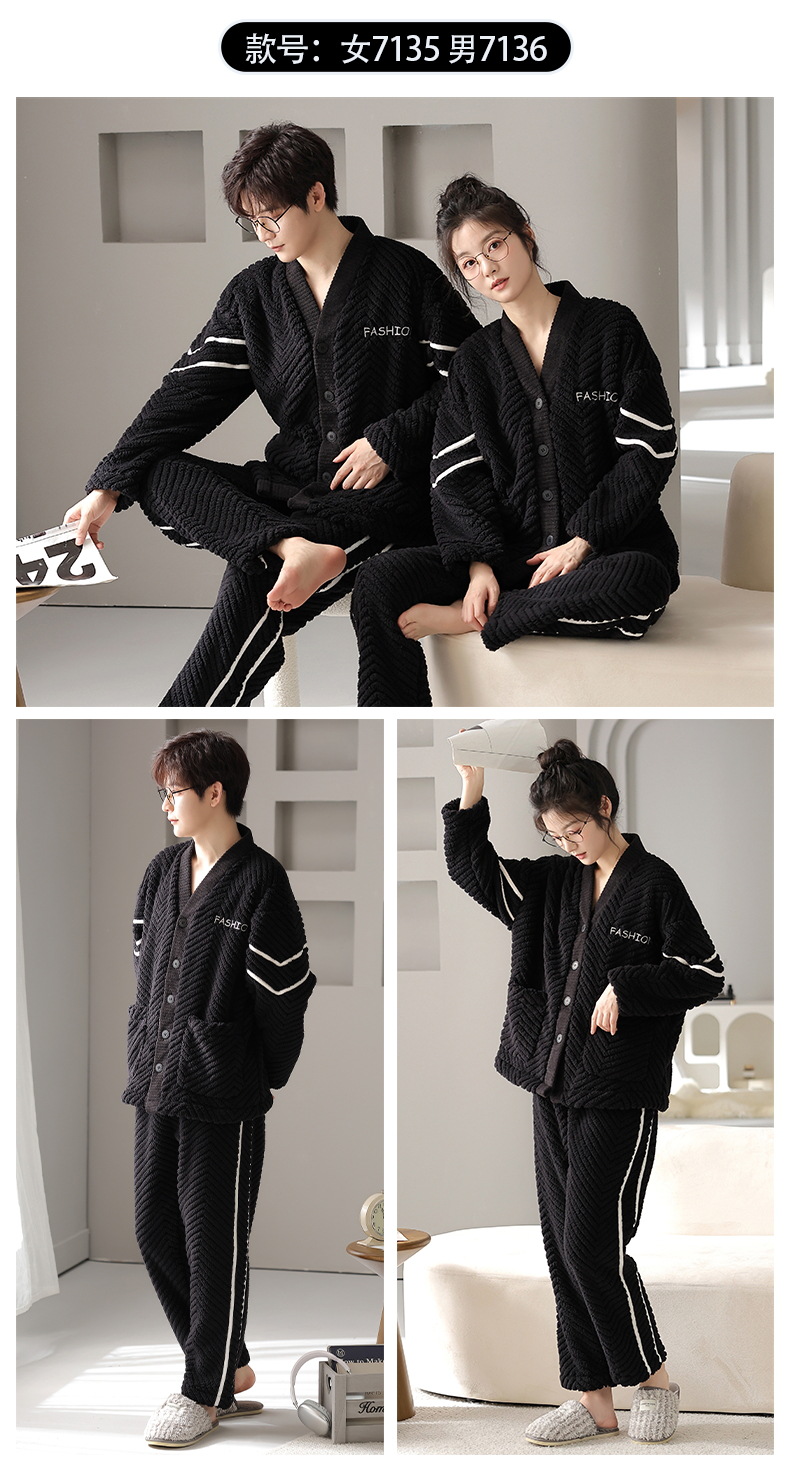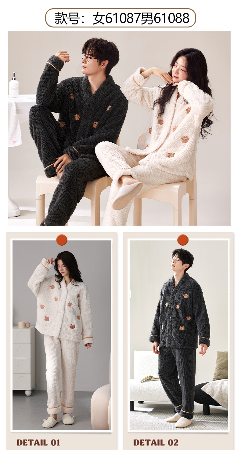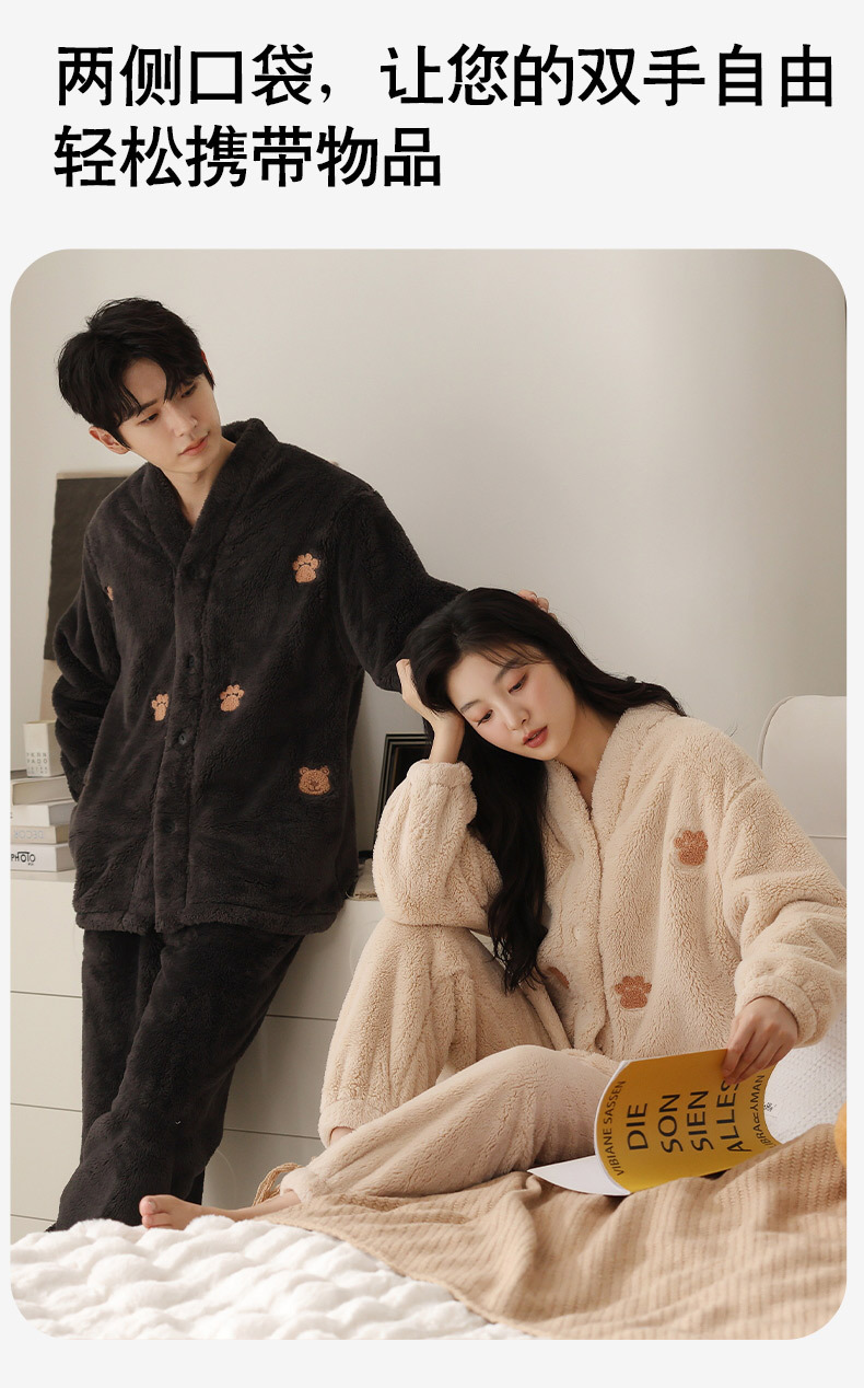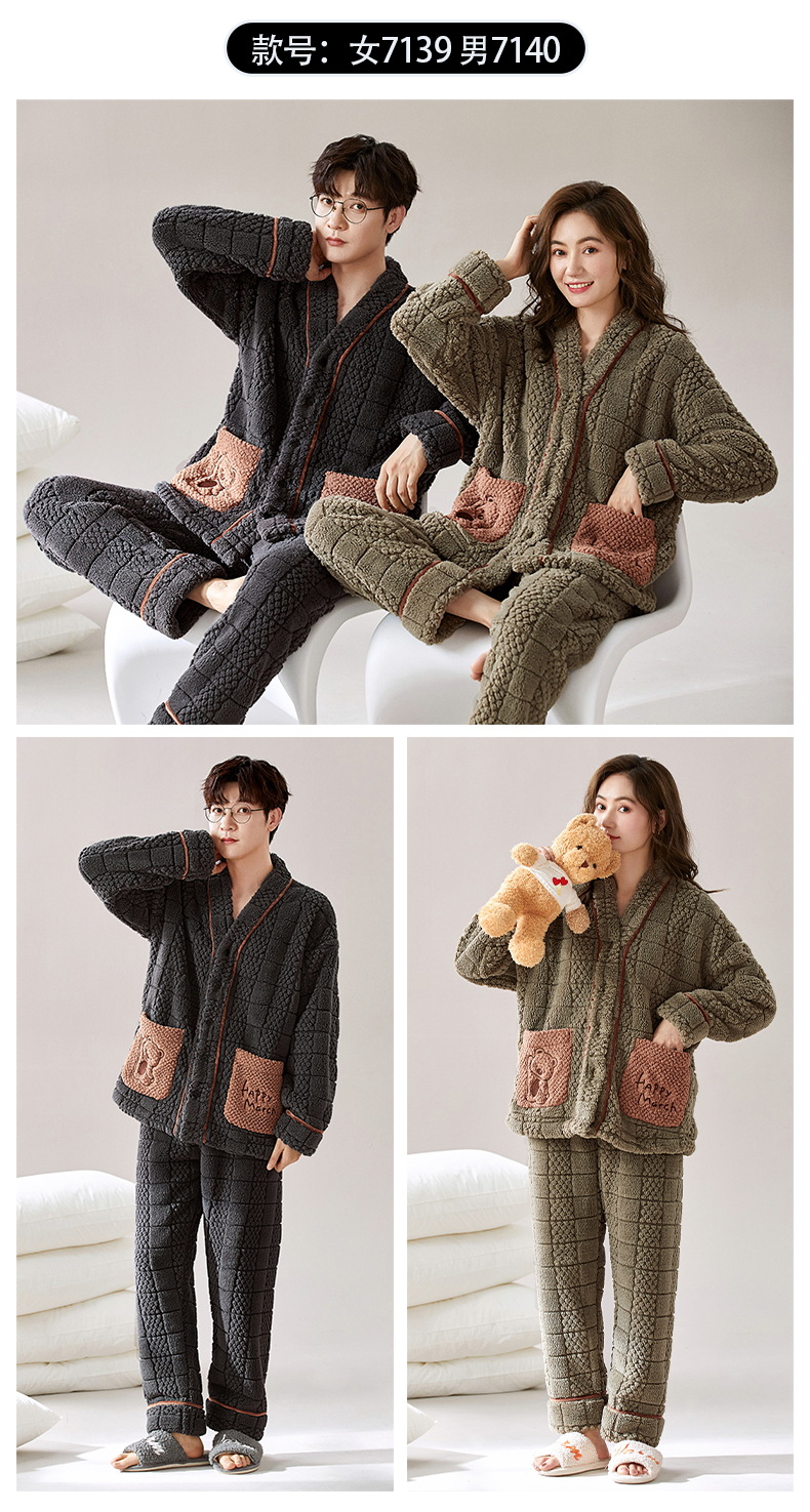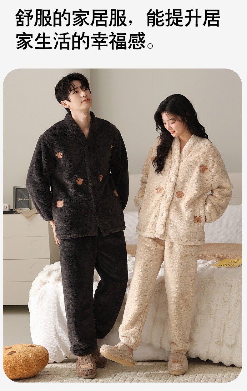情侣睡衣秋冬季珊瑚绒一男一女加绒加厚法兰绒冬款开衫家居服套装