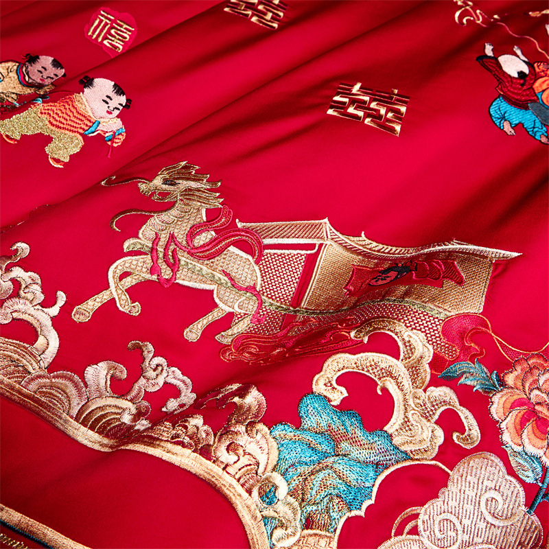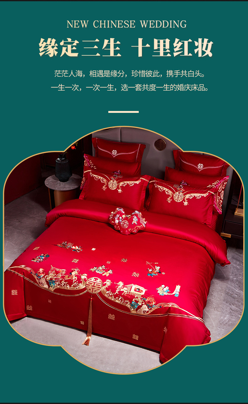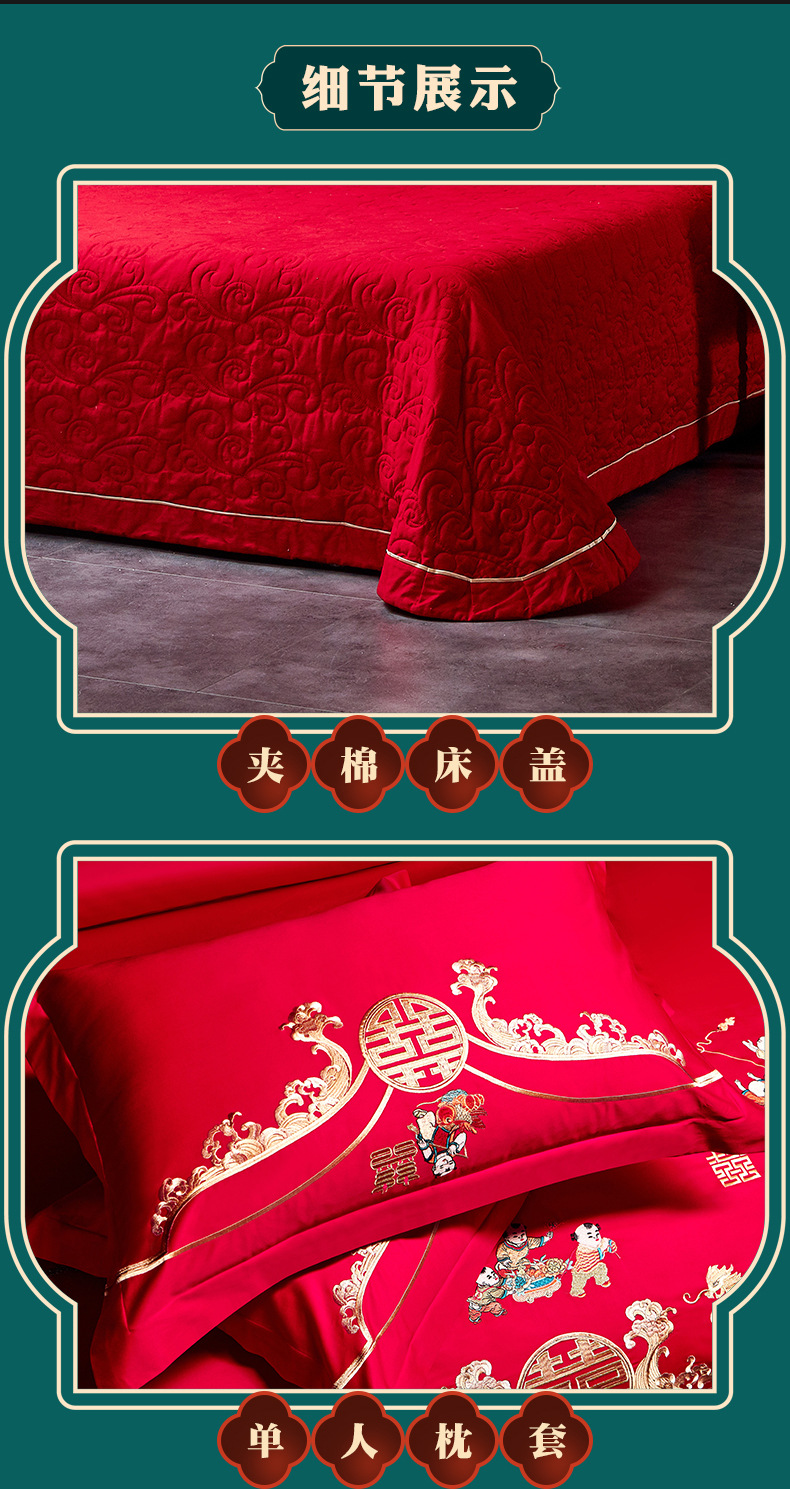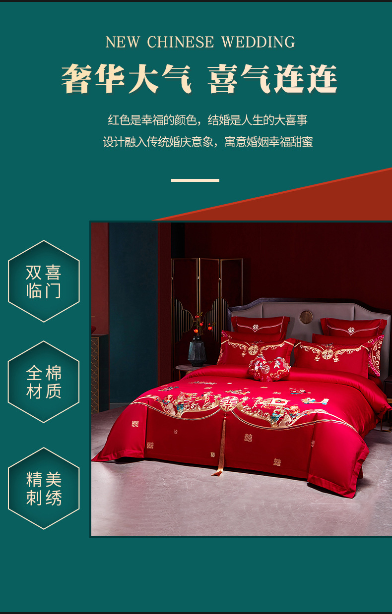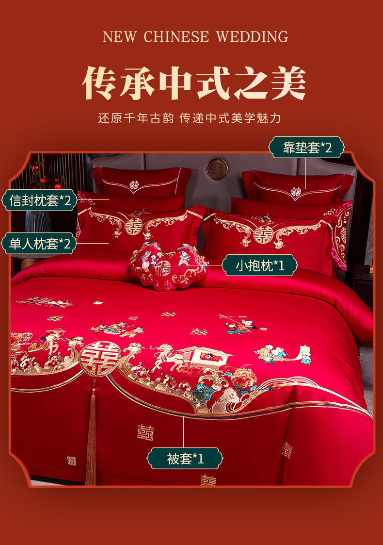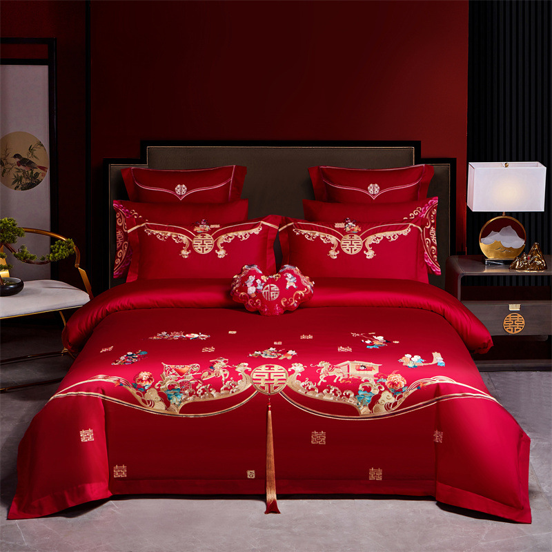 全棉长绒棉婚庆纯棉刺绣四件套婚嫁大红色喜被结婚床上用品十件套