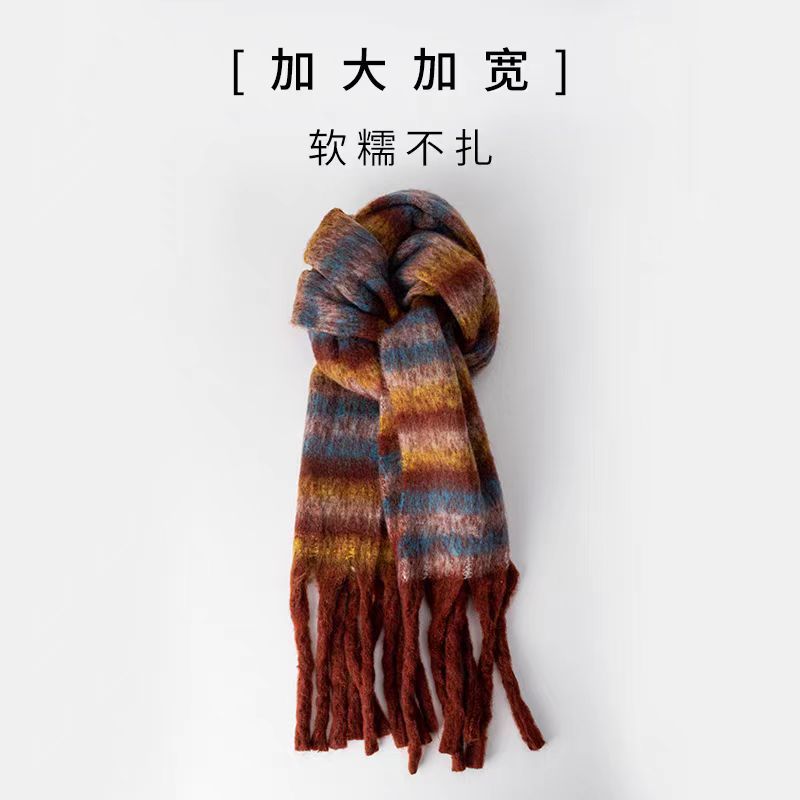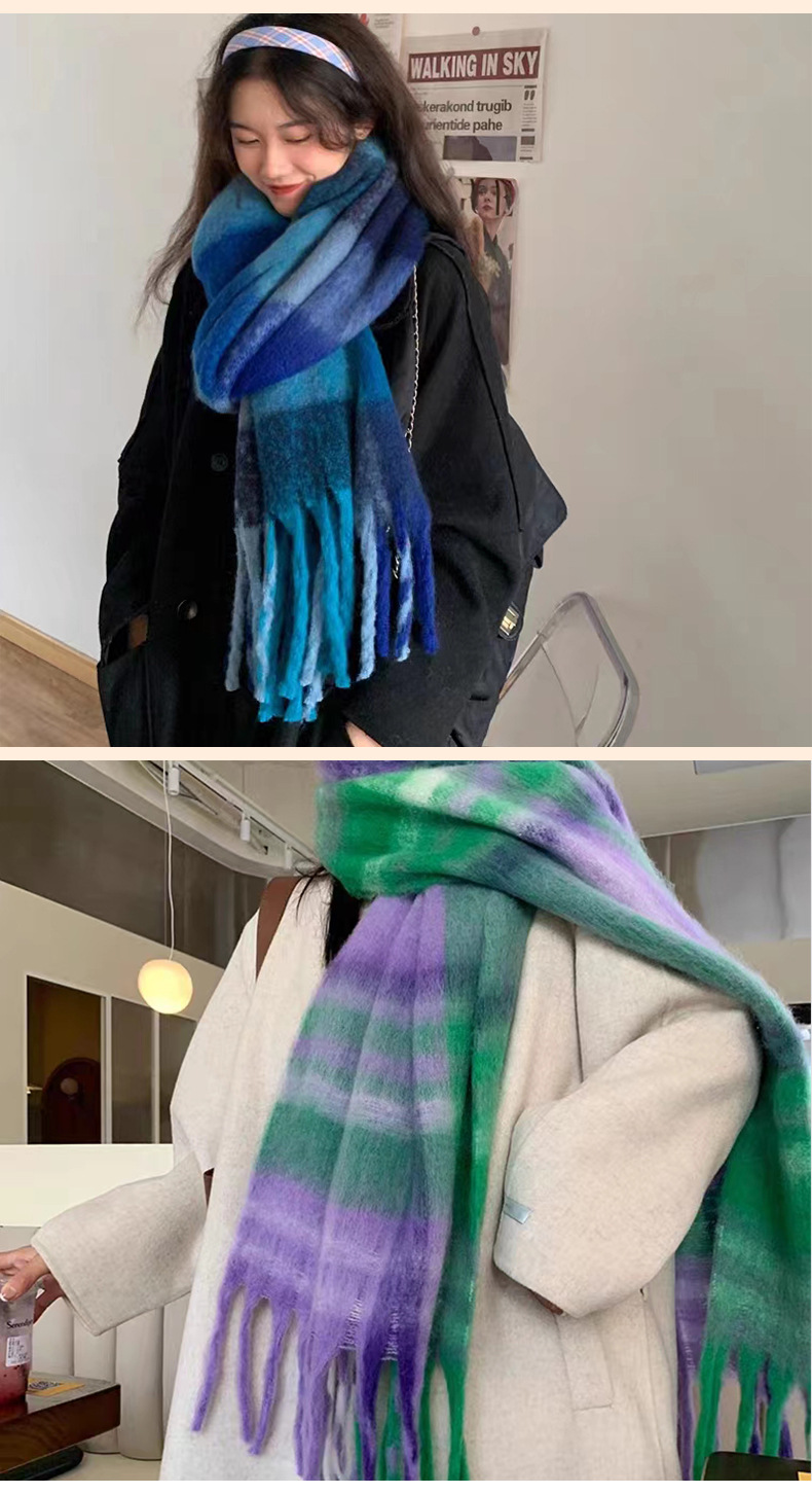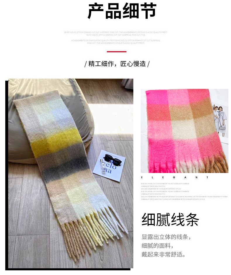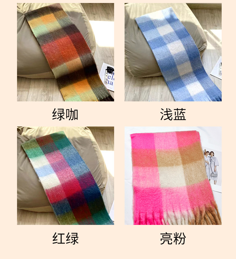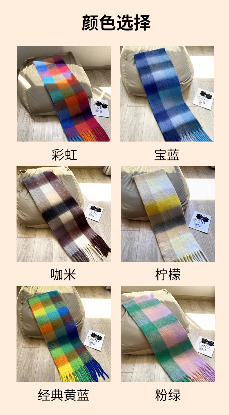 秋冬季彩虹格子保暖围巾甜美软糯长款马海毛流苏围脖复古