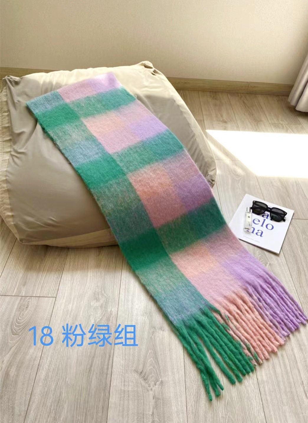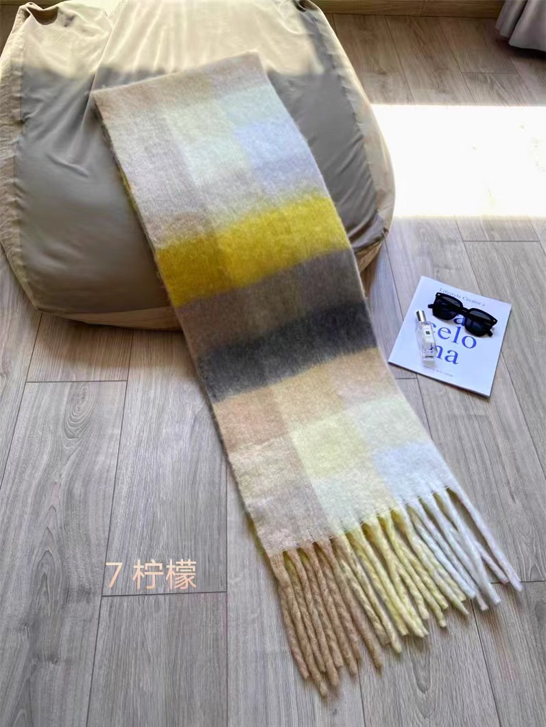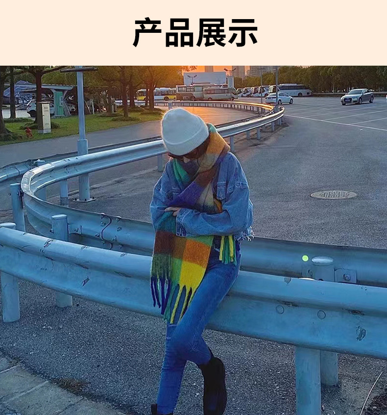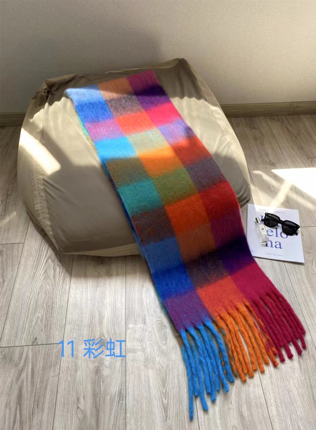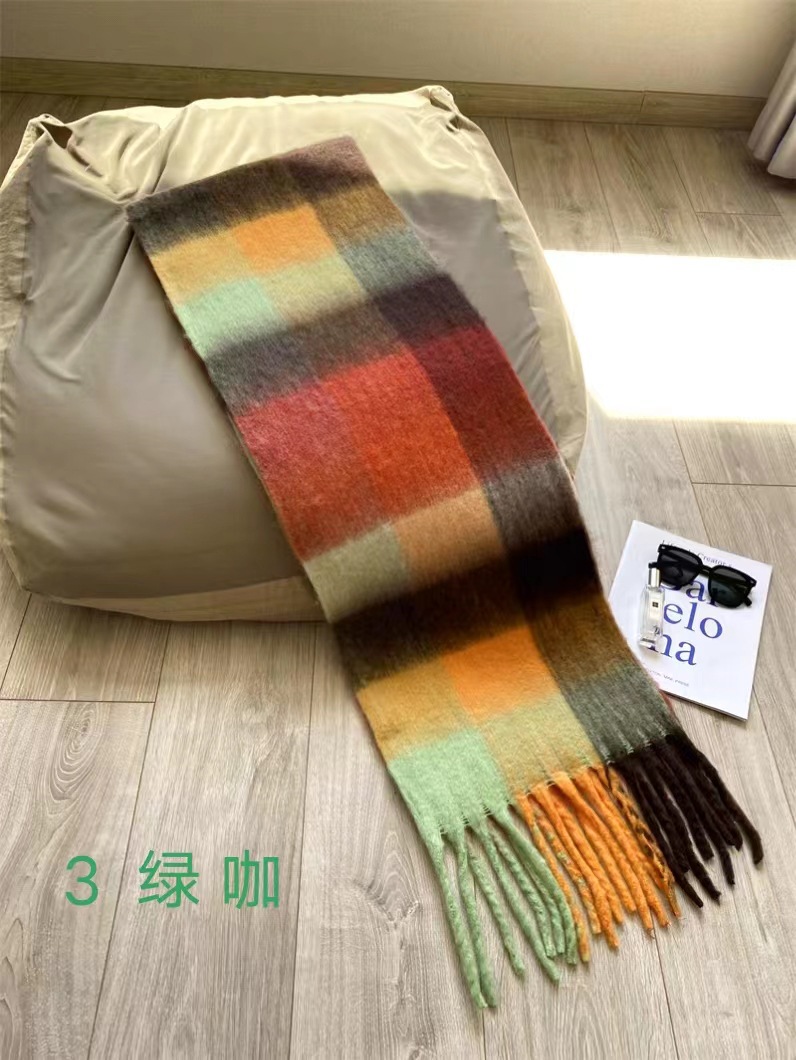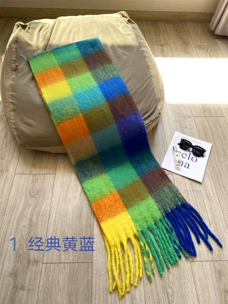 秋冬季彩虹格子保暖围巾甜美软糯长款马海毛流苏围脖复古