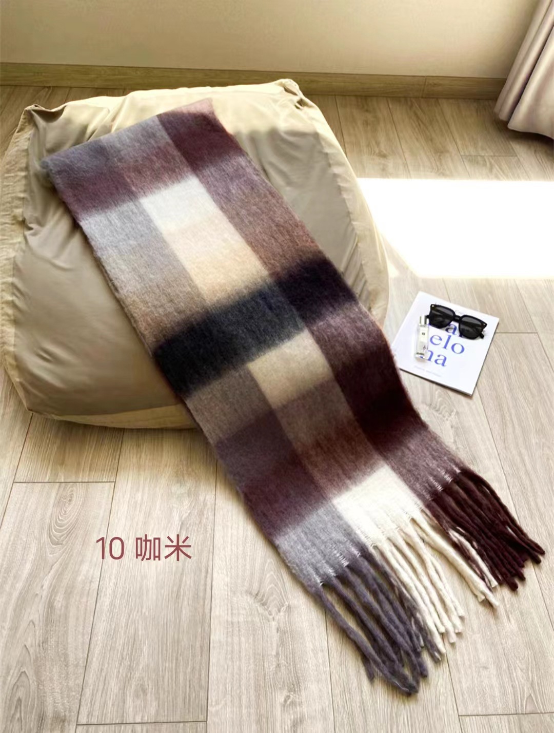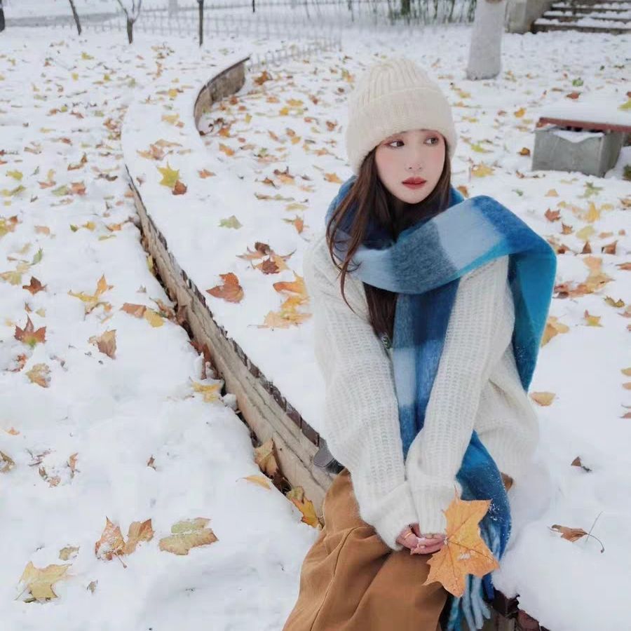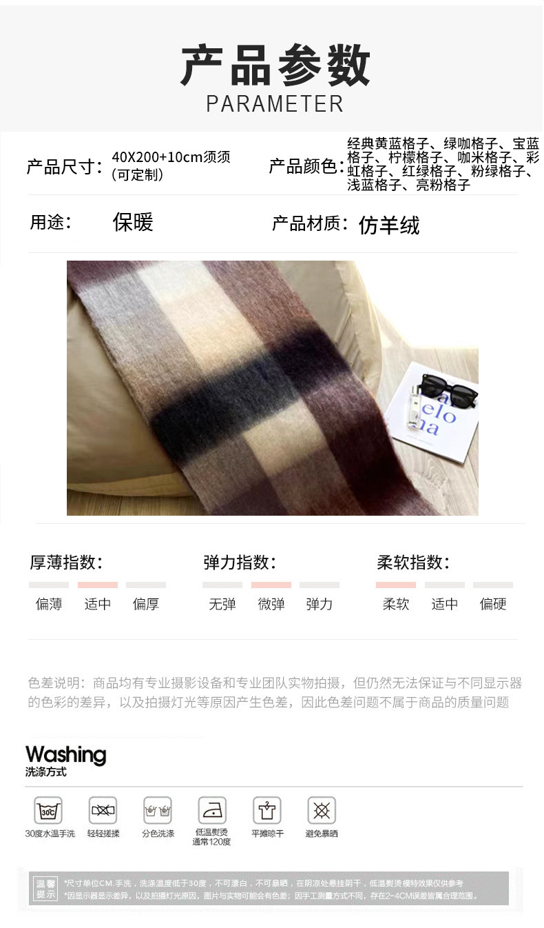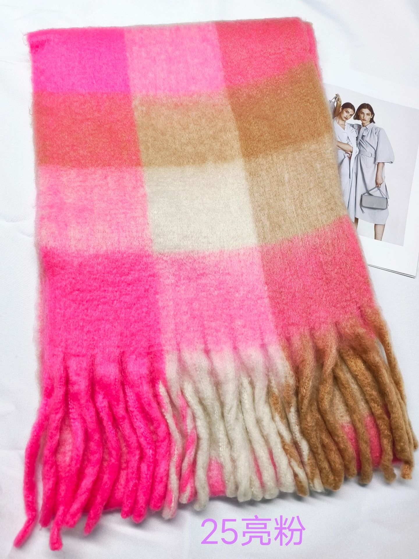 秋冬季彩虹格子保暖围巾甜美软糯长款马海毛流苏围脖复古