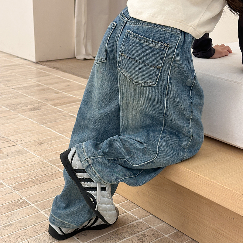艾摩贝贝高品质好版型中大小女童秋季洋气时髦复古拼接做旧牛仔裤