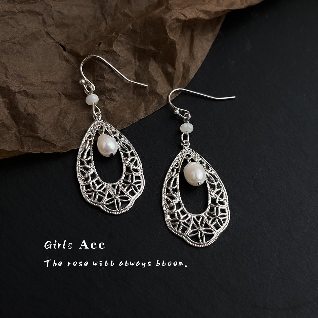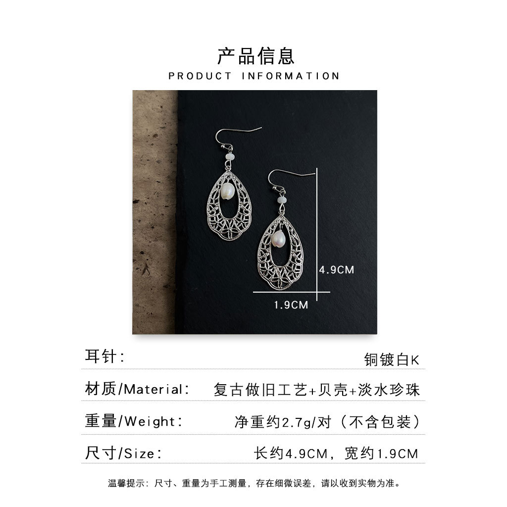 抹黑做旧镂空纹样耳环个性新中式淡水珍珠耳钉文艺复古民族风耳饰