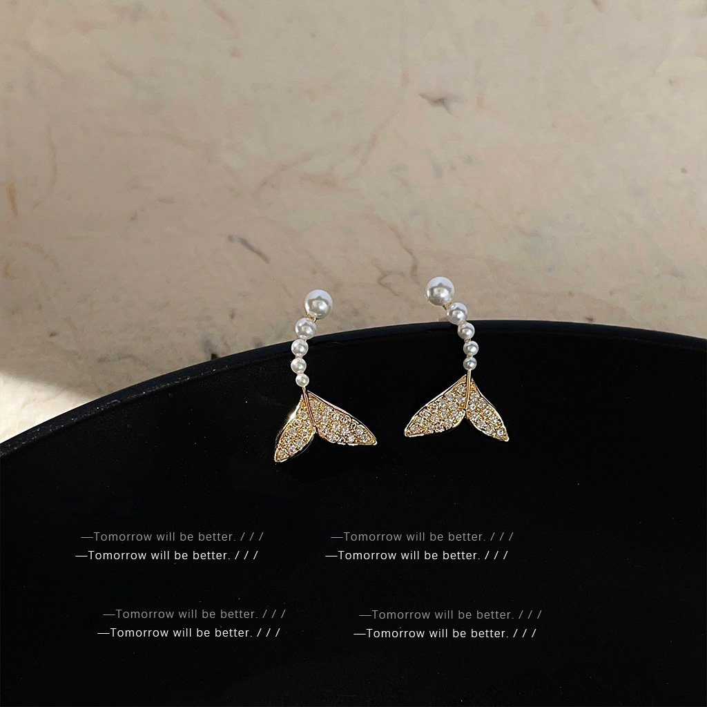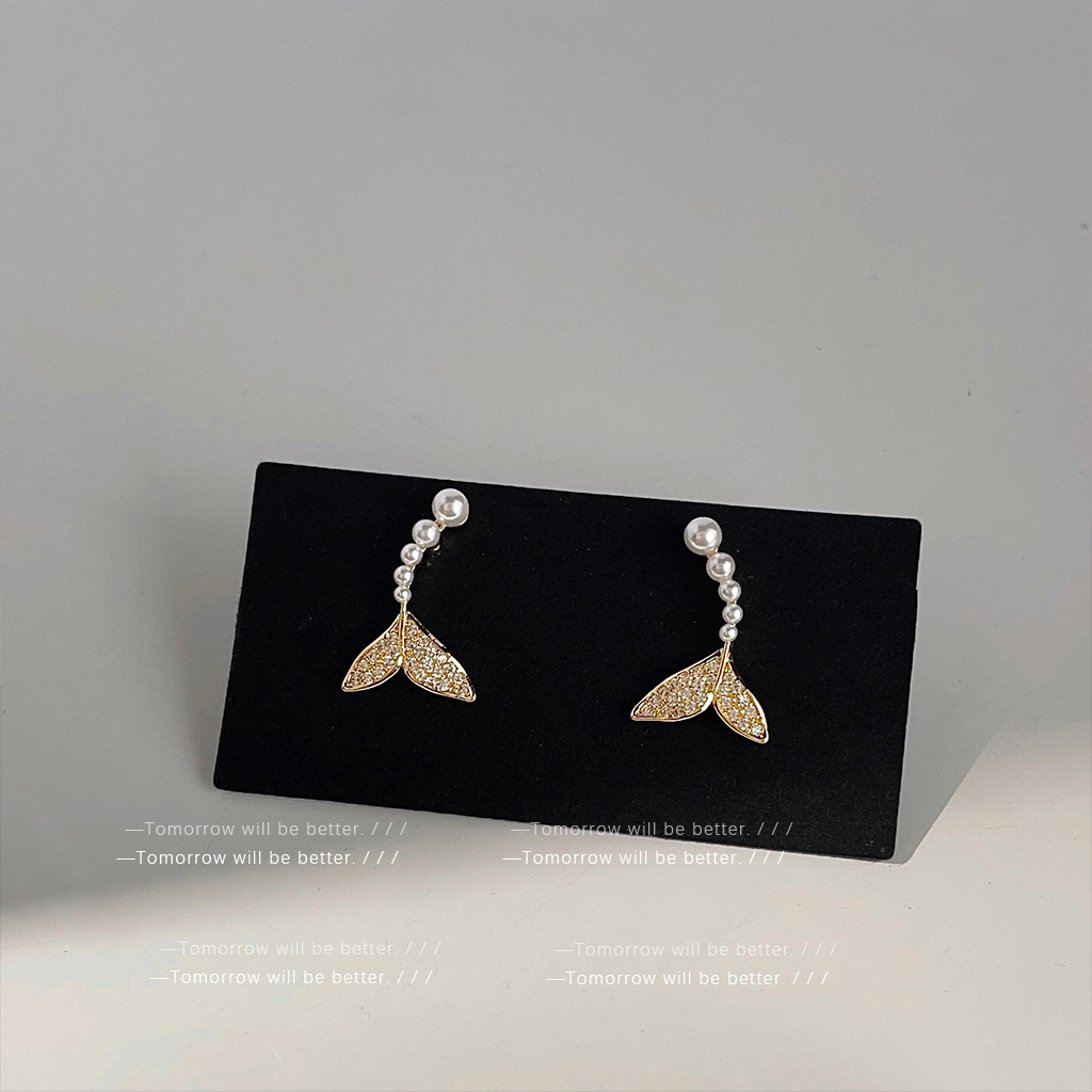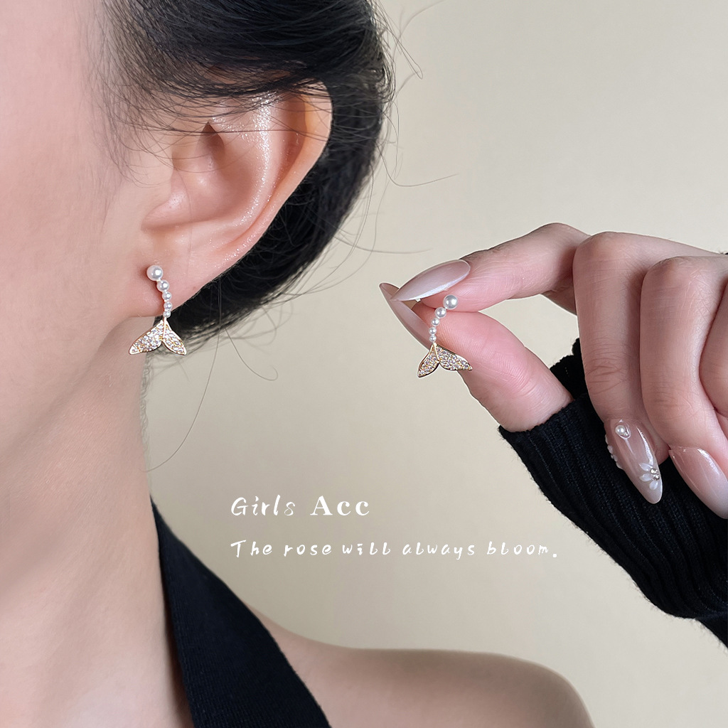 时尚高级感小珍珠鱼尾耳钉女小众设计感锆石耳环轻奢质感百搭耳饰