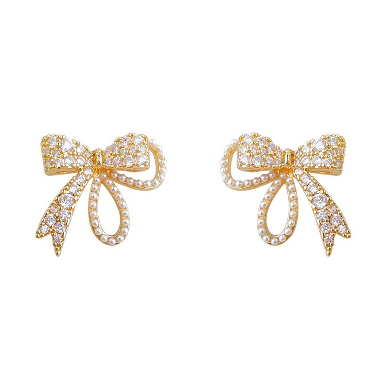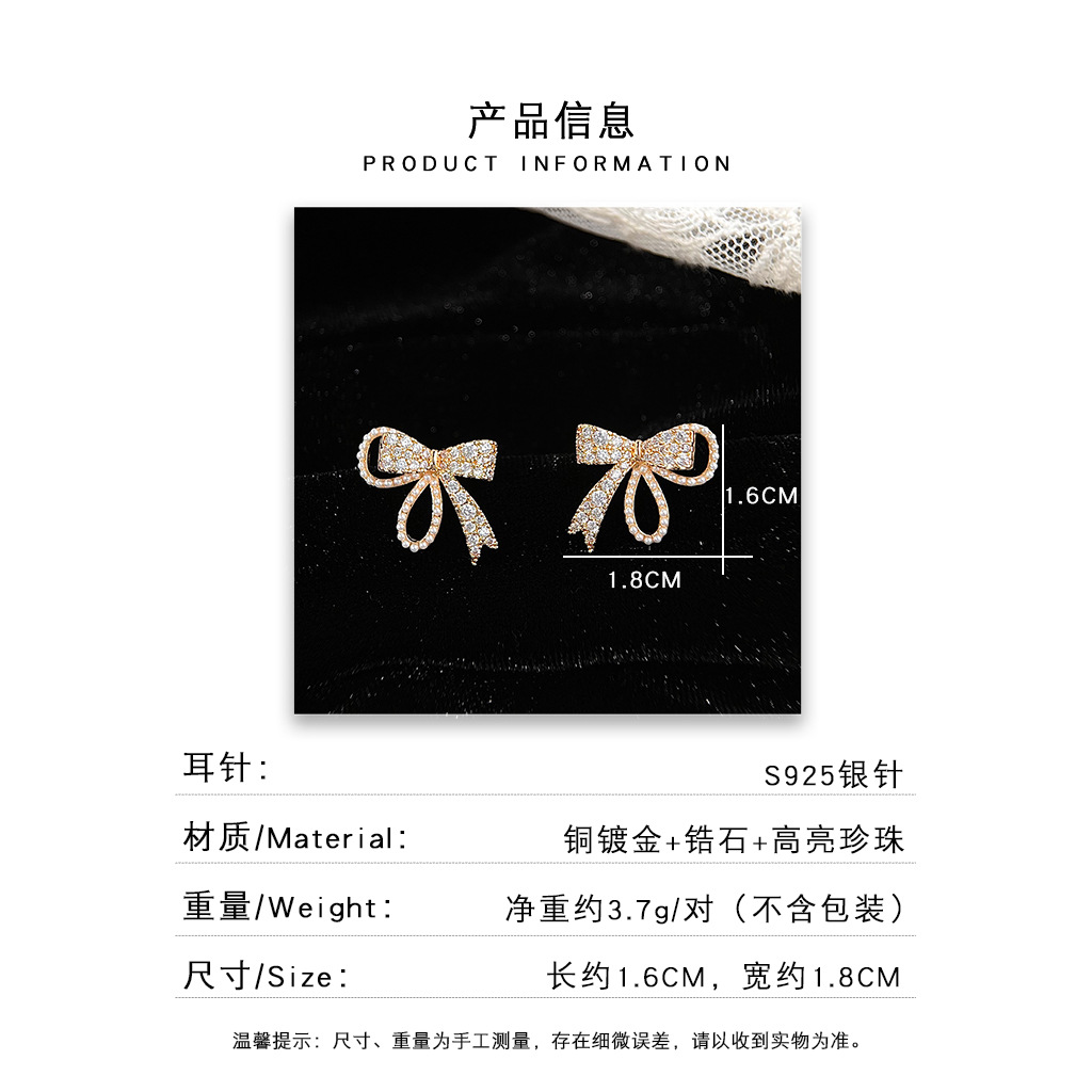 法式小香风蝴蝶结锆石耳钉时尚轻奢风气质简约珍珠耳环高级感耳饰