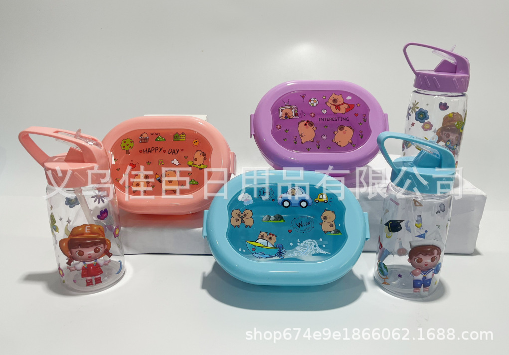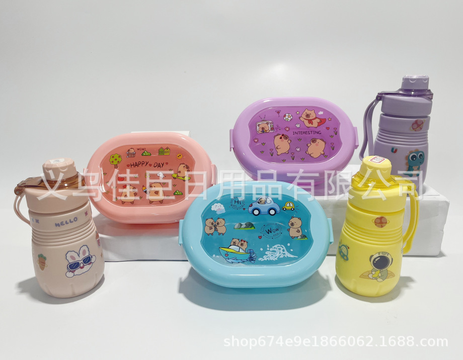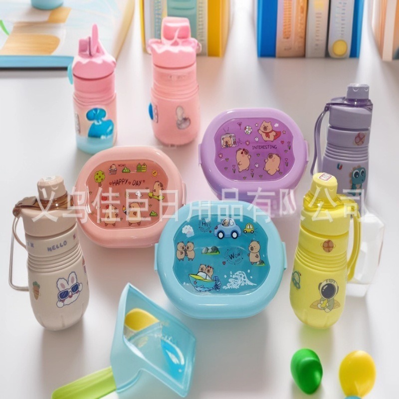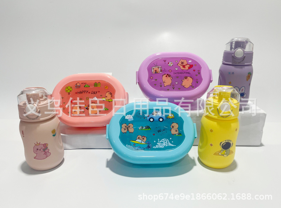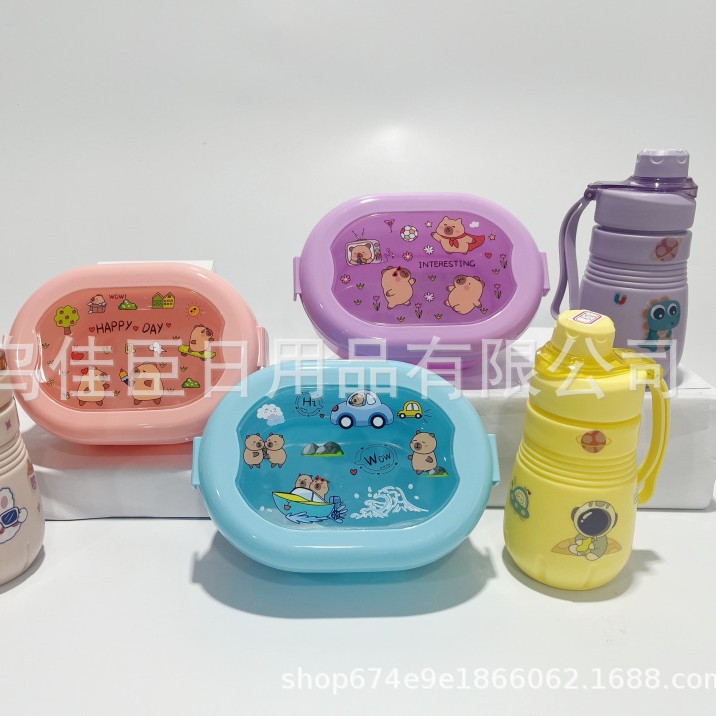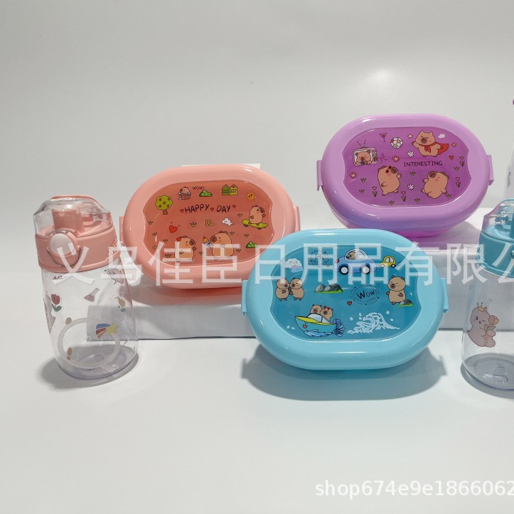 热销款学生卡通便当盒水壶饭盒套装卡皮巴拉分格款带餐具饭盒野餐