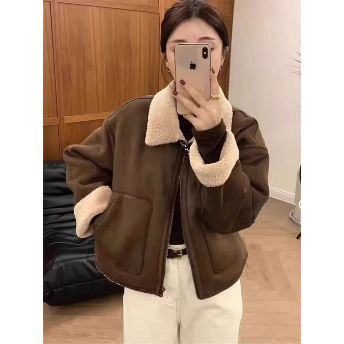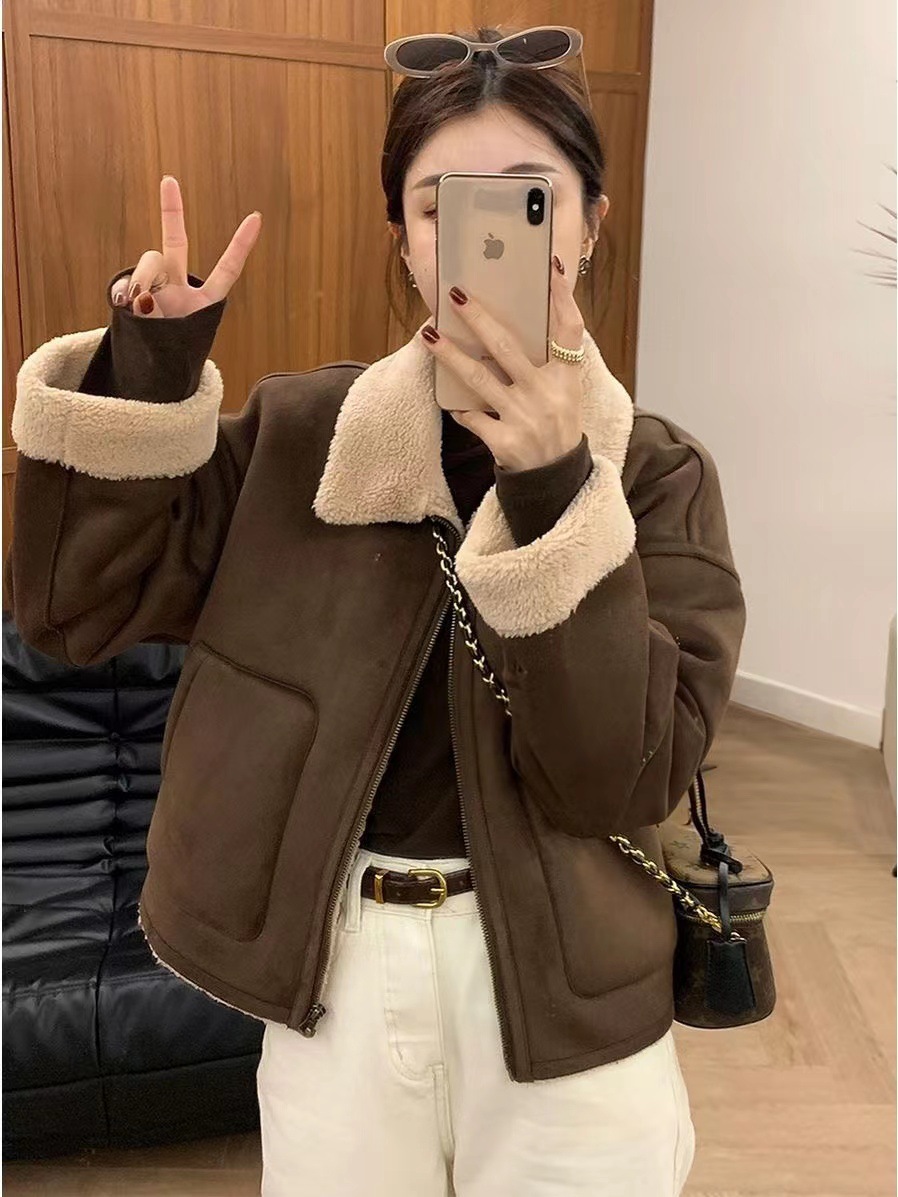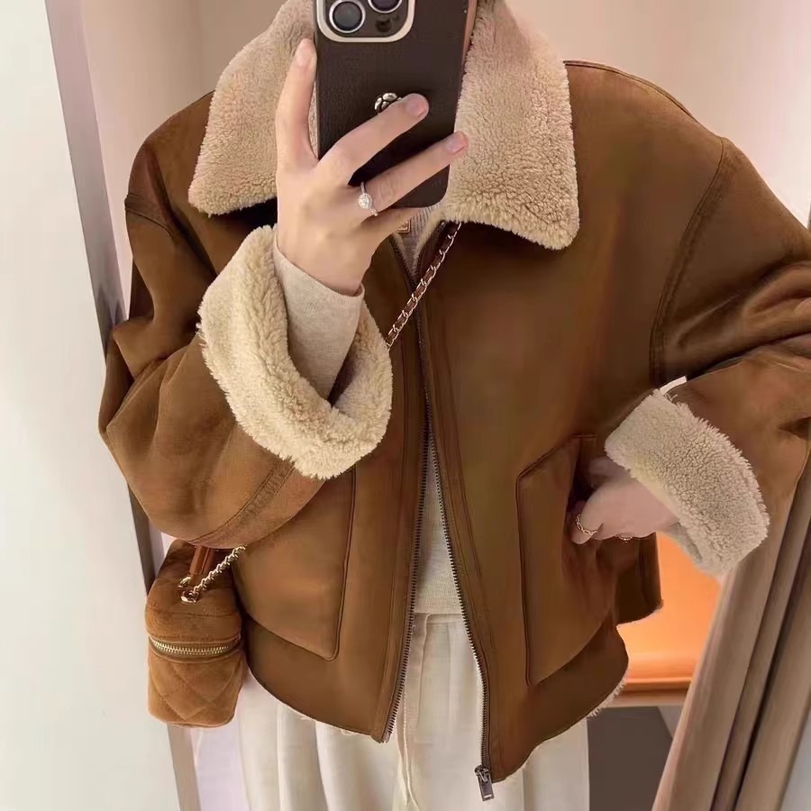 皮毛一体加厚羊羔毛外套女冬季设计感美式复古保暖短款翻领机车服