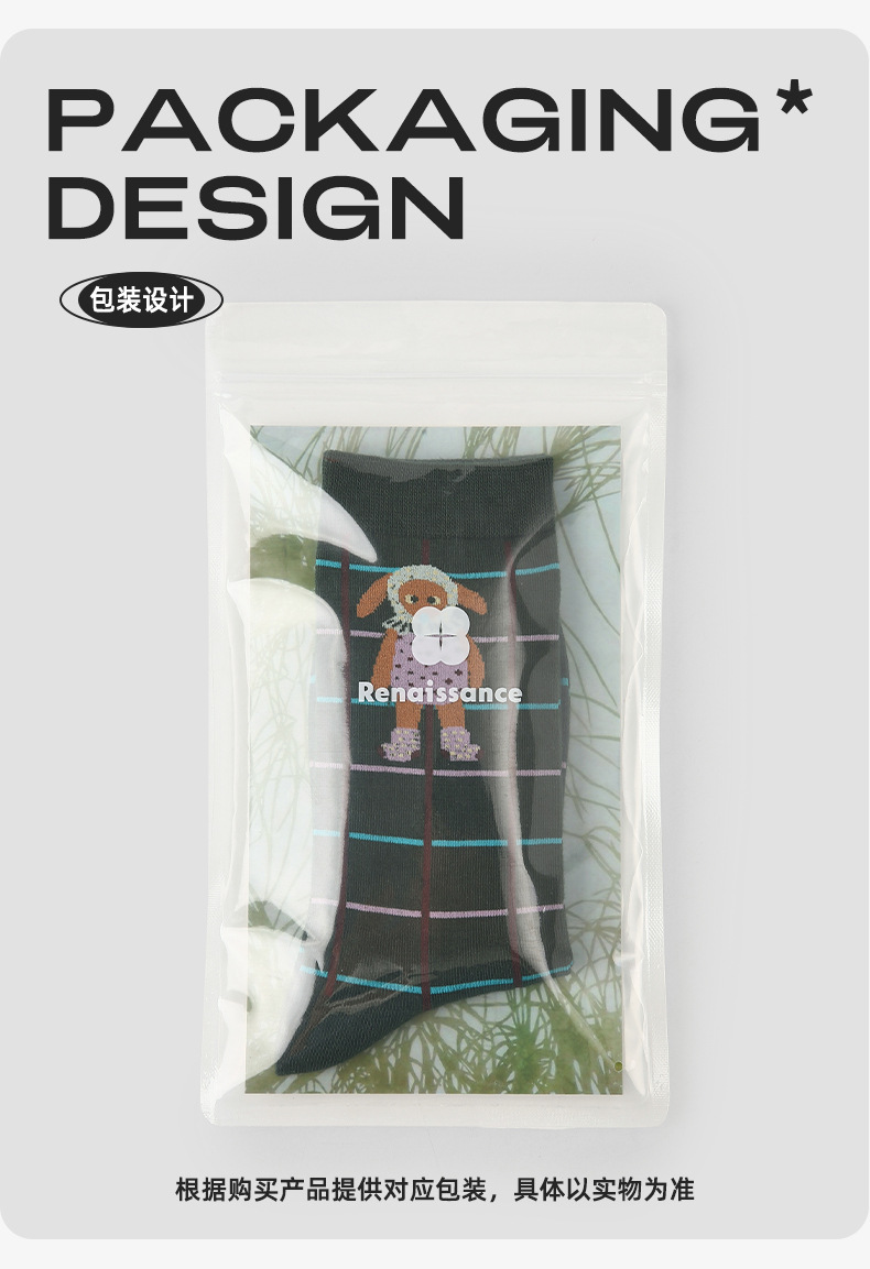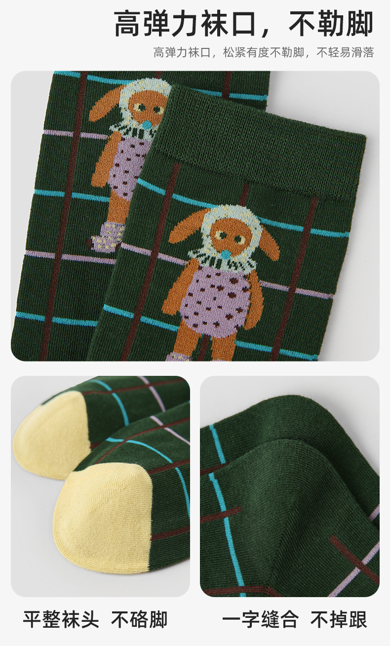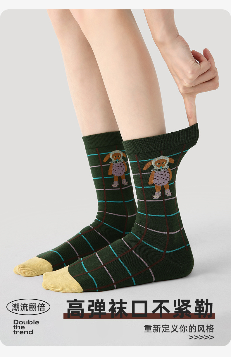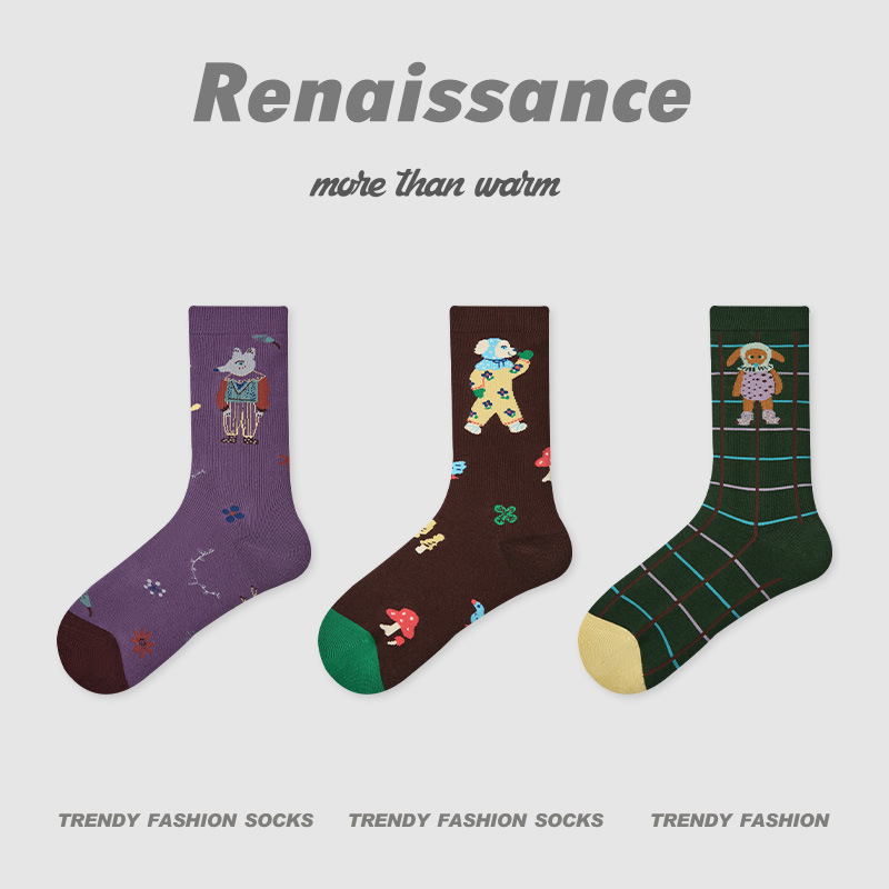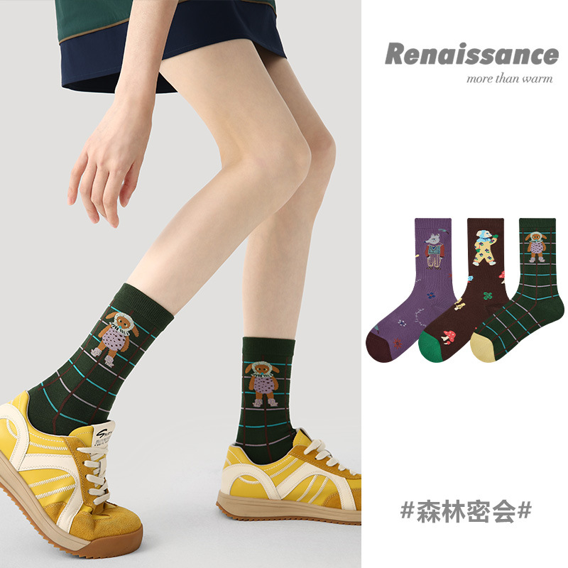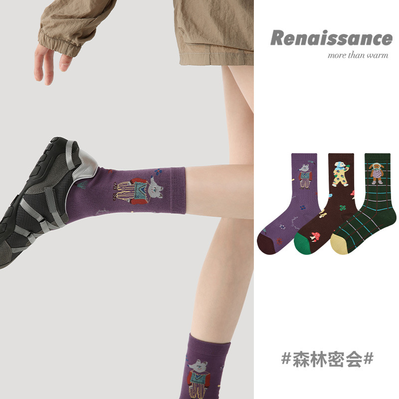 Renaissance袜子女ins潮秋冬新款精梳棉卡通动物条纹无骨中筒女袜