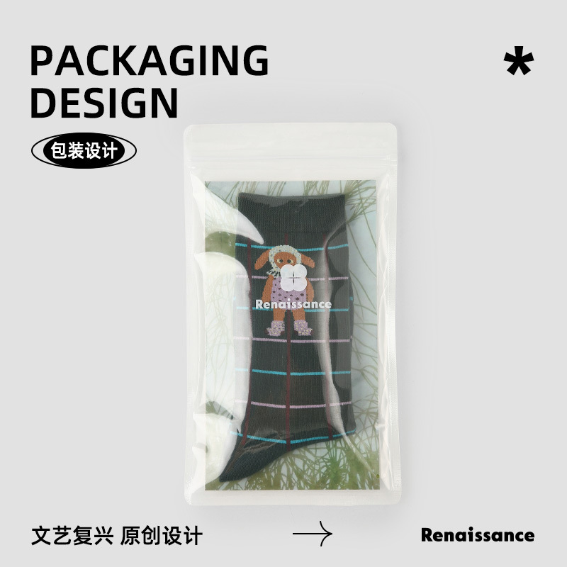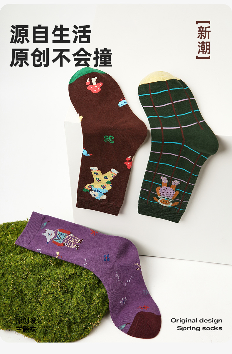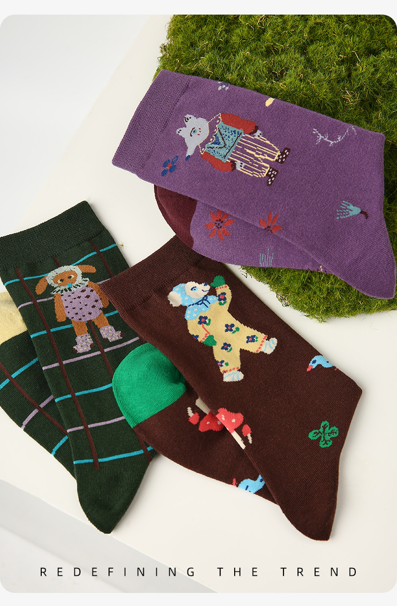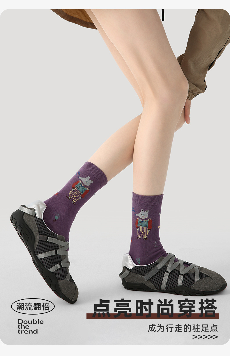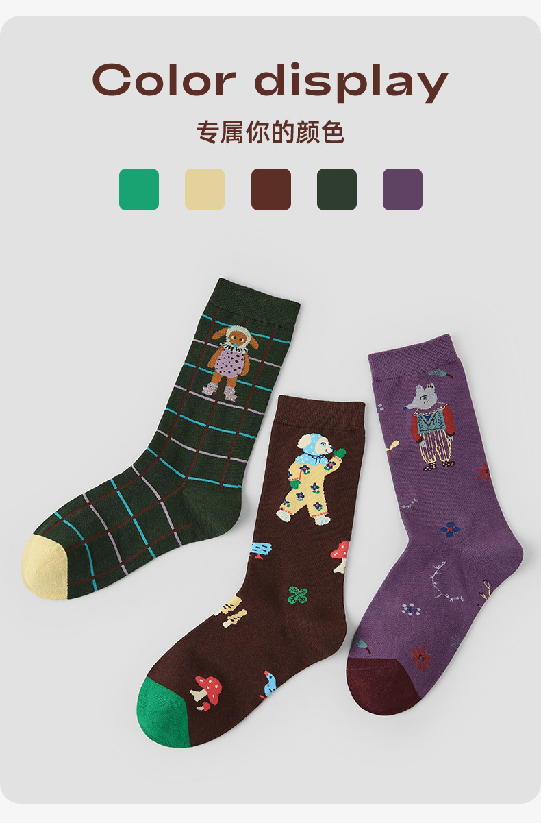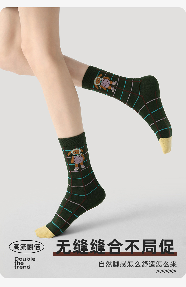 Renaissance袜子女ins潮秋冬新款精梳棉卡通动物条纹无骨中筒女袜