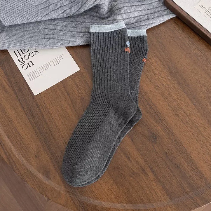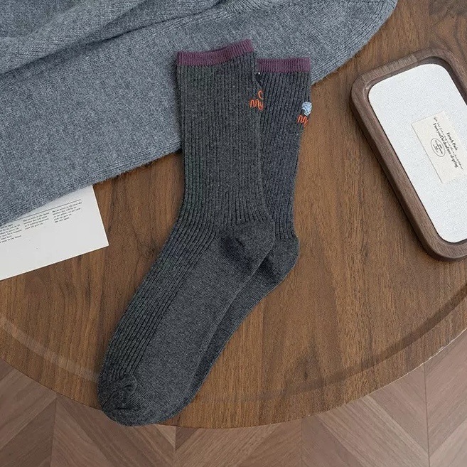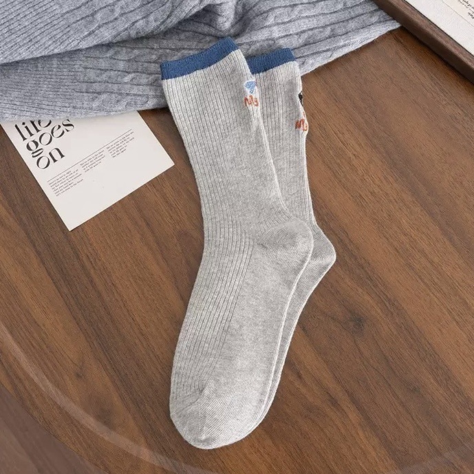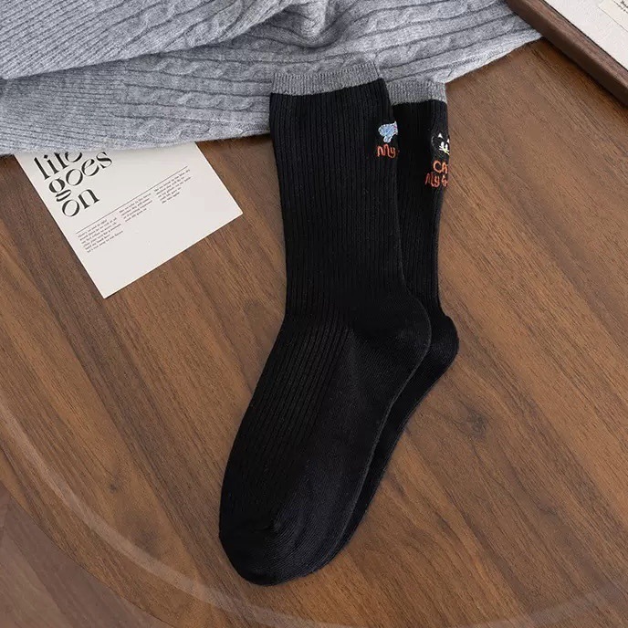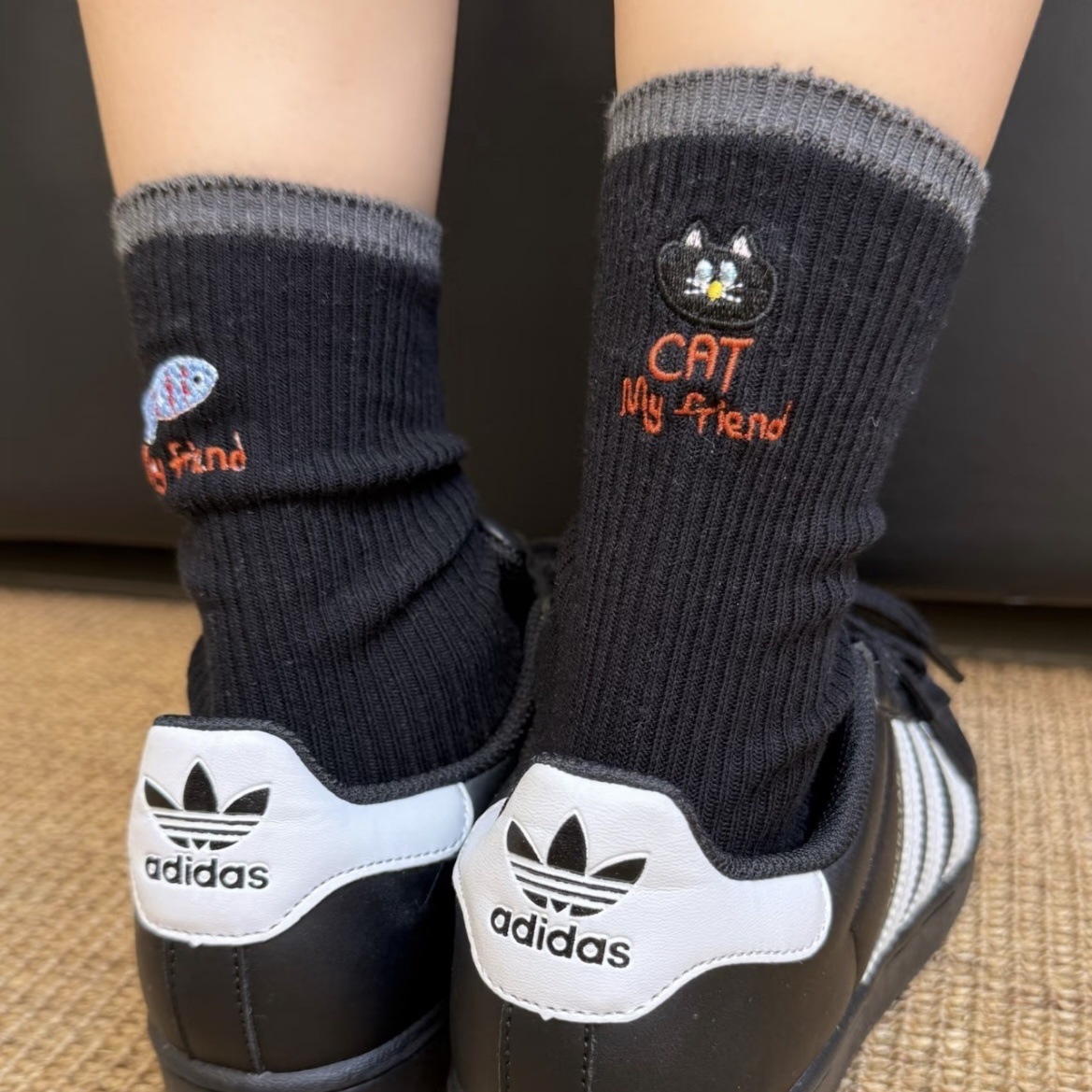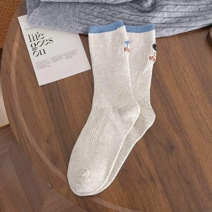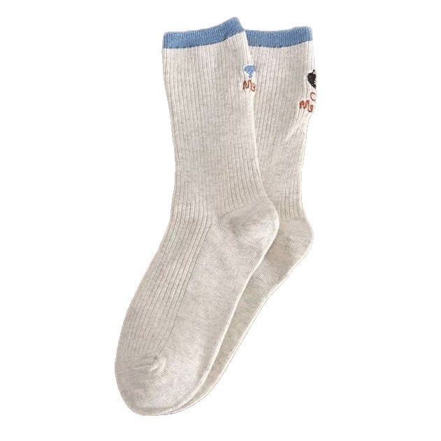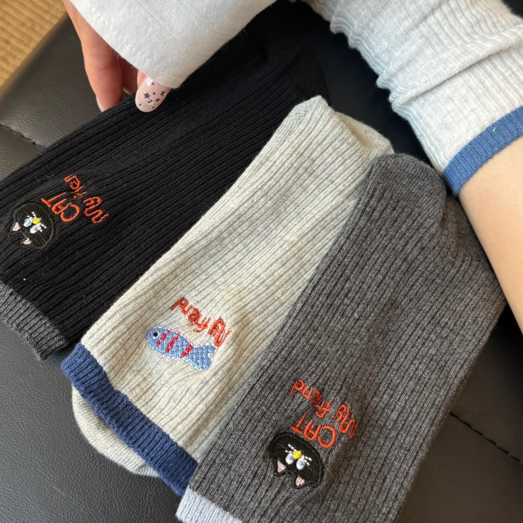 日系可爱袜子女中筒小猫吃鱼刺绣卡通堆堆袜灰色系长袜纯棉女袜潮