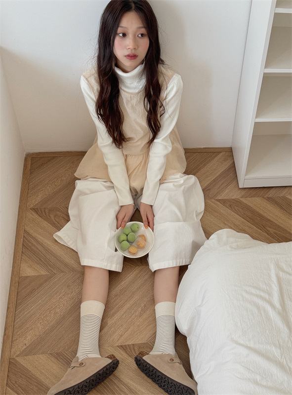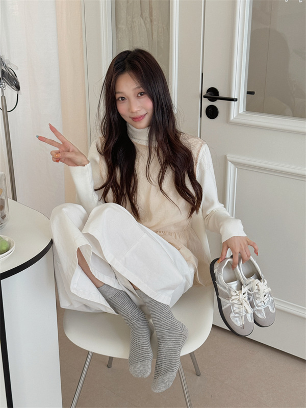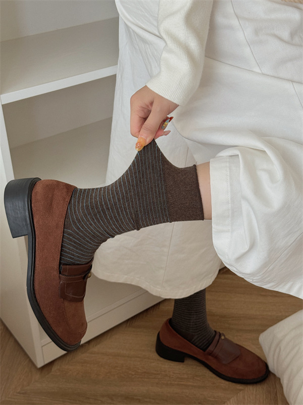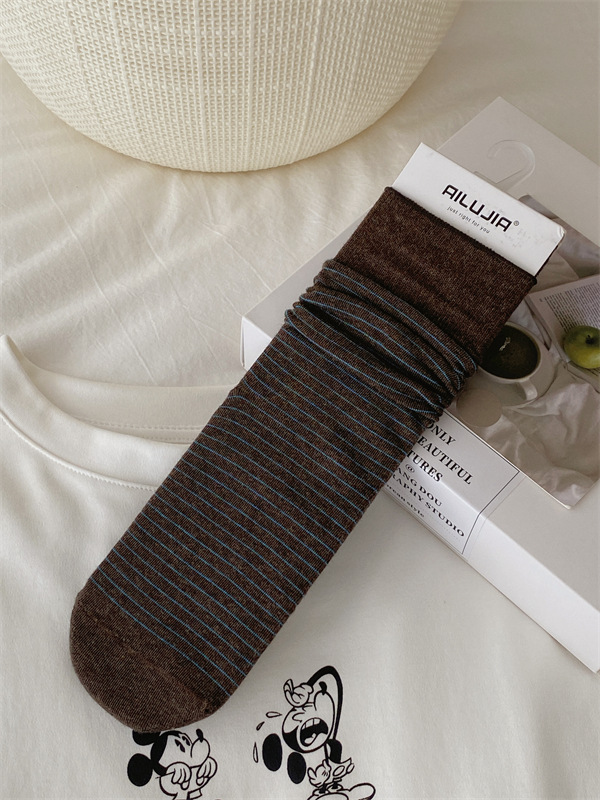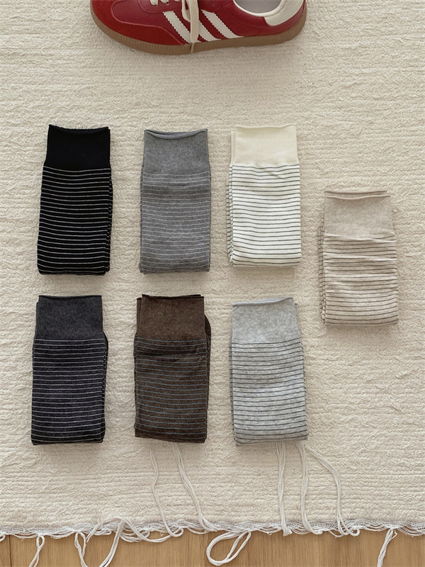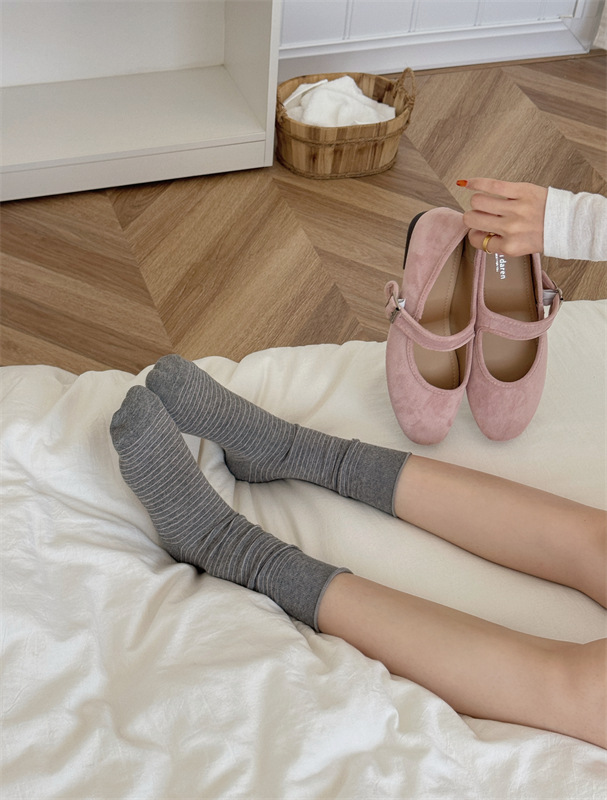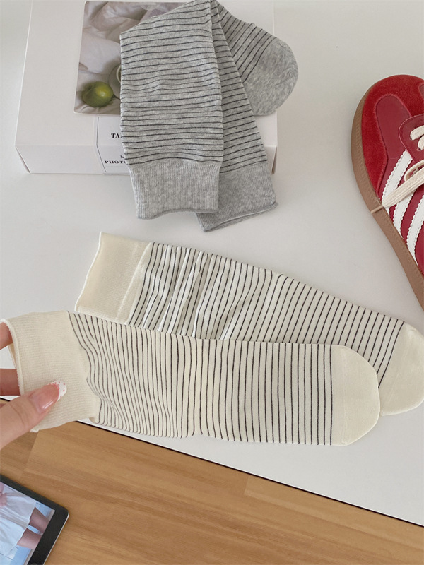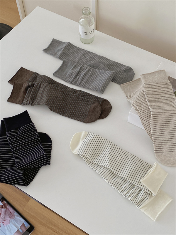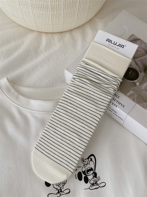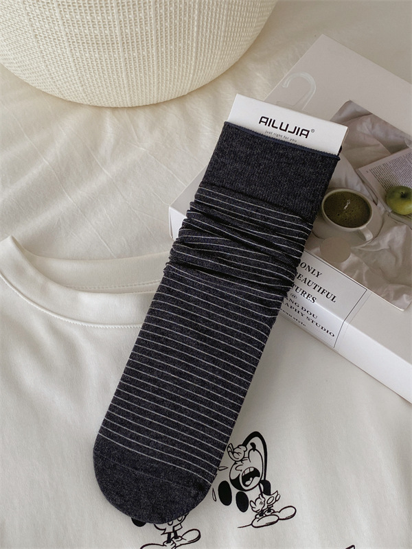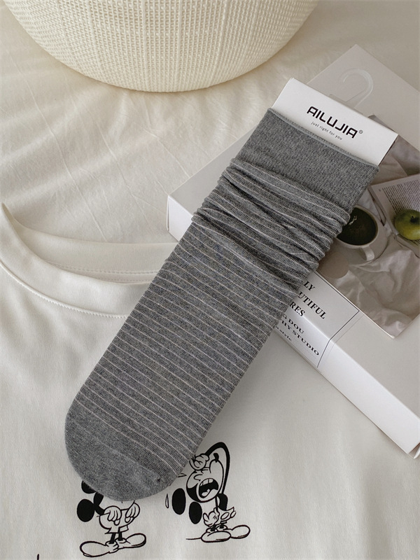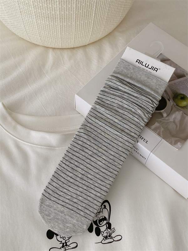 无骨精澳棉秋季韩系卷边条纹灰色堆堆袜柔软百搭中筒袜ins细条纹